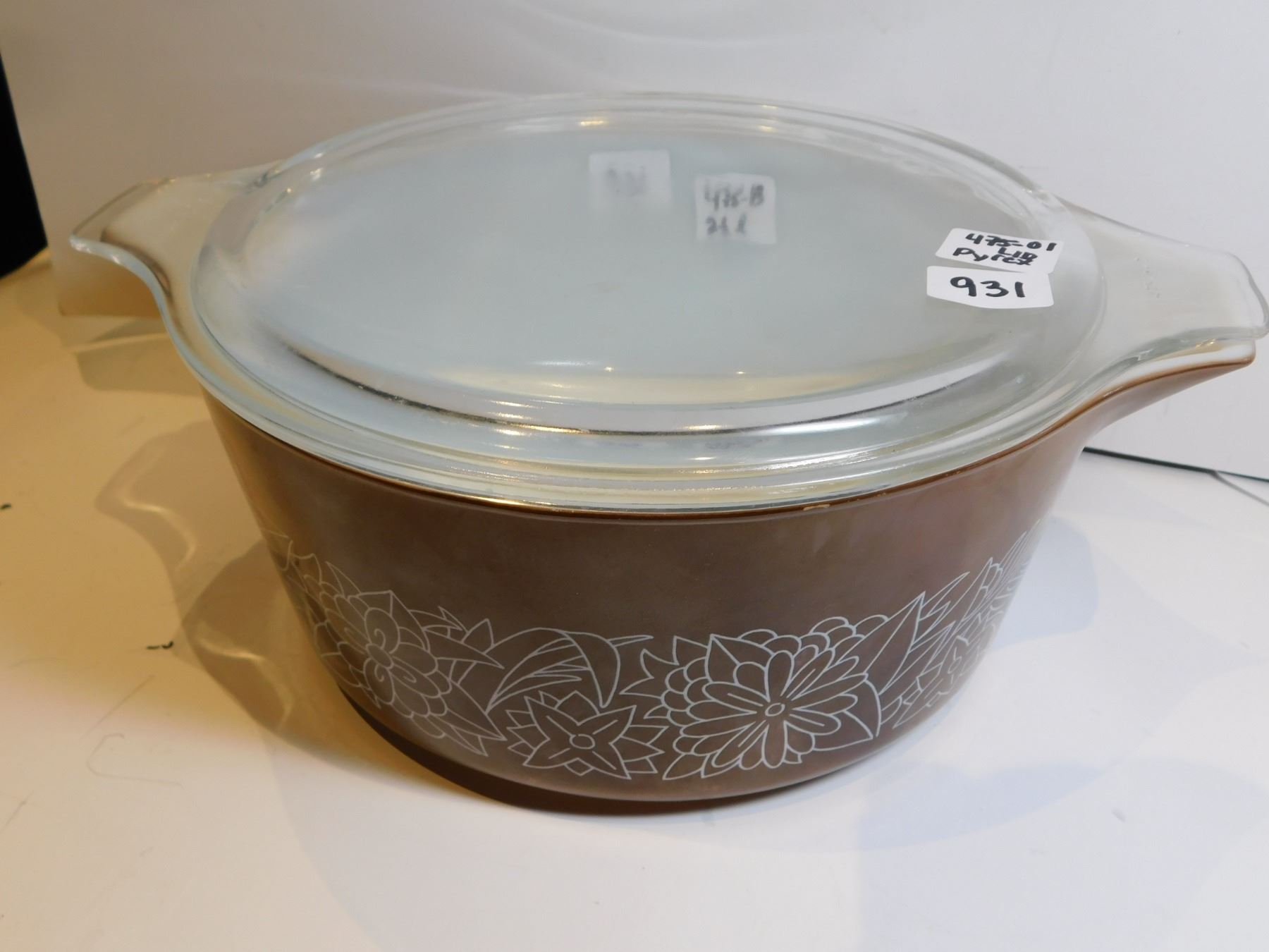 475B 2 ½ L, PYREX CASSEROLE DISH, WOODLAND BROWN WITH LID, EXC CONDITION