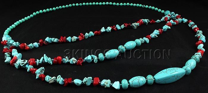 476.50CTW CHUNKY TURQUOISE W/ RED CORAL NECKLACE **|**|** 34 INCHES FASHION 3 ROW DESIGN CHUNKY TURQUOISE & RED CORAL NECKLACE ; MSRP: $300