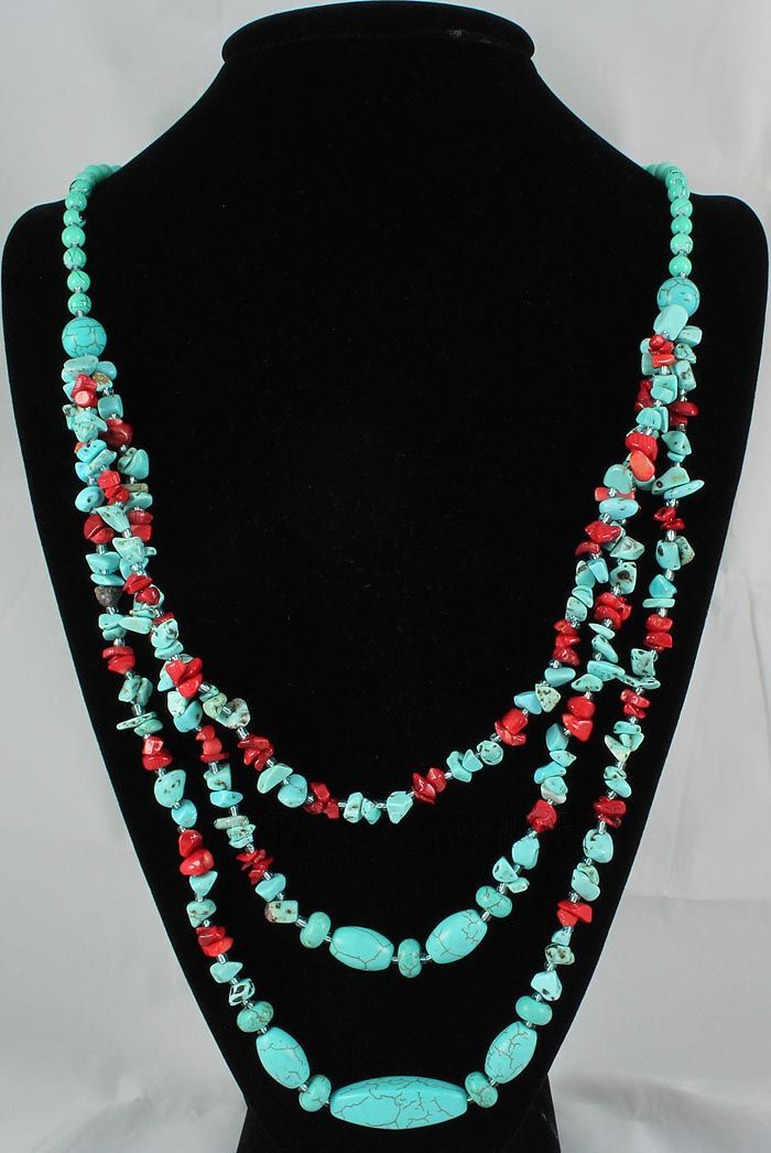 34 INCHES FASHION 3 ROW DESIGN CHUNKY TURQUOISE & RED CORAL NECKLACE