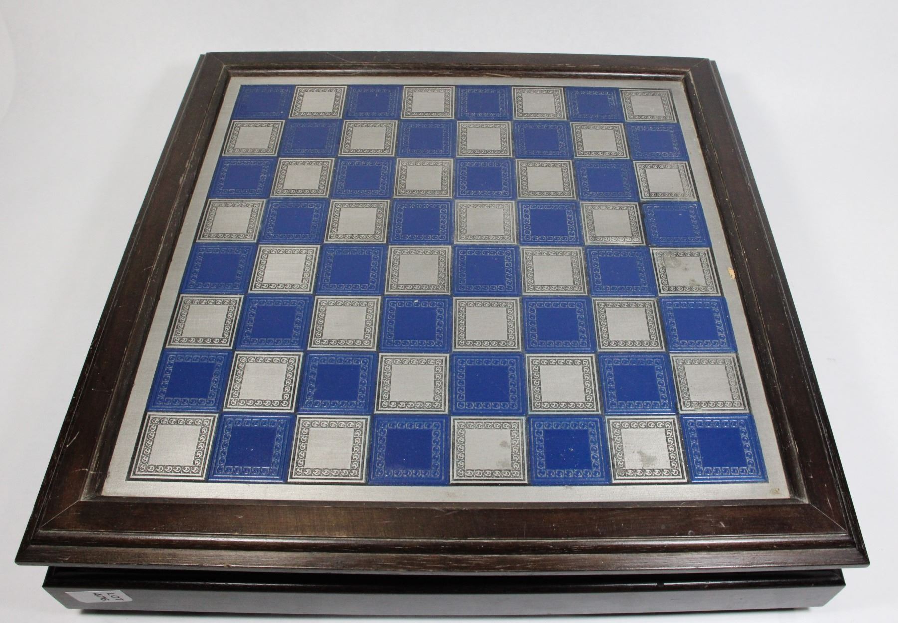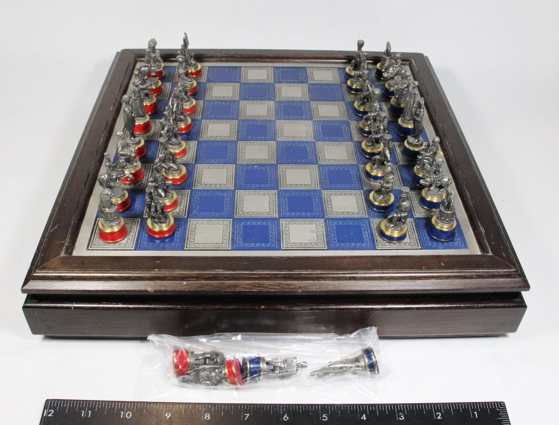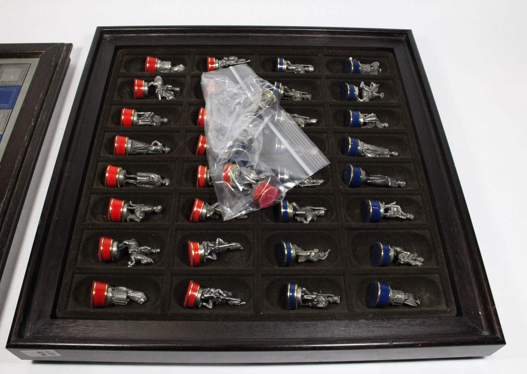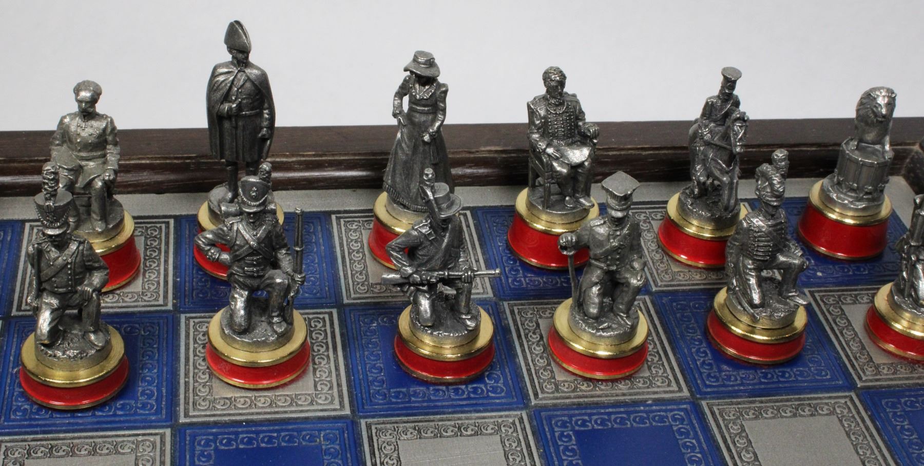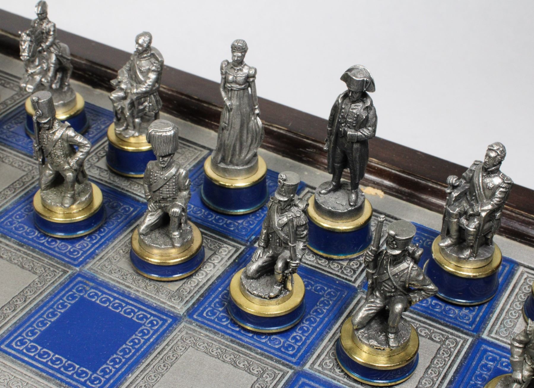 PEWTER FIGURES COMPLETE WITH CHESS BOARD / STORAGE BOX, MEASURES 13.5 X 13.5 INCHES IN SIZE NAPOLEONIC 1980'S NAPOLEON BONAPARTE DUKE OF WELLINGTON. INCLUDES 4 ADDITIONAL PIECES