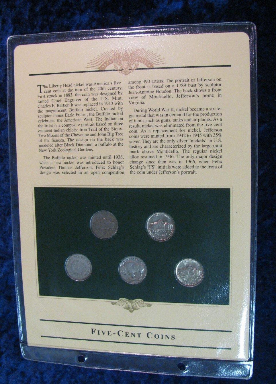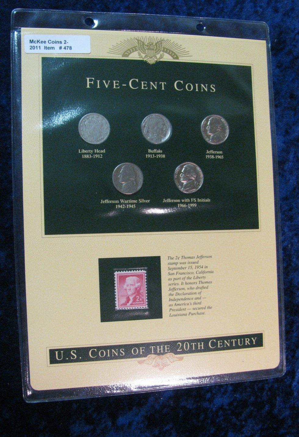 478. Postal History Type Set of U.S. Nickels in a special display page with a mint 2c Jefferson stamp.