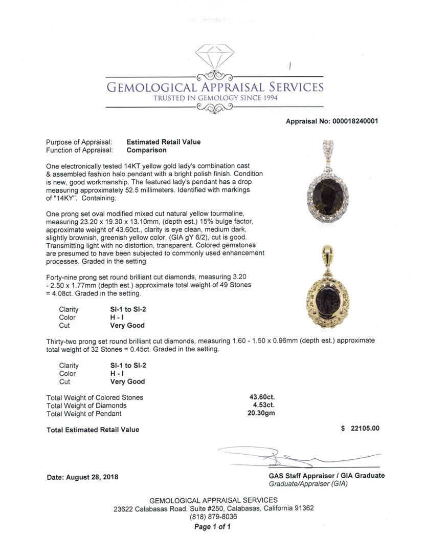 One electronically tested 14KT yellow gold lady's combination cast & assembled fashion halo pendant with a bright polish finish. The featured lady's pendant has a drop measuring approximately 52.5 millimeters. Identified with markings of '14KY'. Condition is new, good workmanship. Containing: One prong set oval modified mixed cut natural yellow tourmaline, measuring 23.20 x 19.30 x 13.10mm, (depth est.) 15%. bulge factor, approximate weight of 43.60ct., clarity is eye clean, medium dark, slightly brownish, greenish yellow color, (GIA gY 6/2), cut is good. Transmitting light with no distortion, transparent. Colored gemstones are presumed to have been subjected to commonly used enhancement processes. Graded in the setting. Forty-Nine prong set round brilliant cut diamonds, measuring 3.20 - 2.50 x 1.77mm (depth est.) approximate total weight of 49 Stones = 4.08ct. Graded in the setting. Color H - I Clarity SI-1 to SI-2 Cut Very Good Thirty-Two prong set round brilliant cut diamonds, measuring 1.60 - 1.50 x 0.96mm (depth est.) approximate total weight of 32 Stones = 0.45ct. Graded in the setting. Color H - I Clarity SI-1 to SI-2 Cut Very Good. Total Weight of Colored Stones 43.60ct.. Total Weight of Diamonds 4.53ct.. Total Weight of Pendant 20.30gm GAS Appraised at $22105.00. GAS Appraised.