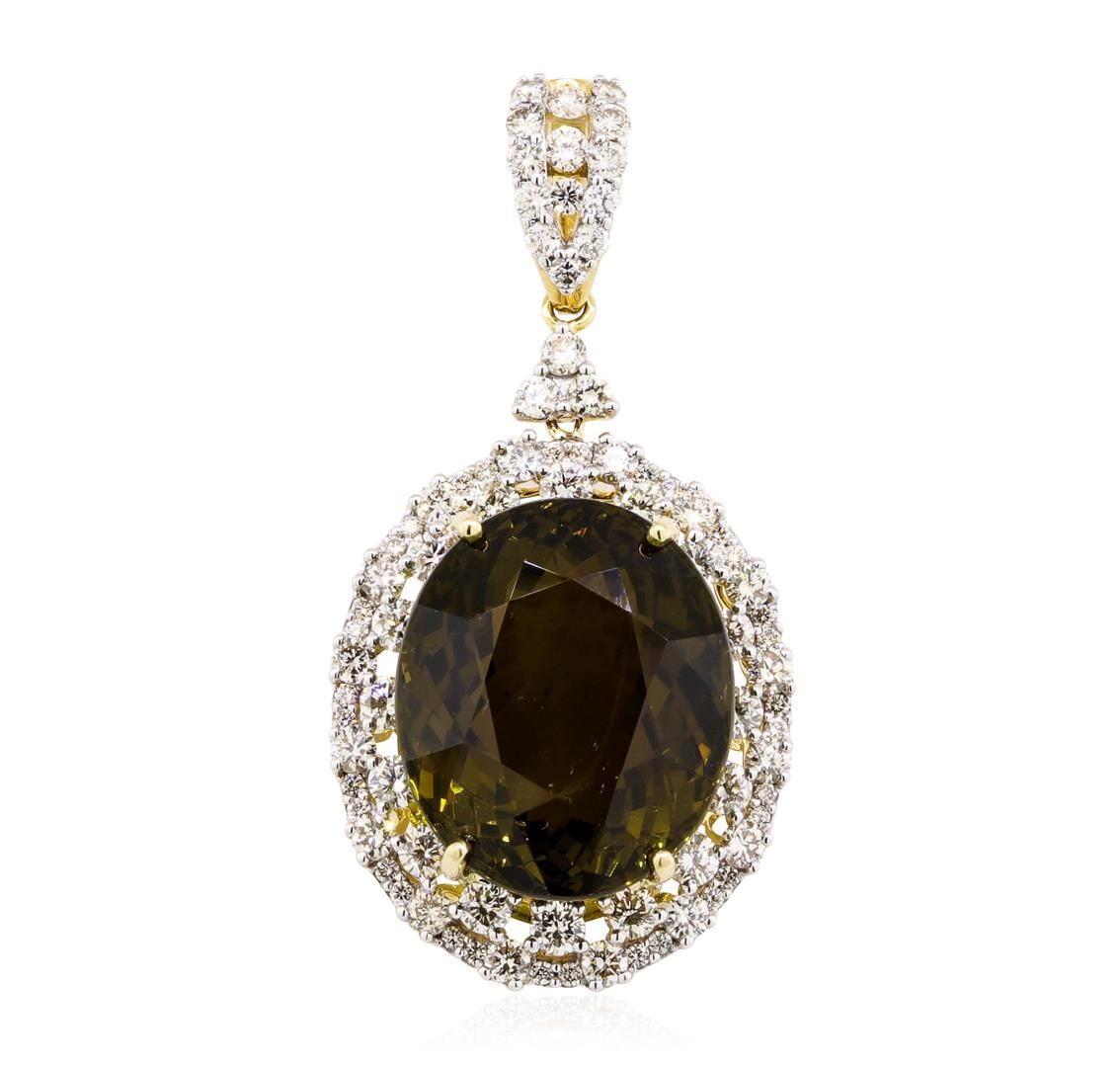 One electronically tested 14KT yellow gold lady's combination cast & assembled fashion halo pendant with a bright polish finish. The featured lady's pendant has a drop measuring approximately 52.5 millimeters. Identified with markings of '14KY'. Condition is new, good workmanship. Containing: One prong set oval modified mixed cut natural yellow tourmaline, measuring 23.20 x 19.30 x 13.10mm, (depth est.) 15%. bulge factor, approximate weight of 43.60ct., clarity is eye clean, medium dark, slightly brownish, greenish yellow color, (GIA gY 6/2), cut is good. Transmitting light with no distortion, transparent. Colored gemstones are presumed to have been subjected to commonly used enhancement processes. Graded in the setting. Forty-Nine prong set round brilliant cut diamonds, measuring 3.20 - 2.50 x 1.77mm (depth est.) approximate total weight of 49 Stones = 4.08ct. Graded in the setting. Color H - I Clarity SI-1 to SI-2 Cut Very Good Thirty-Two prong set round brilliant cut diamonds, measuring 1.60 - 1.50 x 0.96mm (depth est.) approximate total weight of 32 Stones = 0.45ct. Graded in the setting. Color H - I Clarity SI-1 to SI-2 Cut Very Good. Total Weight of Colored Stones 43.60ct.. Total Weight of Diamonds 4.53ct.. Total Weight of Pendant 20.30gm GAS Appraised at $22105.00. GAS Appraised.