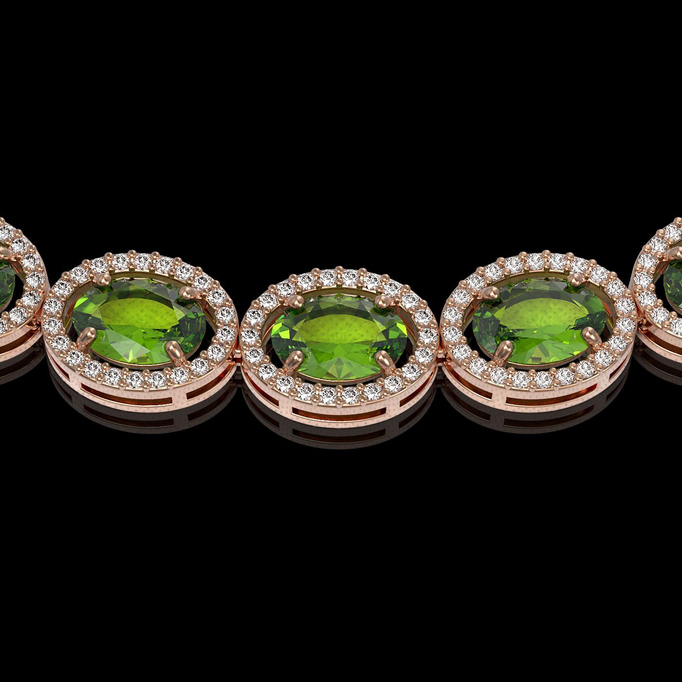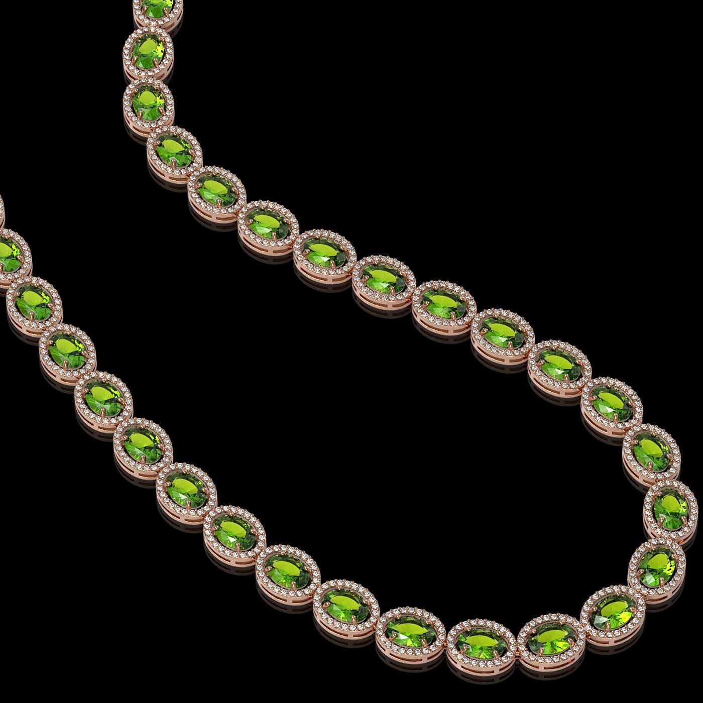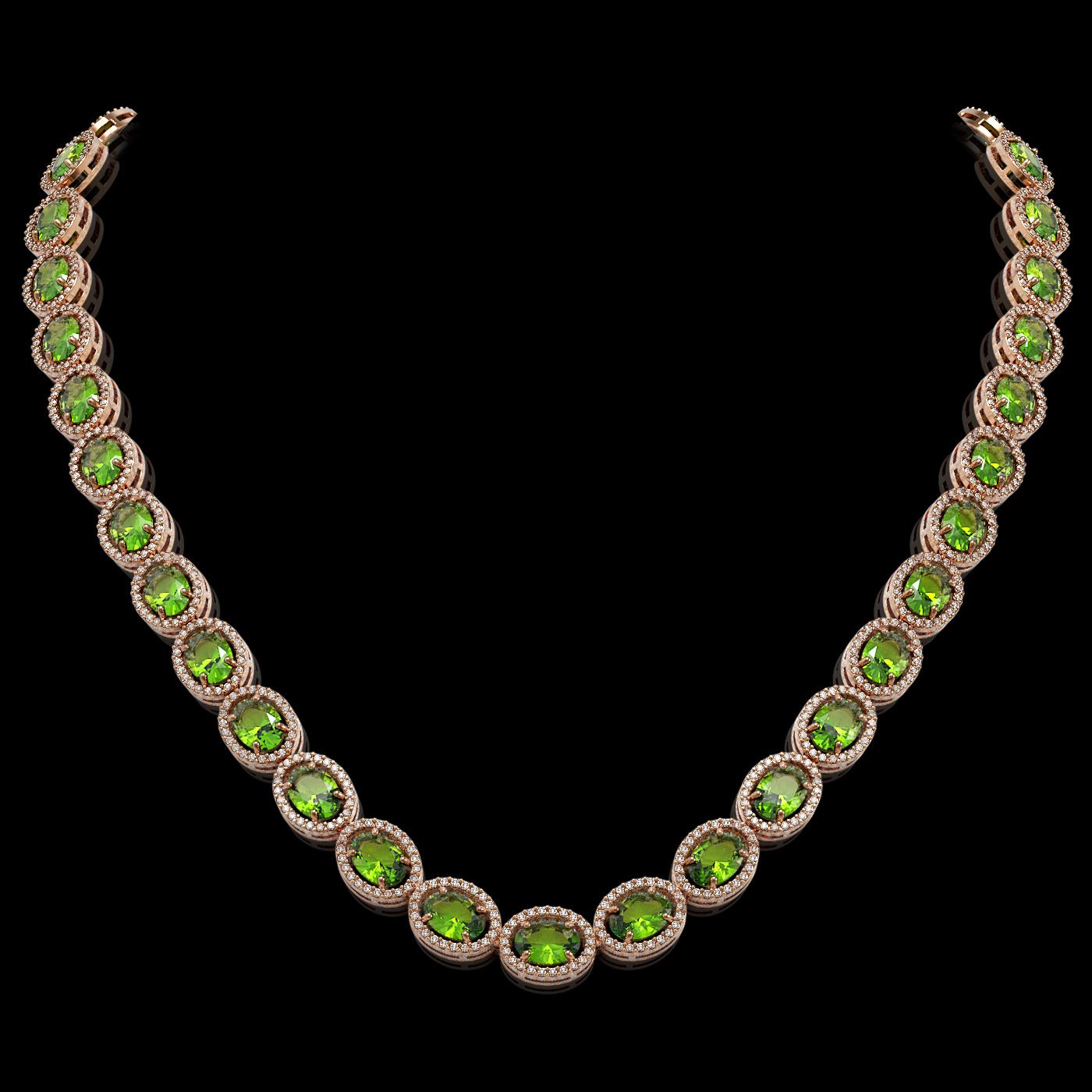 REF-756T5M -40581 ---- 48.14 CTW Peridot & Diamond Halo Necklace 10K Rose Gold ---- Luxury Designer Brand Necklace Appraised at $41,600 Certificate Number US40581 10k Rose gold, Necklace Size is 16 Inches, Necklace measuring approx. 9 mm x 16 Inches, weighing in total approx. 30 grams. Made in the USA and is stamped 10k, Main stone 41.11 carat total weight containing 39 pieces of Intense Green color with AAA quality Oval shape cut Peridot , Stone #2 7.03 carat total weight containing 858 pieces of G-H color with VS/SI quality Round shape cut Diamond