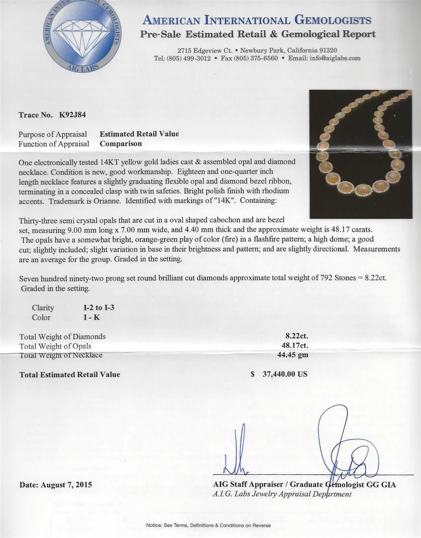 One electronically tested 14KT yellow gold ladies cast & assembled opal and diamond necklace. Condition is new, good workmanship. Eighteen and one-quarter inch length necklace features a slightly graduating flexible opal and diamond bezel ribbon, terminating in a concealed clasp with twin safeties. Bright polish finish with rhodium accents. Trademark is Orianne. Identified with markings of "14K". Containing: Thirty-three semi crystal opals that are cut in a oval shaped cabochon and are bezel set, measuring 9.00 mm long x 7.00 mm wide, and 4.40 mm thick and the approximate weight is 48.17 carats. The opals have a somewhat bright, orange-green play of color (fire) in a flashfire pattern; a high dome; a good cut; slightly included; slight variation in base in their brightness and pattern; and are slightly directional. Measurements are an average for the group. Graded in the setting. Seven hundred ninety-two prong set round brilliant cut diamonds approximate total weight of 792 Stones = 8.22ct. Graded in the setting. Clarity: I-2 to I-3. Color: I - K. Total Weight of Colored Stones: 48.17ct. Total Weight of Diamonds: 8.22ct. Total Weight of Necklace: 44.45gm. AIG Appraised at $37,440.00.