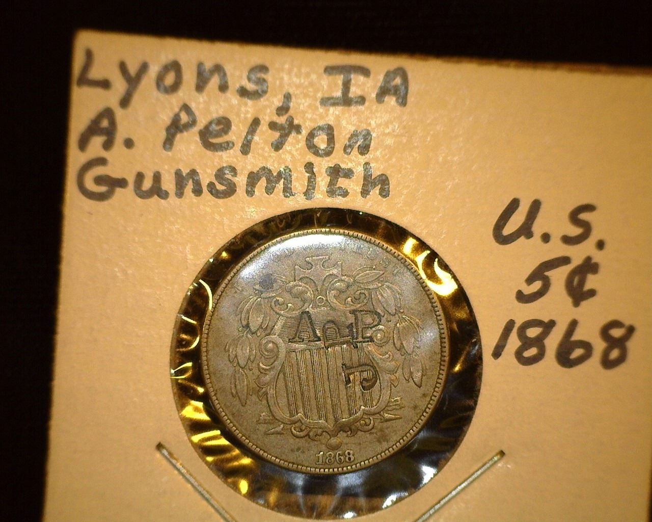 48. 1868 U.S. Shield Nickel countermarked "AP JP" at 90 degree angles to each other. This piece is illustrated in the new 'Brunk' catalog according to the holder and is attributed to "Lyons, Ia. A. Pelton Gun Smith". Reverse has an "I" countermark.