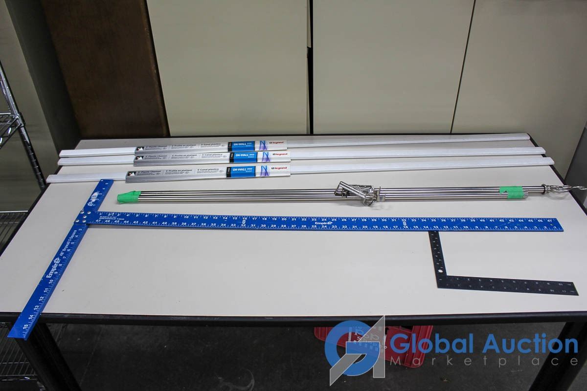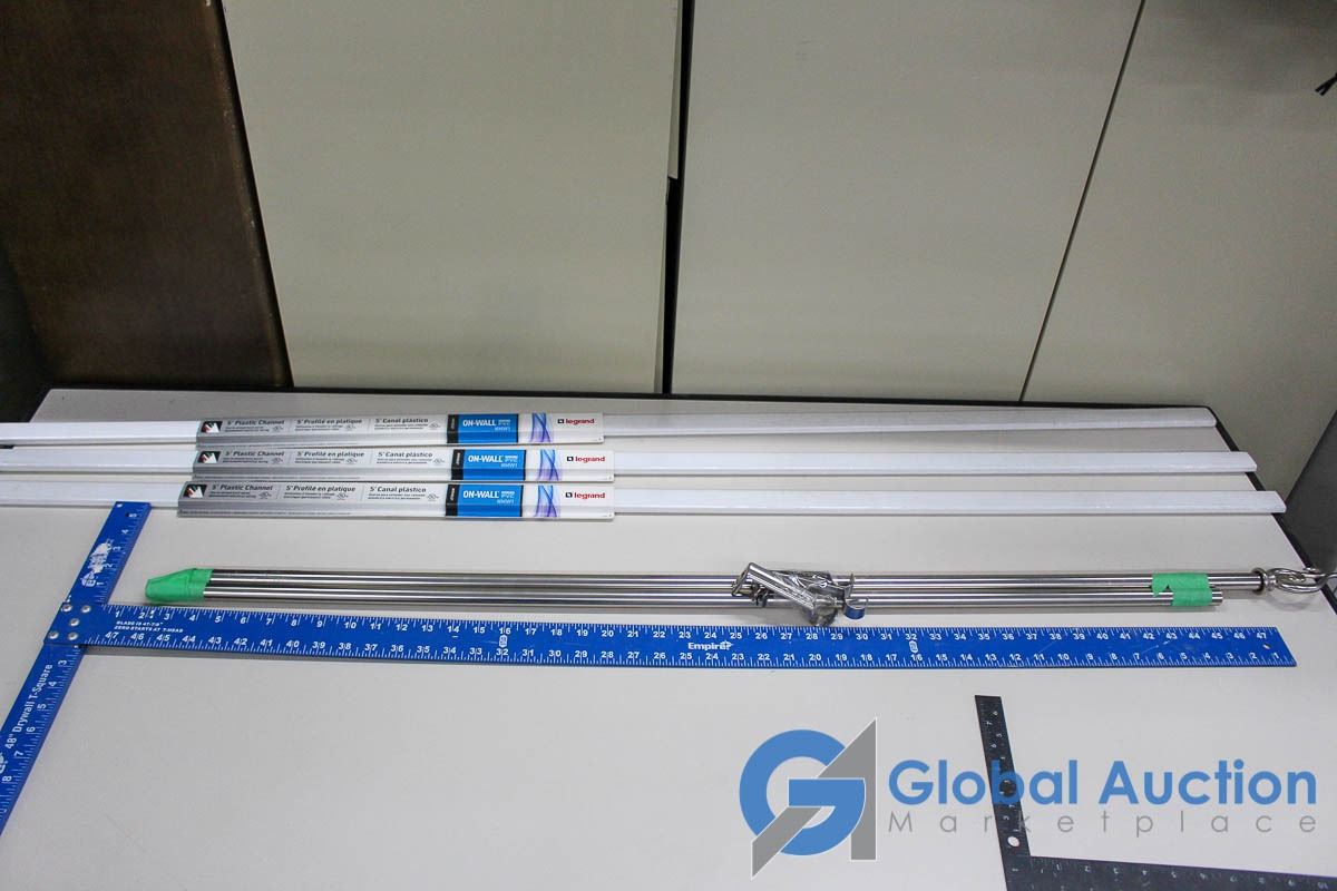 48" Drywall T Square, (3) 5' Unused Wire Channels, 90" Adjustable Width Curtain Rod