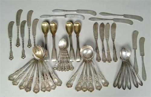 48-PIECES OF MISCELLANEOUS STERLING FLATWARE. Fifteen pieces of Durgin "Empire" including six 5-1/2in. soup spoons and nine 5-1/2in. ice cream forks, monogrammed. Six 5-1/2in. butter knives by Gorham in the "Mothers" pattern, inscribed. Four 5-1/4in. butter knives by Reed and Barton in the "Lamarquise" pattern, monogrammed. Five 5in. butter knives by Whiting in the "Imperial Queen" pattern, no monogram. Eight 4in. demitasse spoons by Whiting in the "Imperial Queen" pattern, no monogram. Six 5in. ice cream forks. Four English 5in. spoons. WEIGHT: 16.7 tr. oz. CONDITION: Generally very good. 9-98183-37