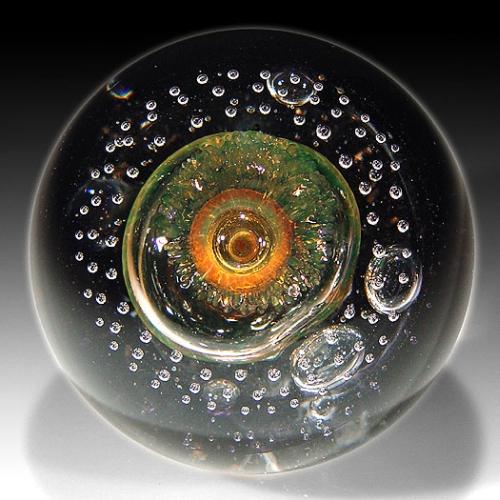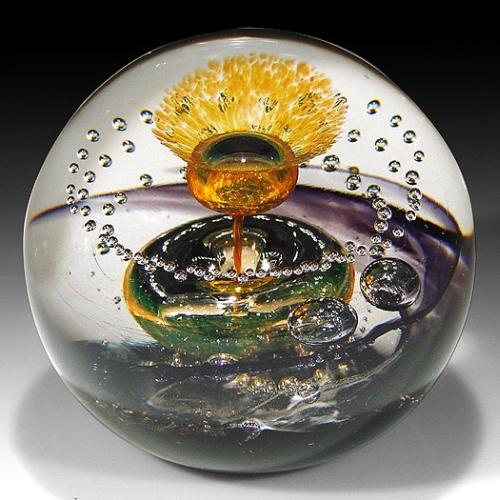 Selkirk Glass 1999 "Goldstar" abstract design paperweight, with a central, upright, golden, flower-shaped, bubble form, on a long stem, which is encircled by a large air ring. The design is punctuated with several spaced bubbles, in assorted sizes, floating above the swirling black ground. Signed/dated. Edition #308 of a limited edition of 500. Diameter 3 1/2". Includes collector certificate. NO RESERVE