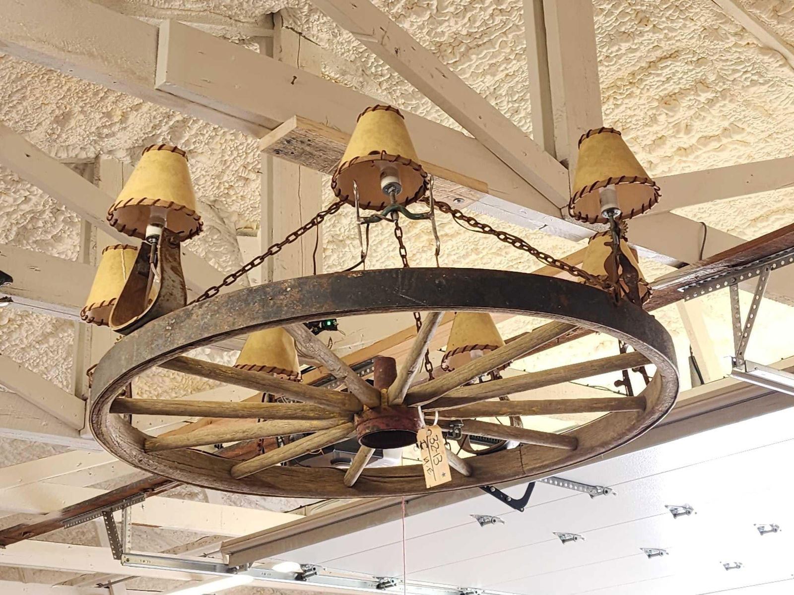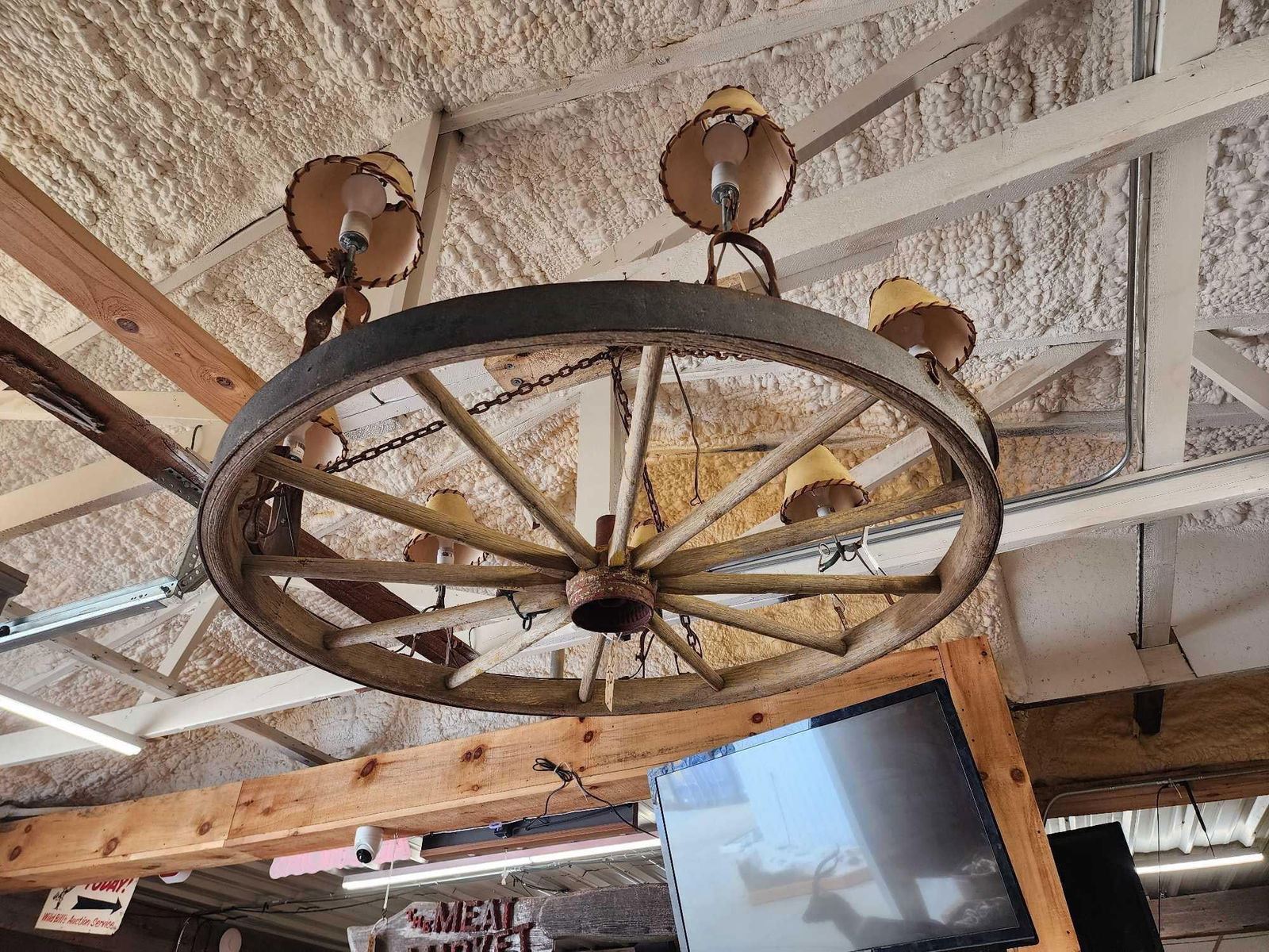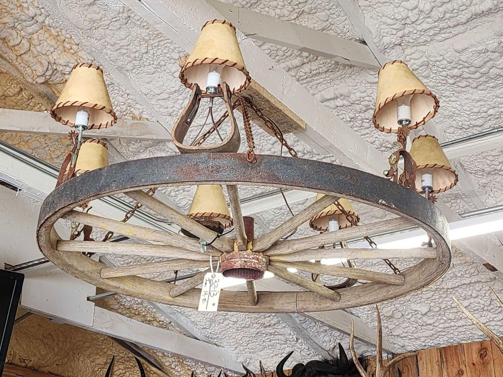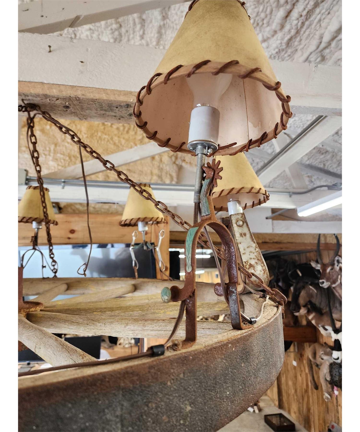 32.13 Great Western decor piece antique wooden wagon wheel with 7 light fixtures made with spurs horse bridle bits stirrups the chandelier itself is about 20" tall with the shades on