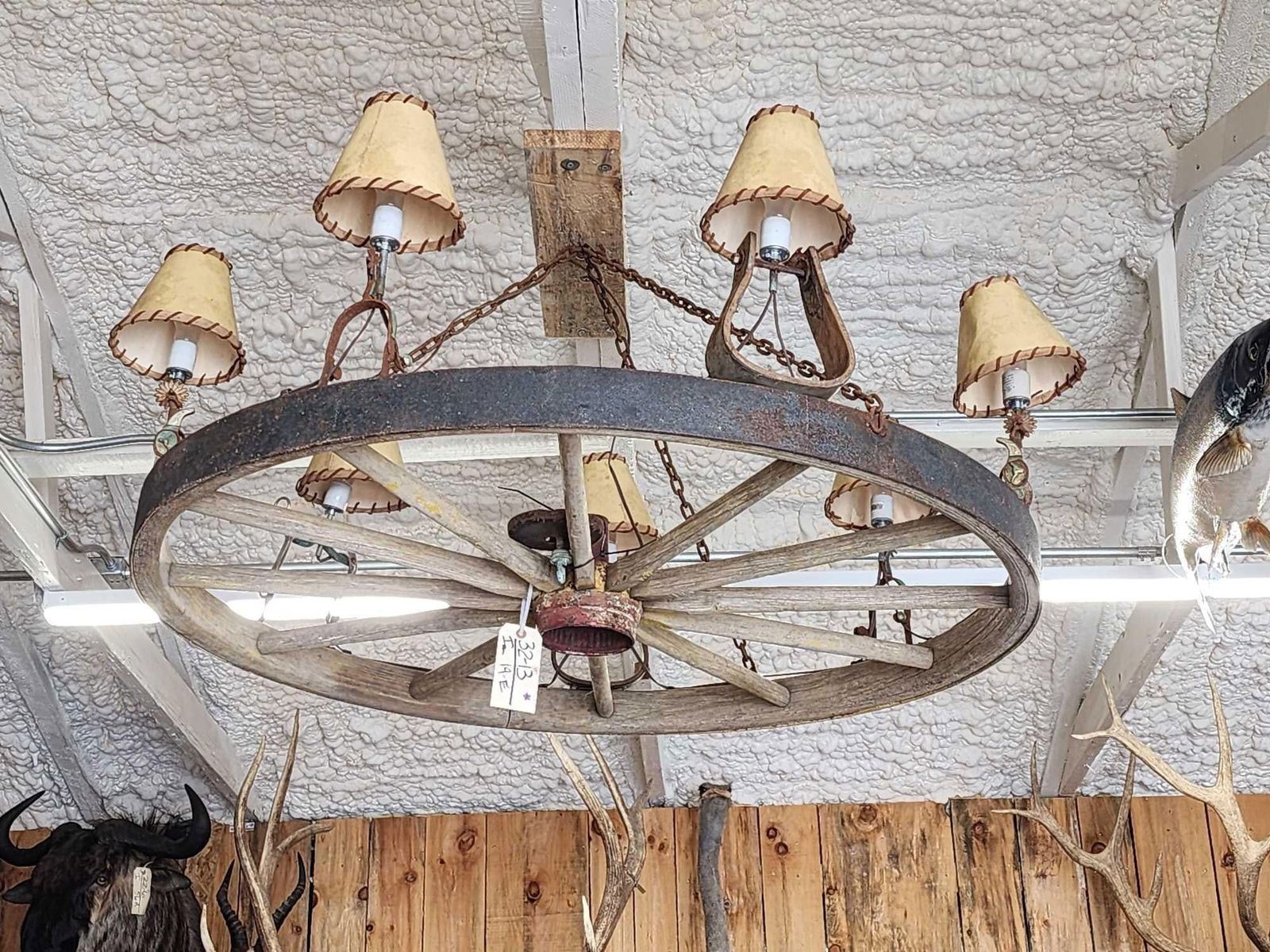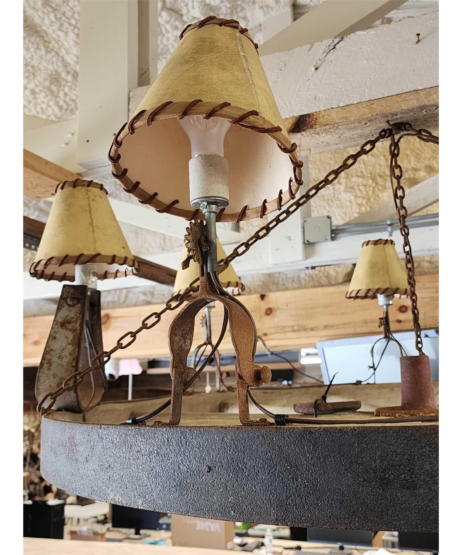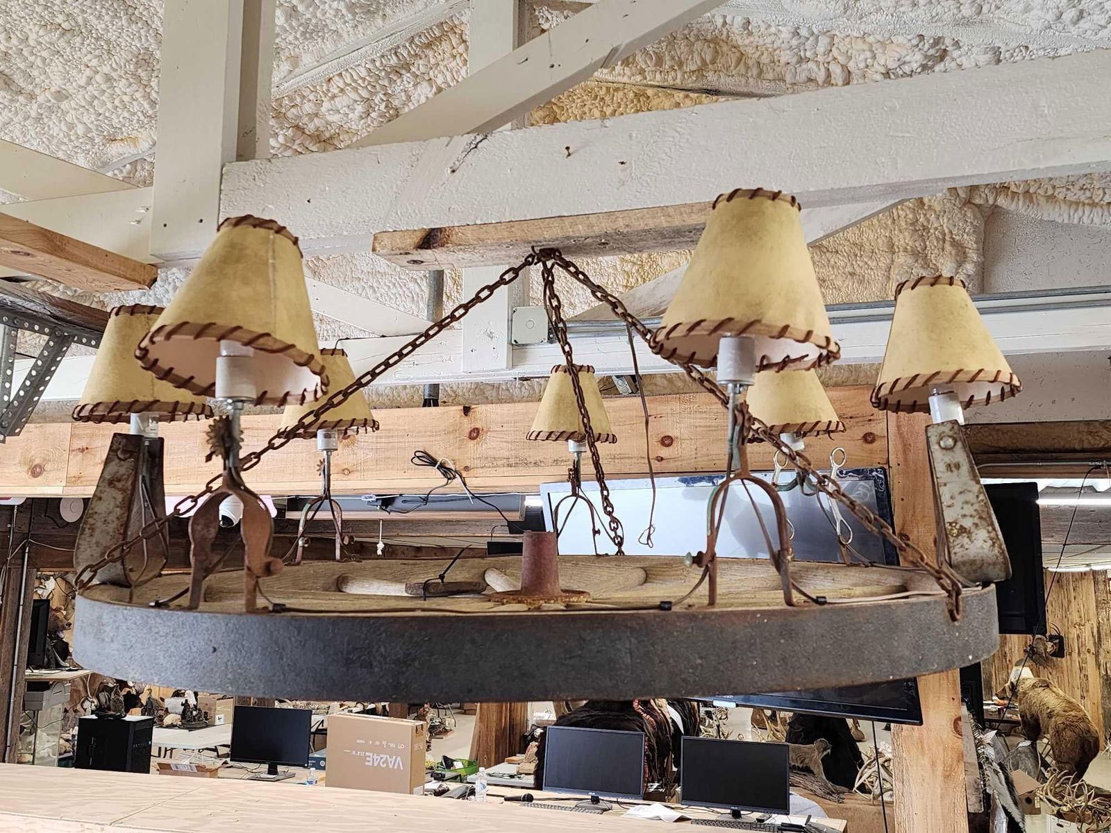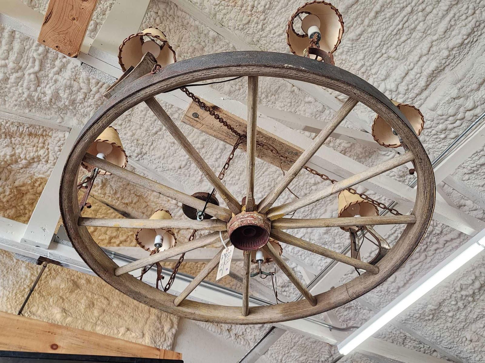 32.13 Great Western decor piece antique wooden wagon wheel with 7 light fixtures made with spurs horse bridle bits stirrups the chandelier itself is about 20" tall with the shades on