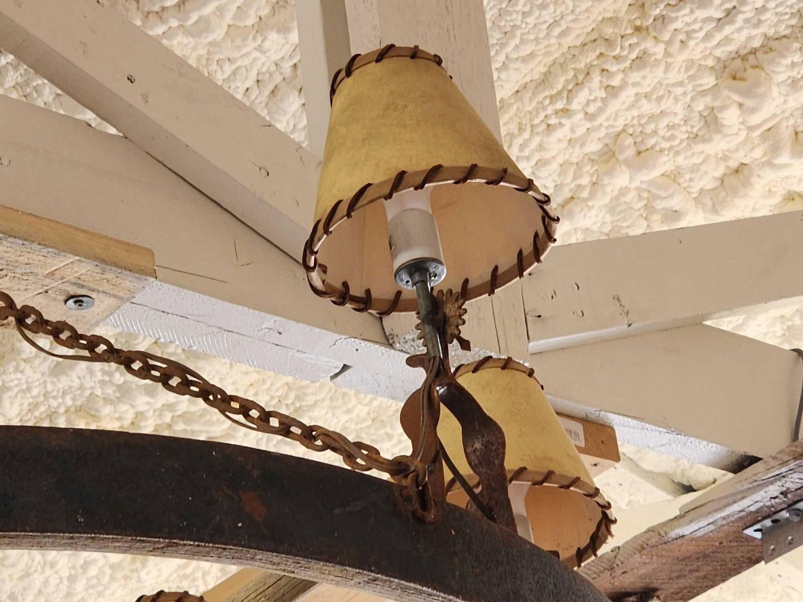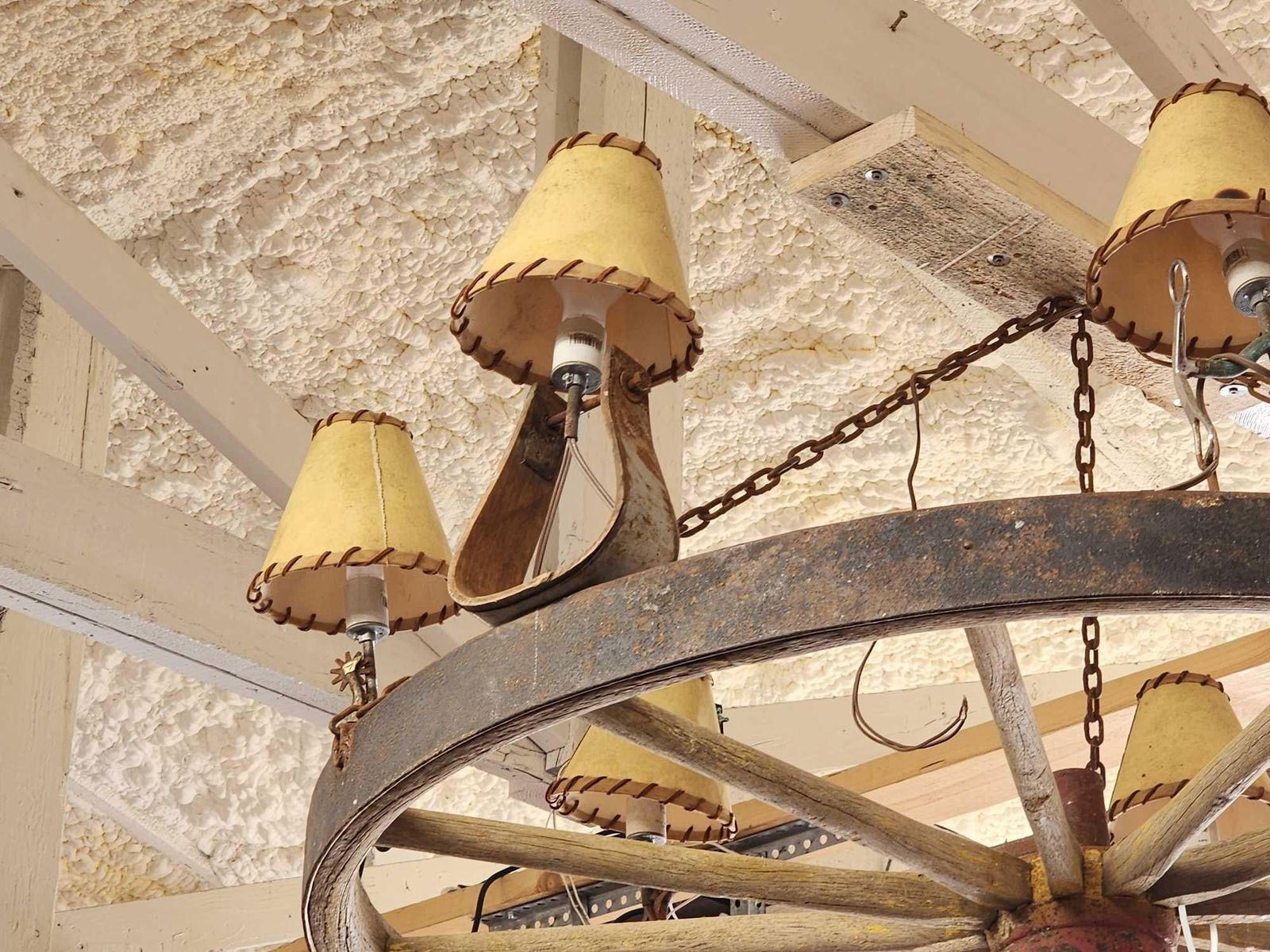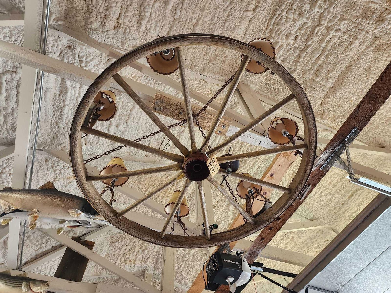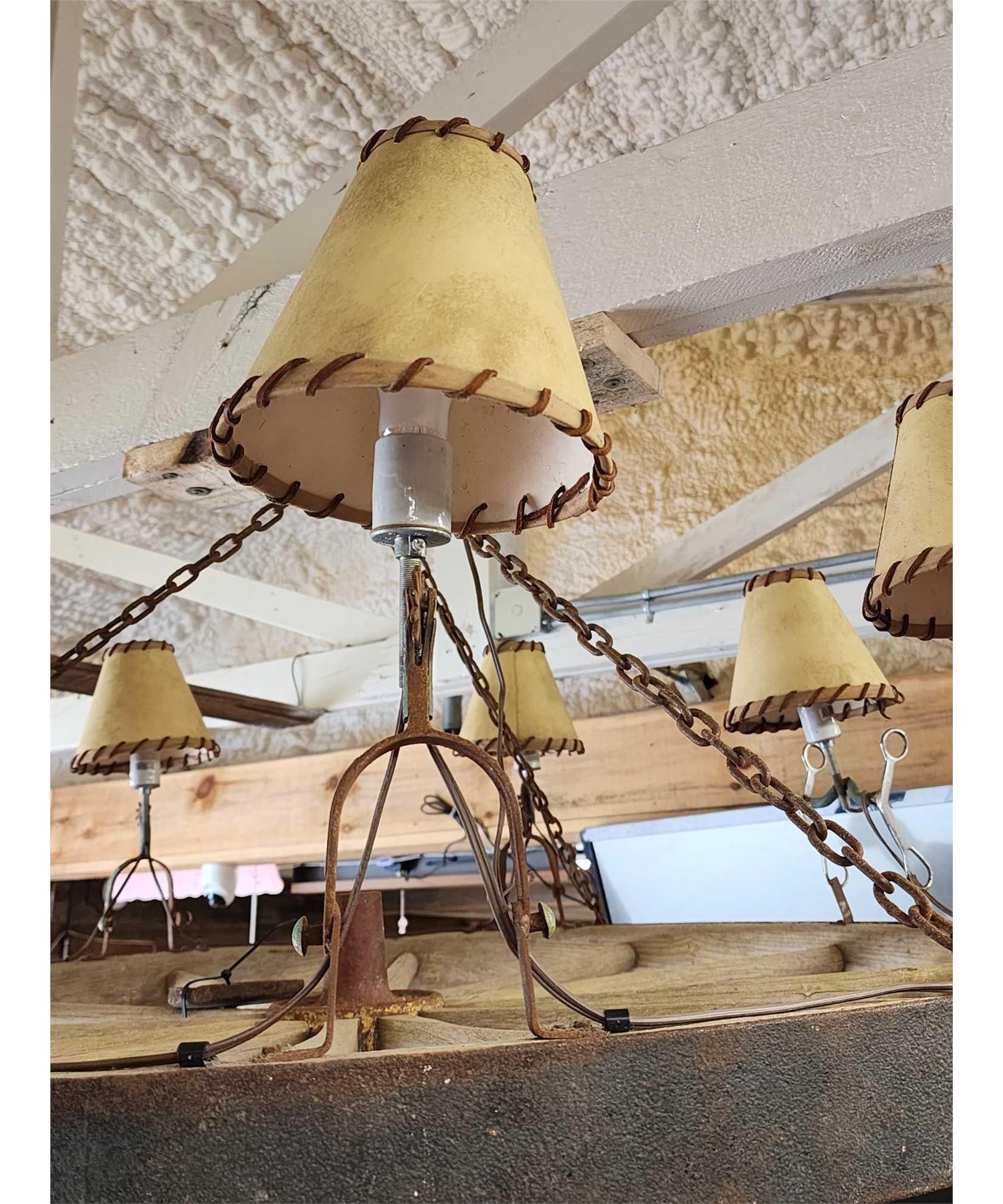32.13 Great Western decor piece antique wooden wagon wheel with 7 light fixtures made with spurs horse bridle bits stirrups the chandelier itself is about 20" tall with the shades on