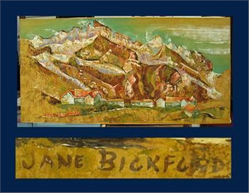 48" x 24" canvas of mountains. Signed by the artist "Jane Bickford"