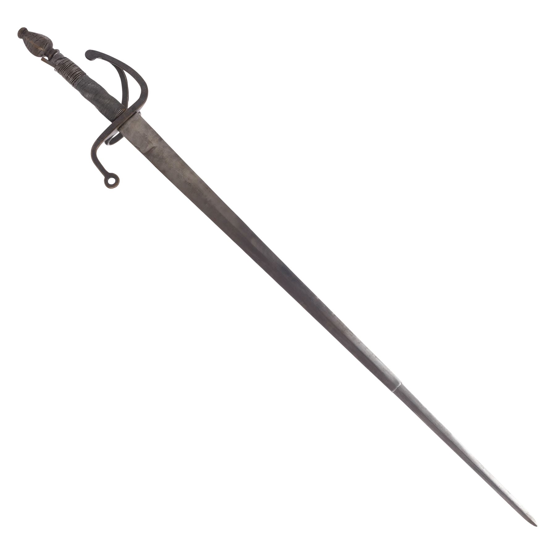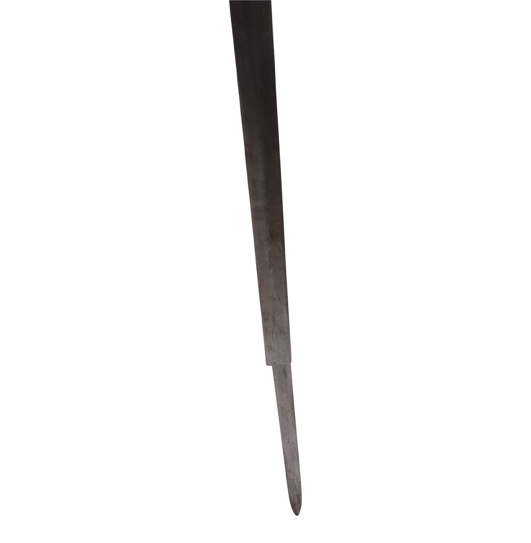 This metal sword features a late-15th century style hand guard; a wire-wrapped grip; a pommel with decorative patterns on it; and a SFX mechanism in the blade meant to allow the tip of the blade to retract into the main body of the blade, producing a stabbing effect. The sword exhibits scuffing and discoloration from use and age, as well as the wire wrapping coming loose. Dimensions: 43.5" x 6.5" x 3" (110.5 cm x 16.75 cm x 7.75 cm)