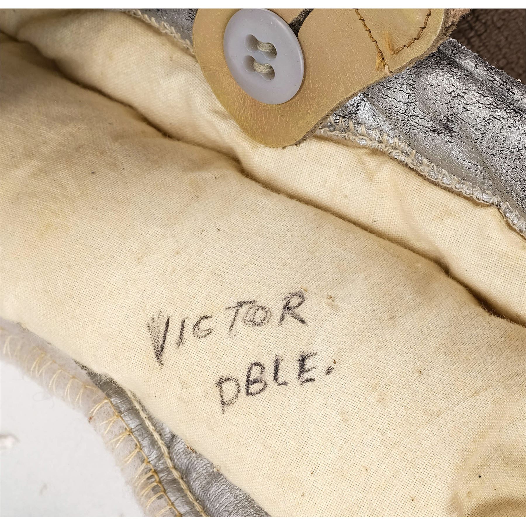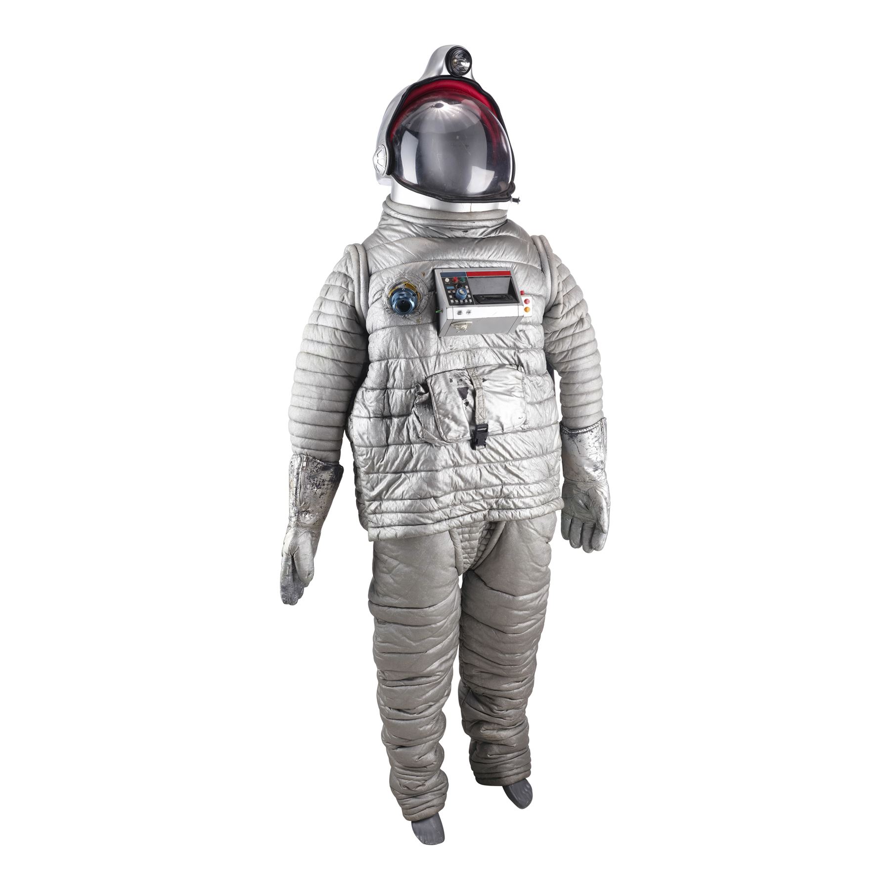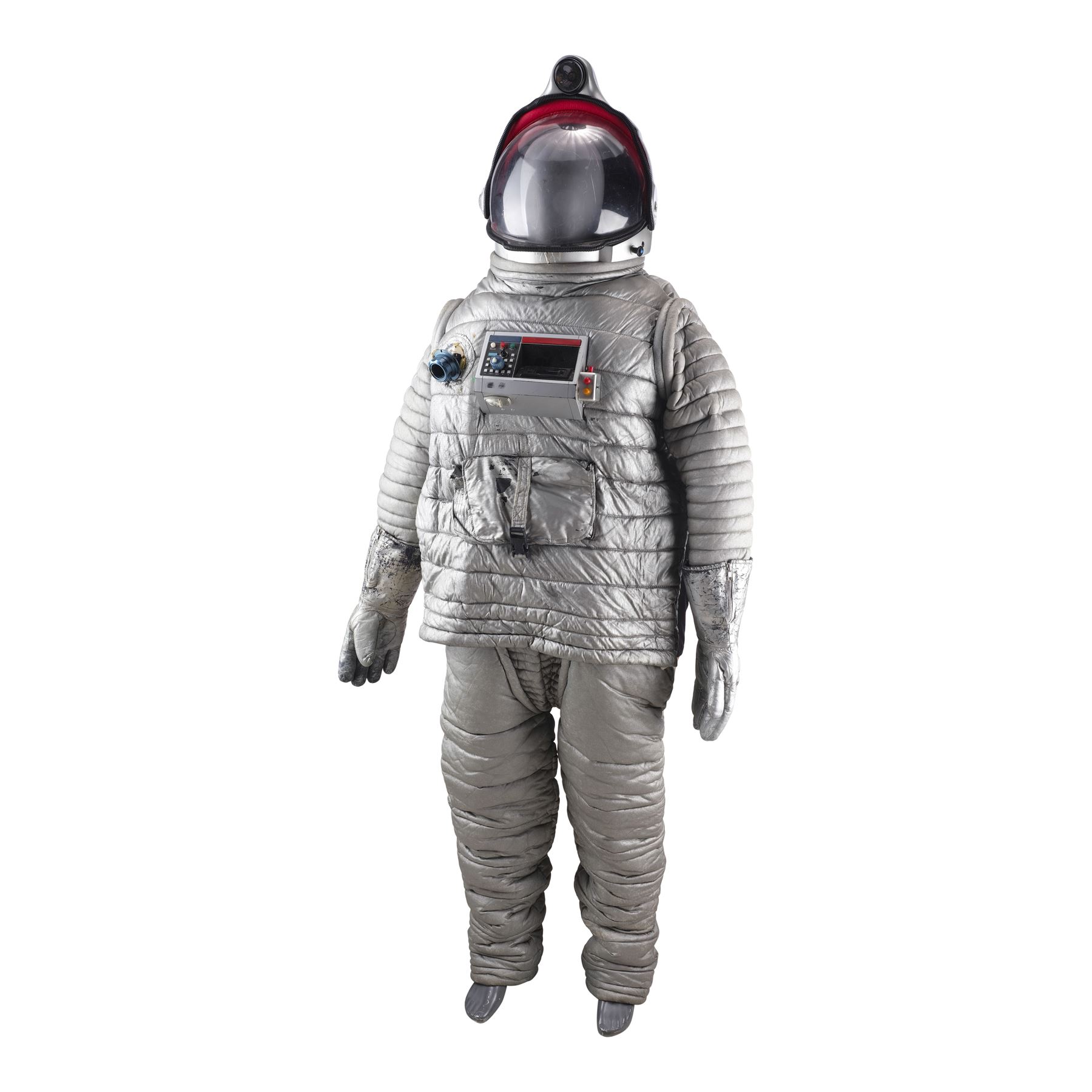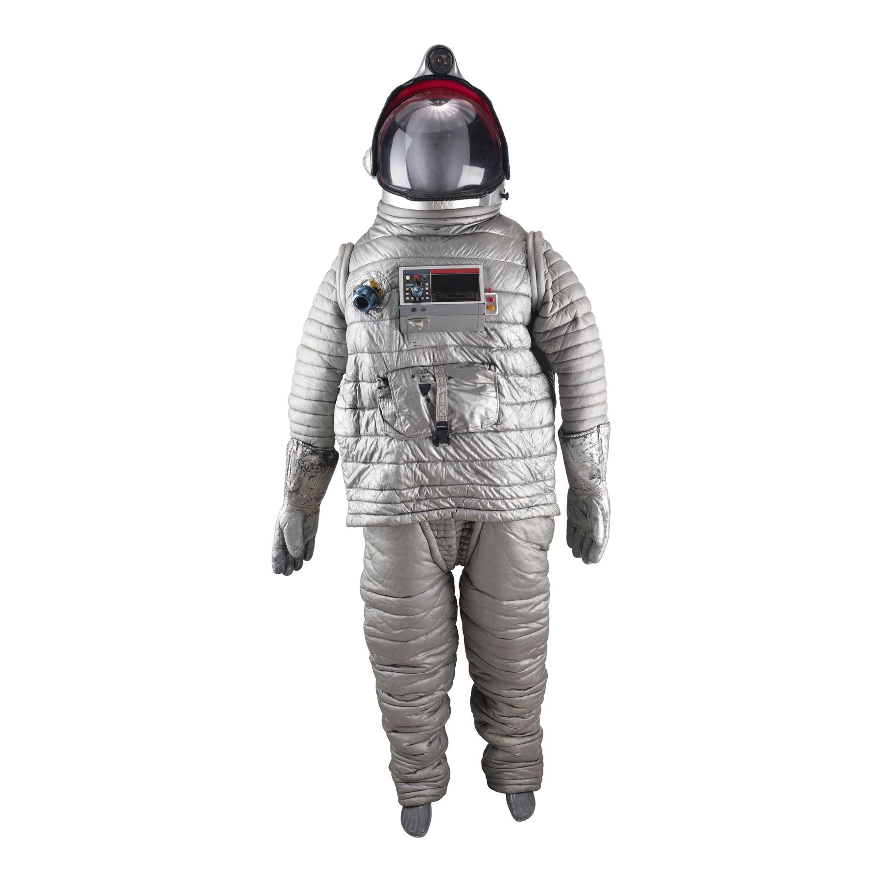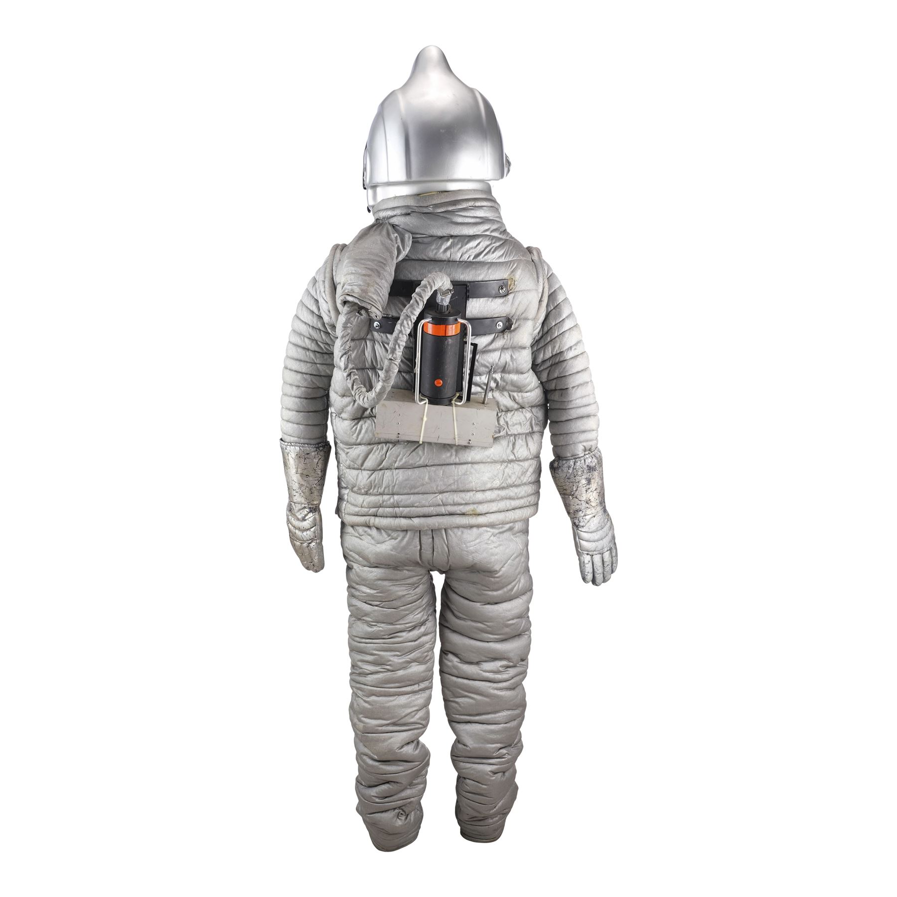 The spacesuit is made of a gray padded polyester jacket with a metal collar marked "VICTOR S"; matching gray padded polyester trousers equipped with green elastic suspenders; features a painted resin and metal chest box with a blue painted metal connector; and gray padded polyester gloves. This lot exhibits flaking material on the costume's exterior, as well as notable loss of adhesion on the jacket's connector piece.