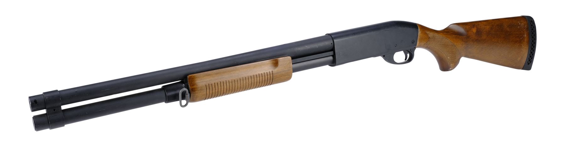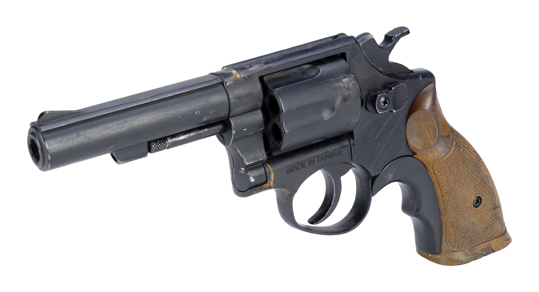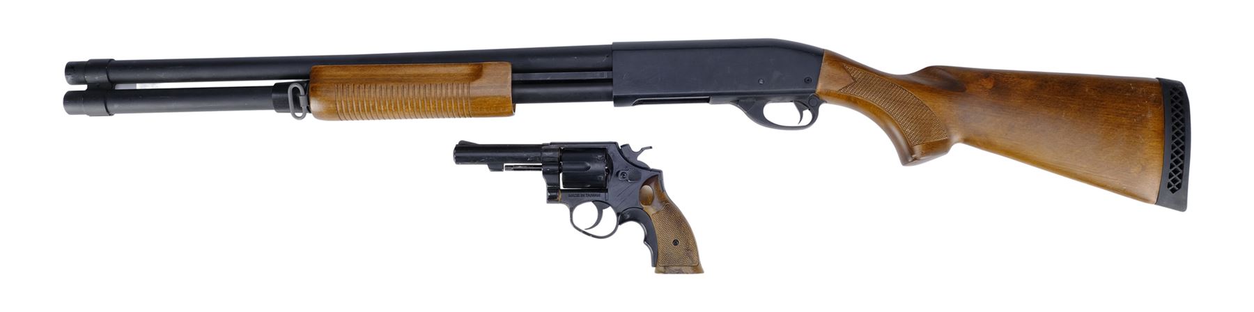 This lot consists of one airsoft revolver and an airsoft shotgun. The revolver is made of metal and brown plastic. The shotgun consists of a metal barrel and wooden stock. It features "03" on one side painted in yellow at the butt of the stock. They come with six metal bullets and two red plastic shotgun shells. This lot exhibits some discoloration and a buildup of grime. Dimensions: (largest) 41" x 7" x 2" (104.25 cm x 17.75 cm x 5 cm)