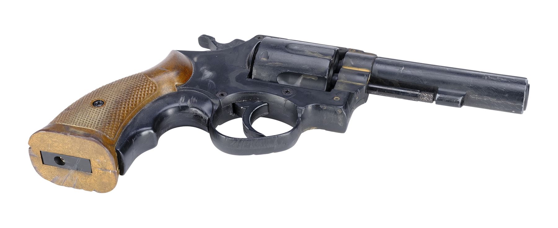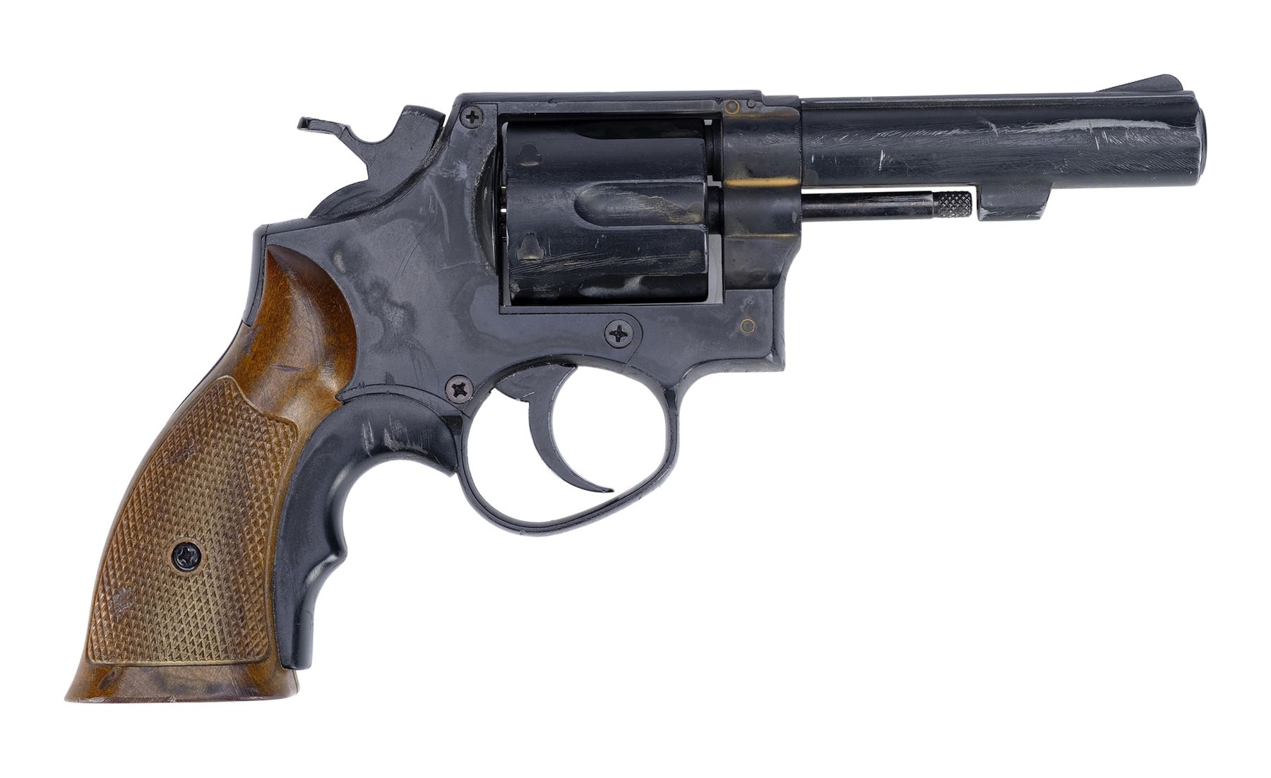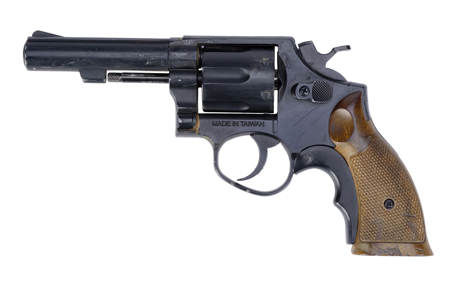 This lot consists of one airsoft revolver and an airsoft shotgun. The revolver is made of metal and brown plastic. The shotgun consists of a metal barrel and wooden stock. It features "03" on one side painted in yellow at the butt of the stock. They come with six metal bullets and two red plastic shotgun shells. This lot exhibits some discoloration and a buildup of grime. Dimensions: (largest) 41" x 7" x 2" (104.25 cm x 17.75 cm x 5 cm)