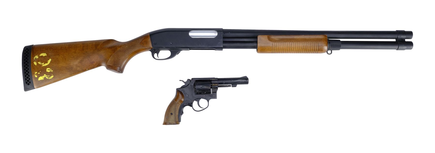 3 FROM HELL (2019) - Otis' (Bill Moseley) Smith & Wesson Revolver and Bullets with Guard's Remington Shotgun - Otis' (Bill Moseley) Smith & Wesson revolver and bullets with a guard's Remington shotgun from Rob Zombie's 3 from Hell. Otis carried and used his weapons throughout the film, including during the fight with The Black Satans.