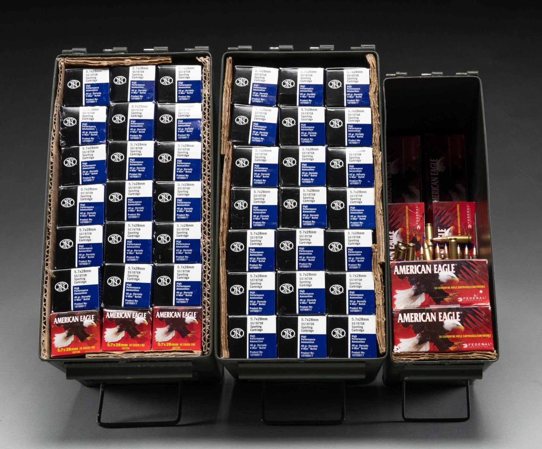 Grouping of 4850+ rds.5.7x28mm ammo in the following breakdown; 78 boxes (50 rds. ea.) FN 40 gr. Hornady V-Max, SS197SR & 19 boxes American Eagle 40 gr. FMJ. UNATTACHED ACCESSORIES: currently packaged in 3 steel ammo cans. CONDITION: All ammo appears clean & dry. (02-24640-1/JZ). AMMO. $900-1,800.