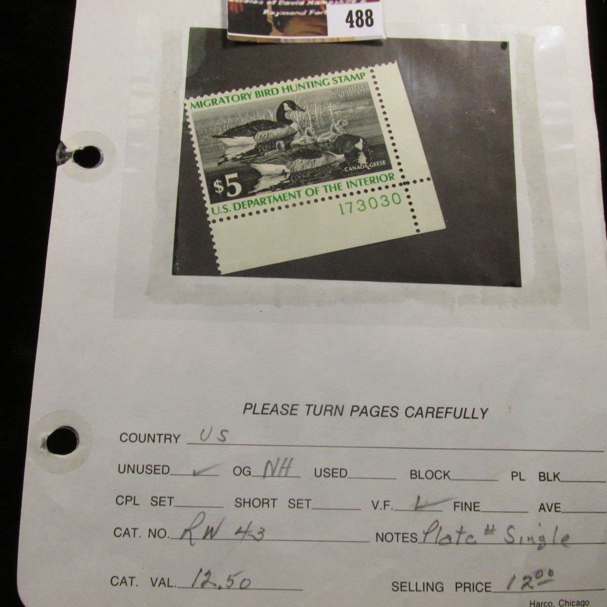 488.1976 U.S. Migratory Bird hunting Stamps, RW43, Unused, OG, Not hinged, Scarce Plate number corner single, VF.