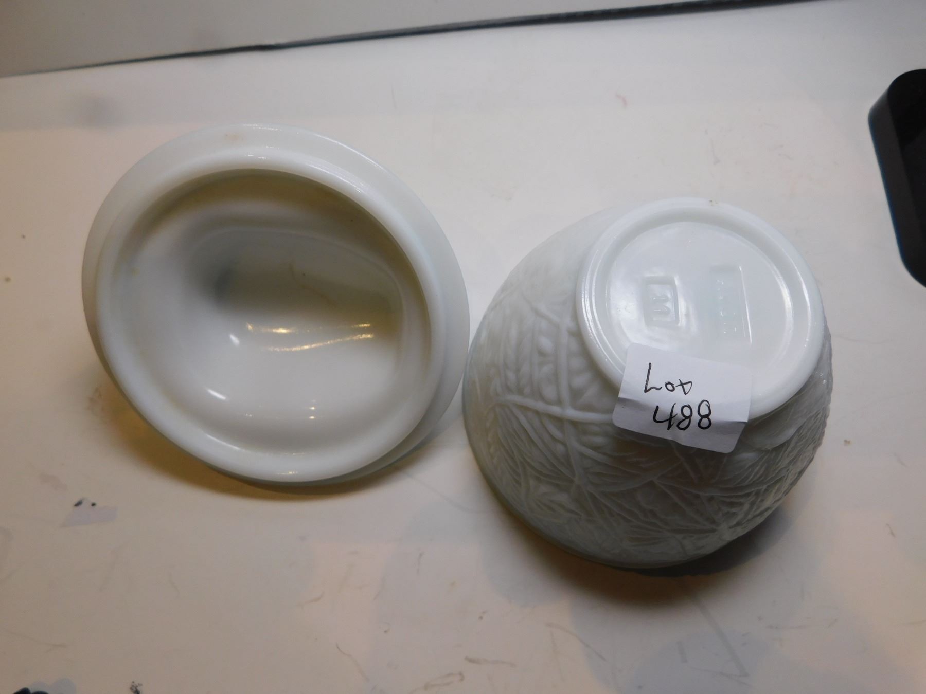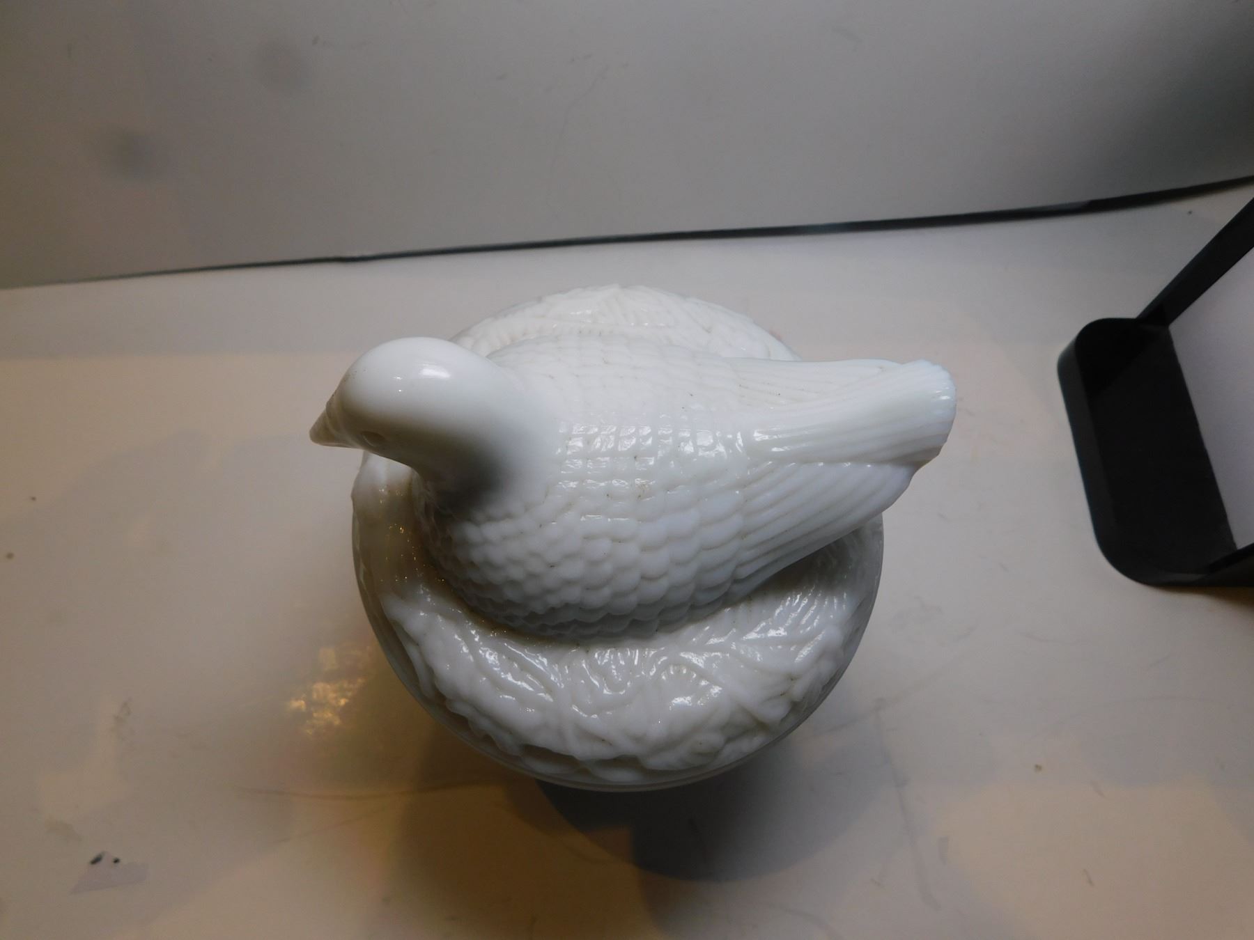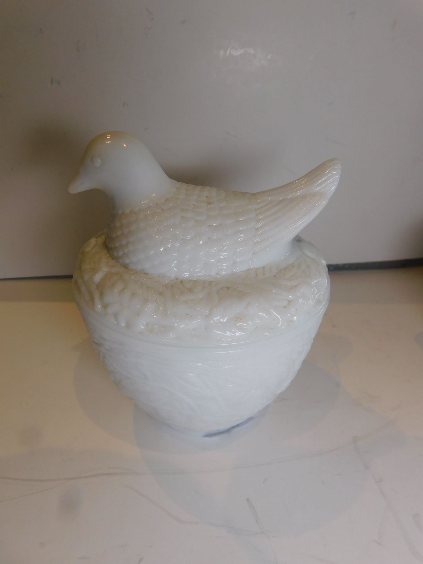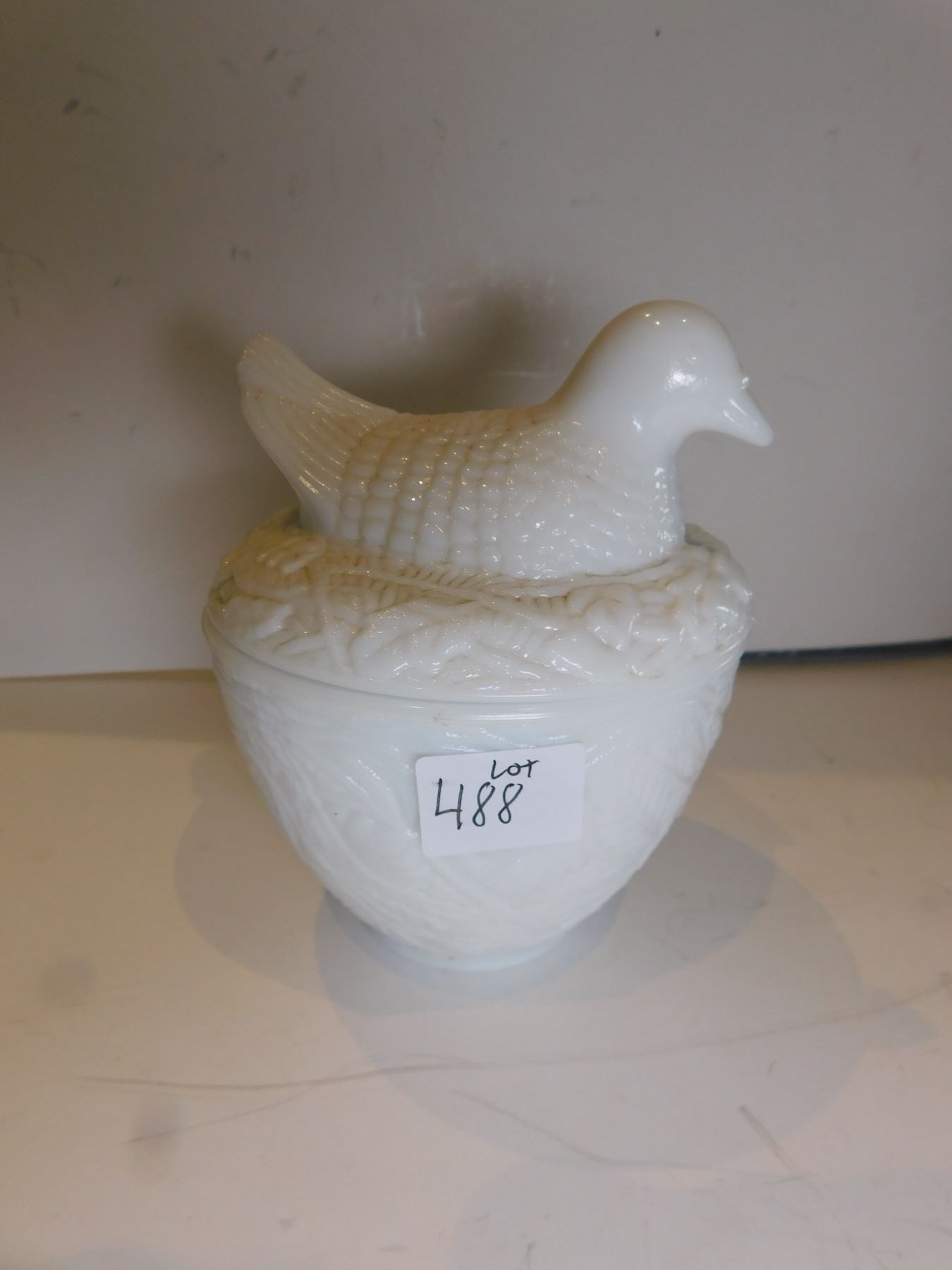 488. AVON, DOVE ON NEST, MILK GLASS CONTAINER