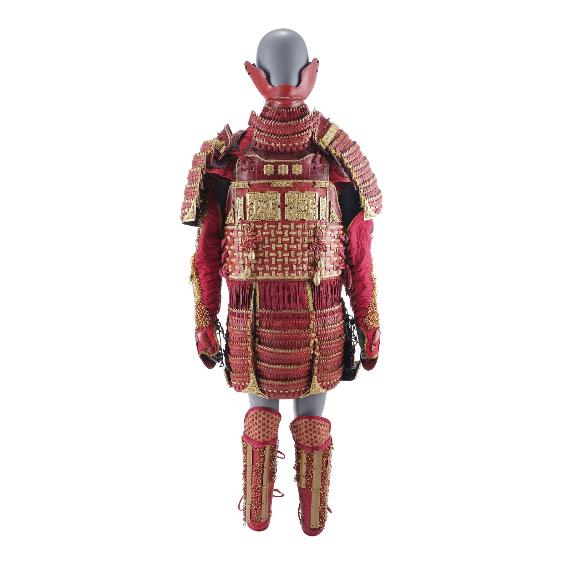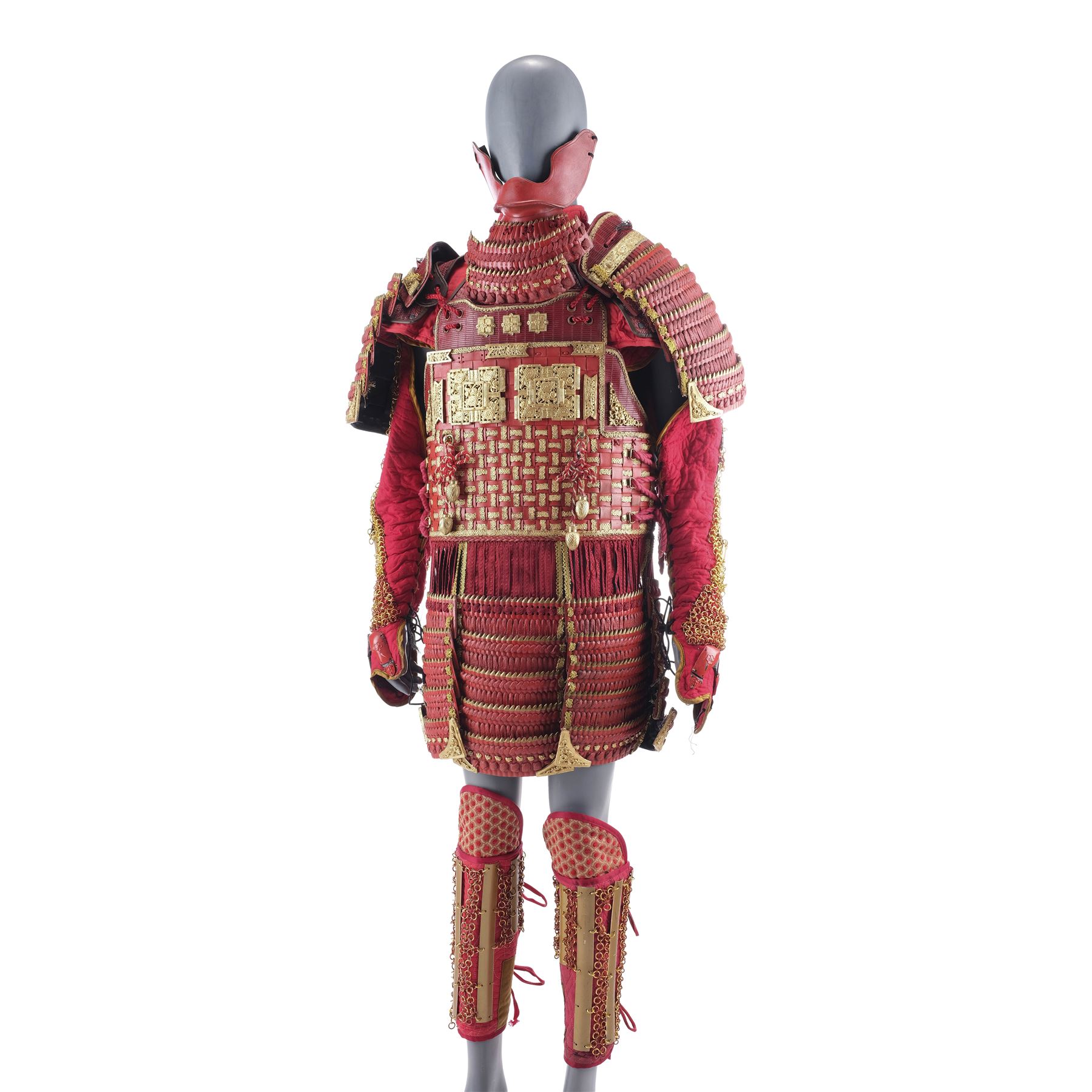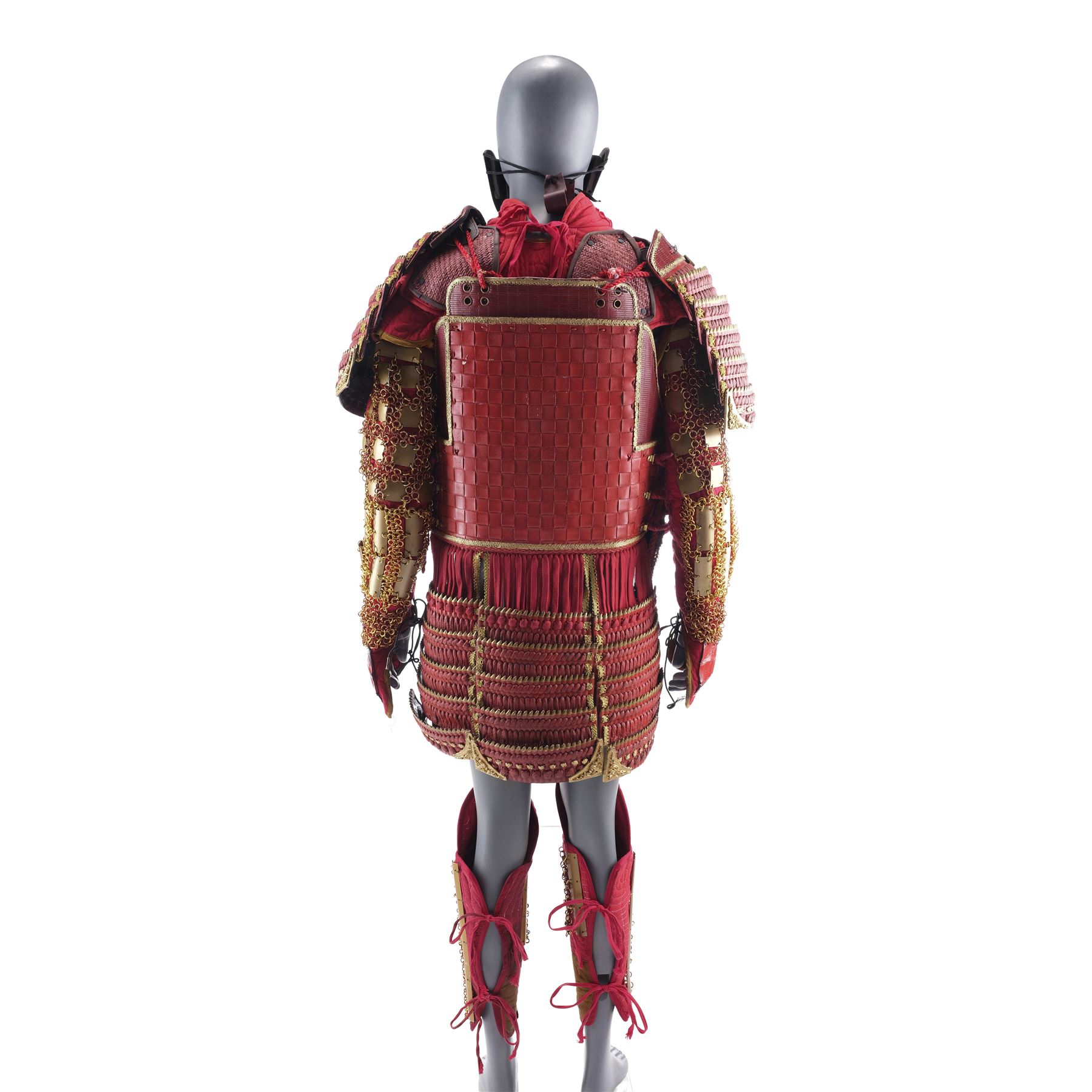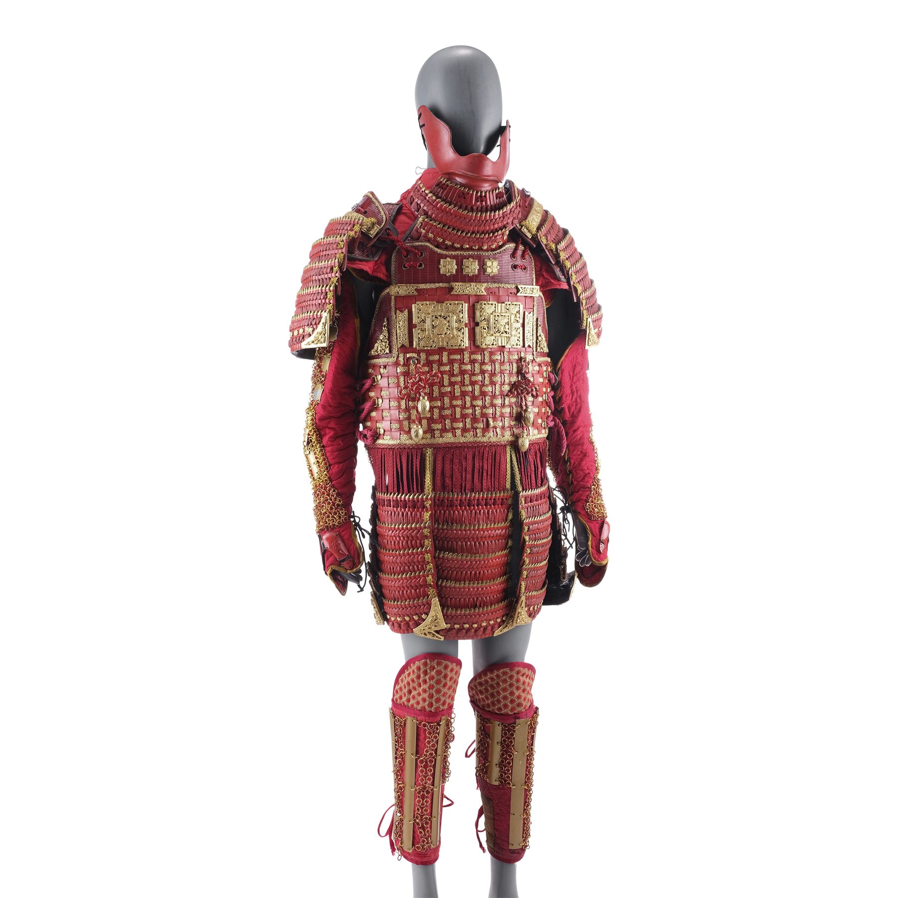This costume consists of chest and back armor with an attached skirt; chin and neck amor labeled "AESM05 HIROKI FUTITA"; one neck and chest covering made of red cloth and red painted rubber; a pair of shoulder armor; a pair of red cloth arm covers with gold-color metal chainlinks; and a pair of cloth shin covers with gold-color metal chainlinks labeled "KAI STUNT" and "ISOGAI STUNT AMBUSH." The armor pieces are made of rubber painted red and gold-color, the colors of the Ako clan. This lot exhibits minor chipped paint, as well as minor staining and tears to the shin covers.