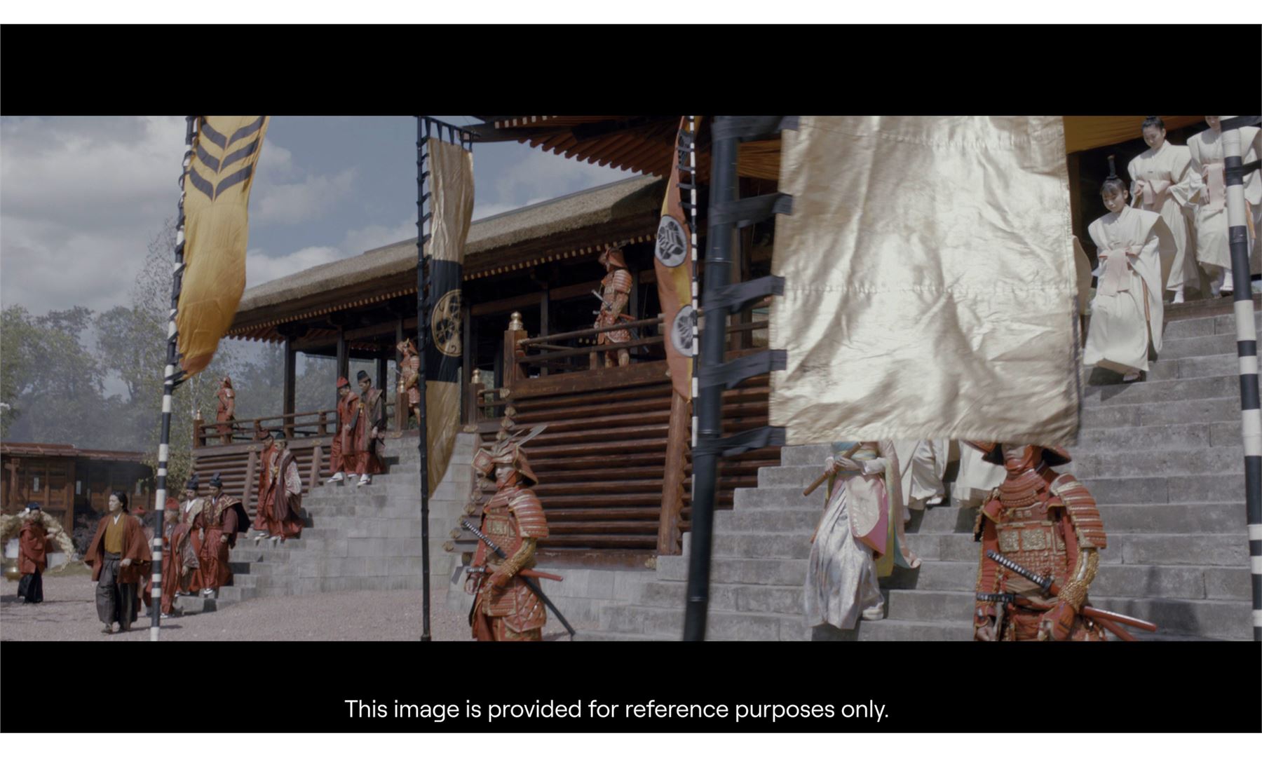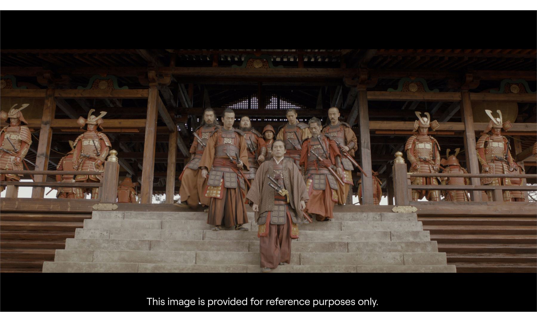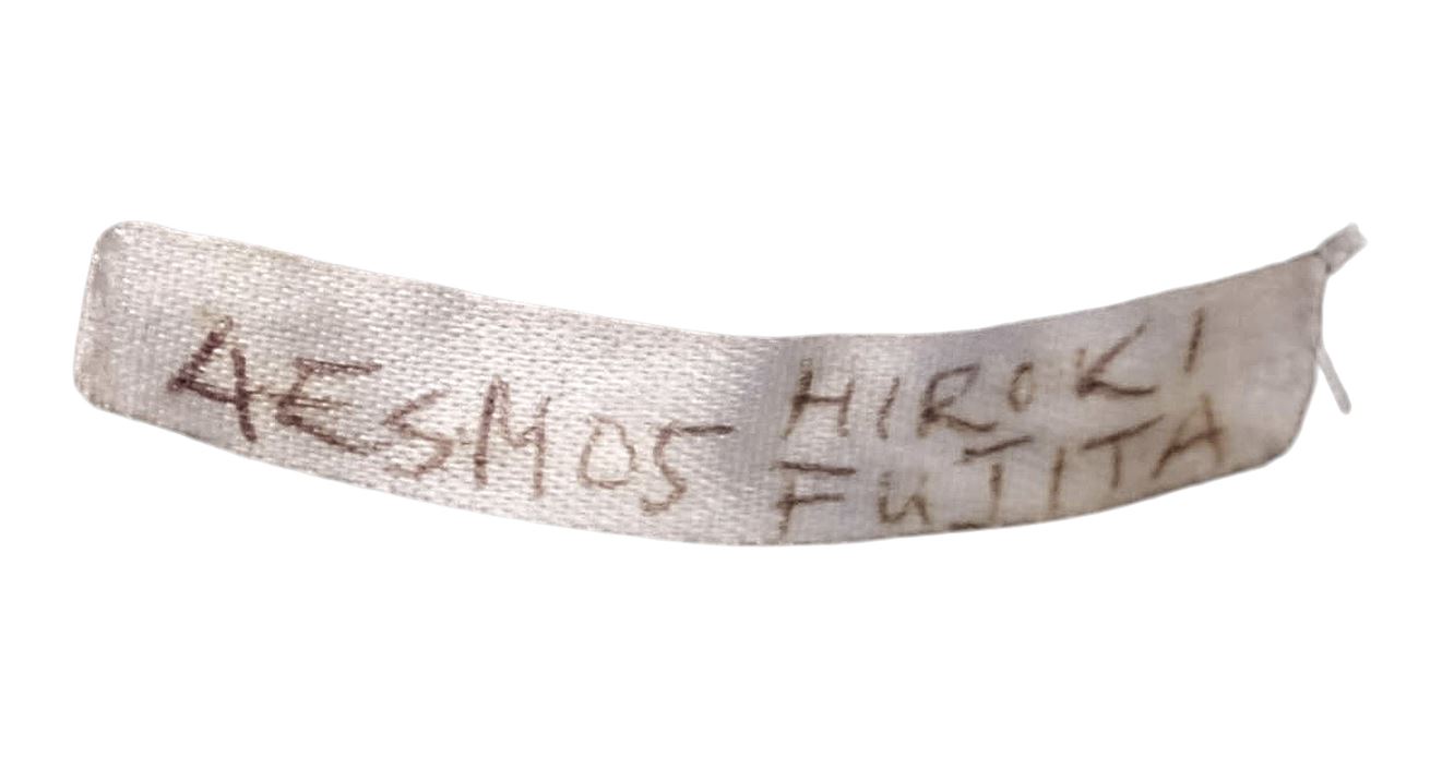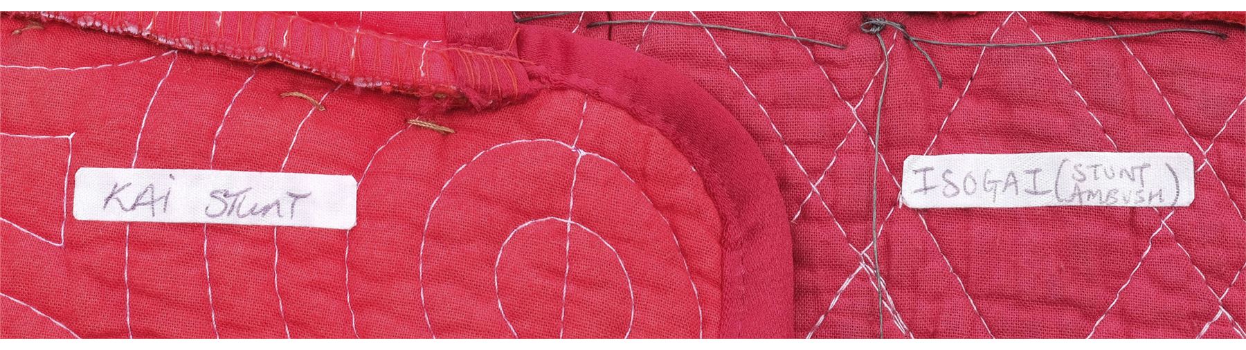 This costume consists of chest and back armor with an attached skirt; chin and neck amor labeled "AESM05 HIROKI FUTITA"; one neck and chest covering made of red cloth and red painted rubber; a pair of shoulder armor; a pair of red cloth arm covers with gold-color metal chainlinks; and a pair of cloth shin covers with gold-color metal chainlinks labeled "KAI STUNT" and "ISOGAI STUNT AMBUSH." The armor pieces are made of rubber painted red and gold-color, the colors of the Ako clan. This lot exhibits minor chipped paint, as well as minor staining and tears to the shin covers.