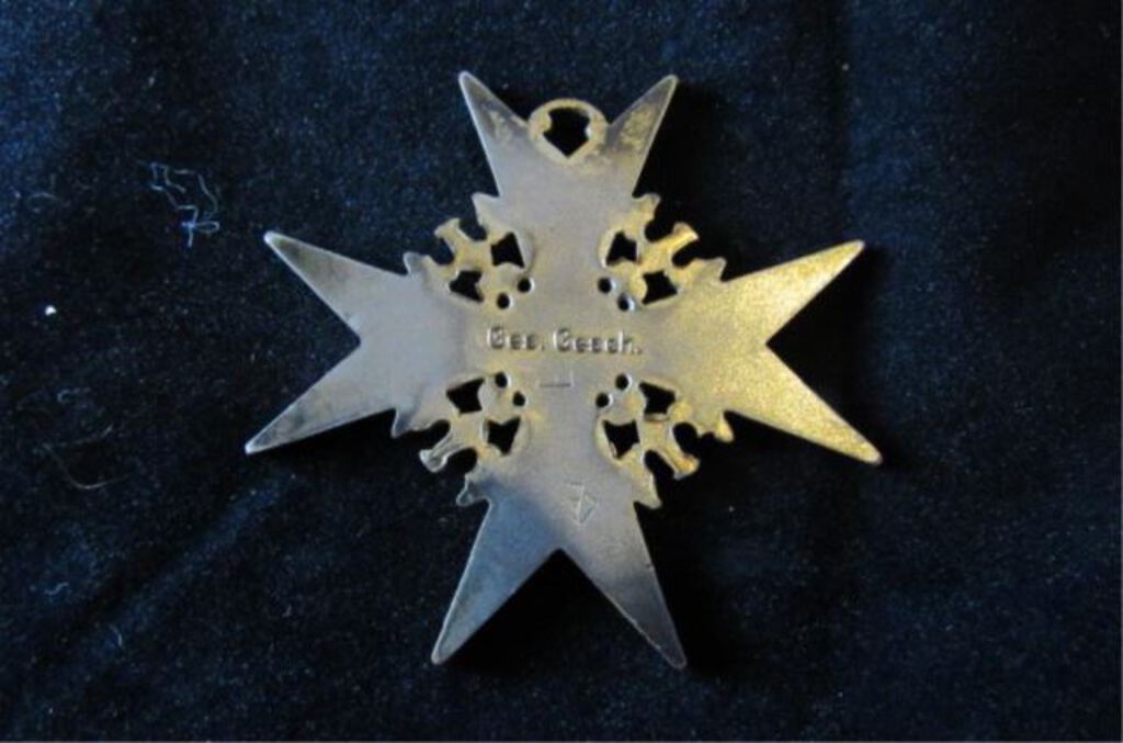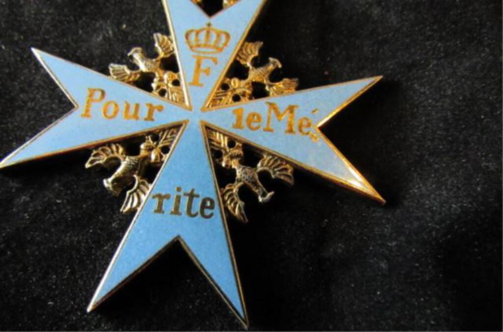 The illustrious Pour le Mérite, the medal that was so coveted by the airmen of WWI. This is in the fine corn-flower blue color with the finest definition to the eagles. The reverse is stamped Ges. Gesch. There are a