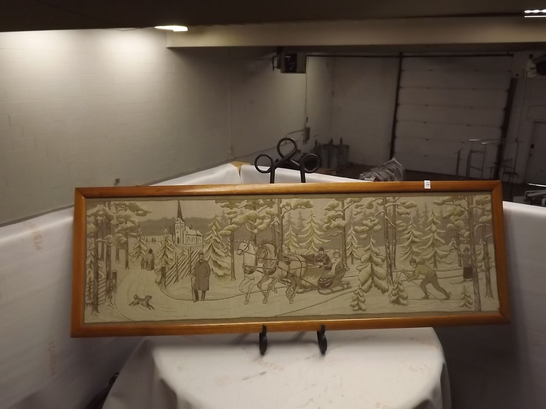 49.5" X 17.5" FRAMED NEEDLE POINT WINTER WOONDERLAND SCENE PICTURE