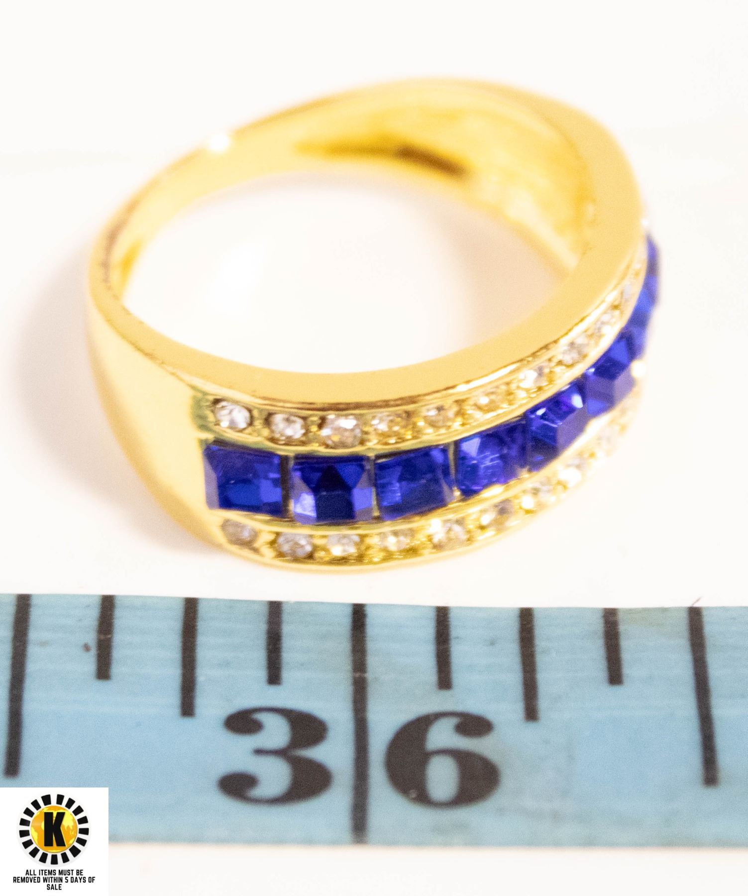 IN RING WITH CLEAR STONES ON EITHER SIDE IN GOLD TONE RING SIZE 9