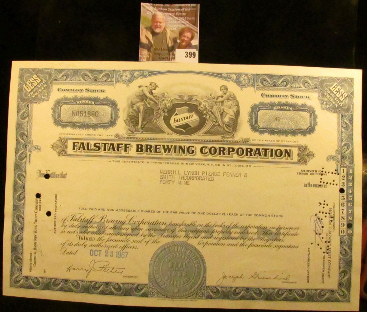 49 Shares Common Stock Certificate "Falstaff Brewing Corporation", Oct. 23 1967.