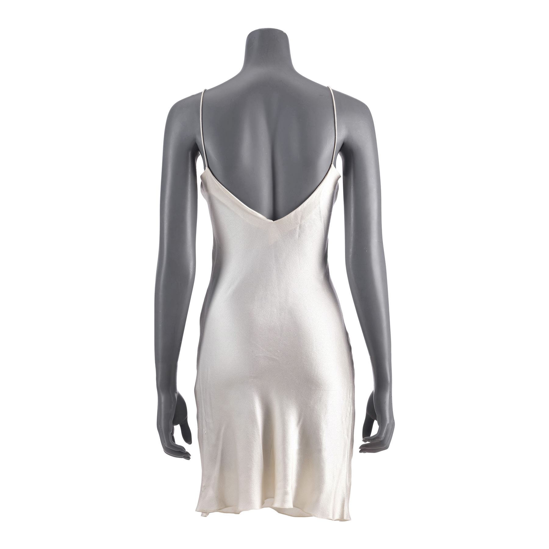 Made from glossy ivory-color satin, this sleek halter slip with a teardrop neckline is applied with tape in several places by production. Some pieces have fallen off, leaving residue, or yellowed from age, while the satin exhibits minor discoloration in places.