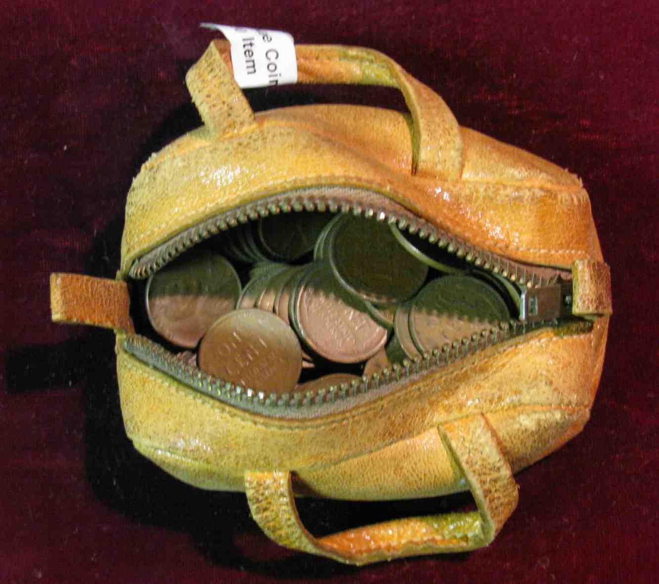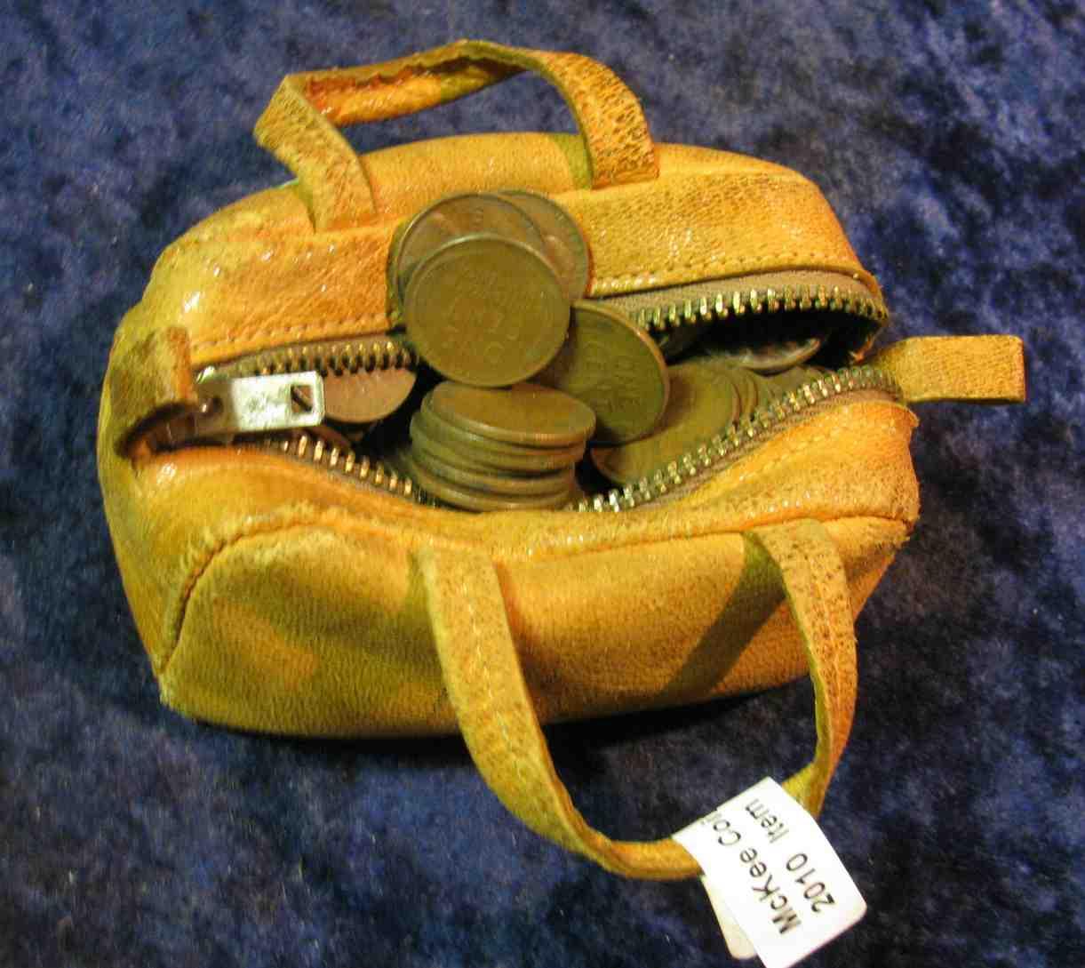 491. (127) Mixed date Wheat Cents & (3) Clad Roosevelt Dimes in a leather purse.