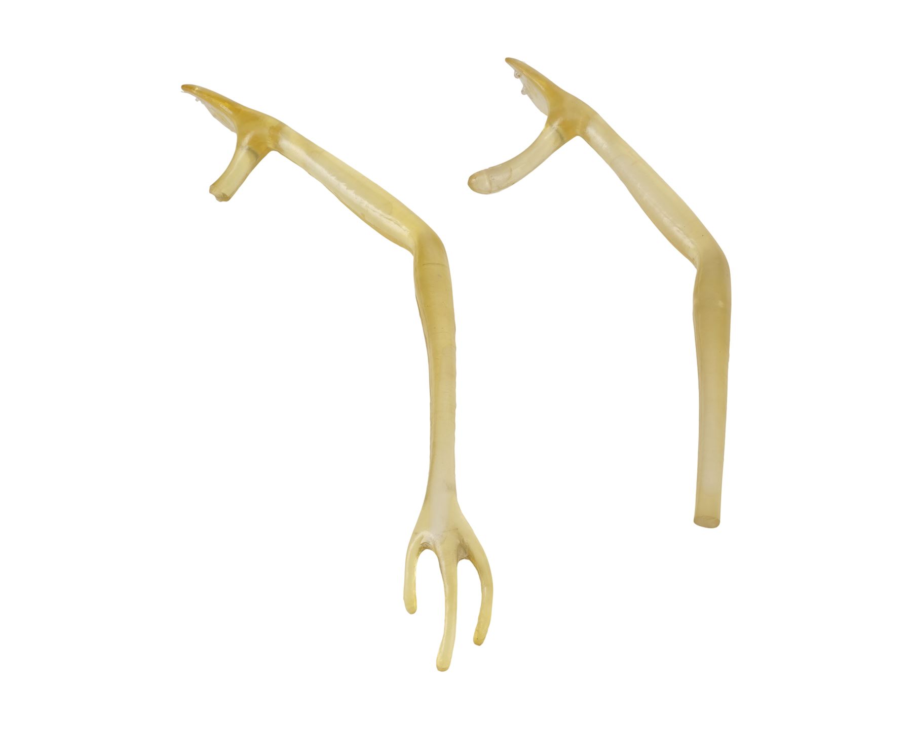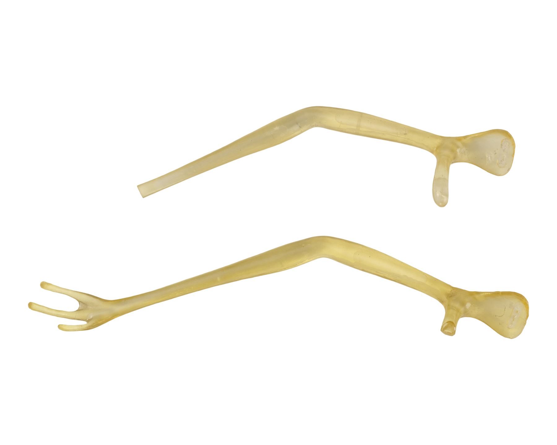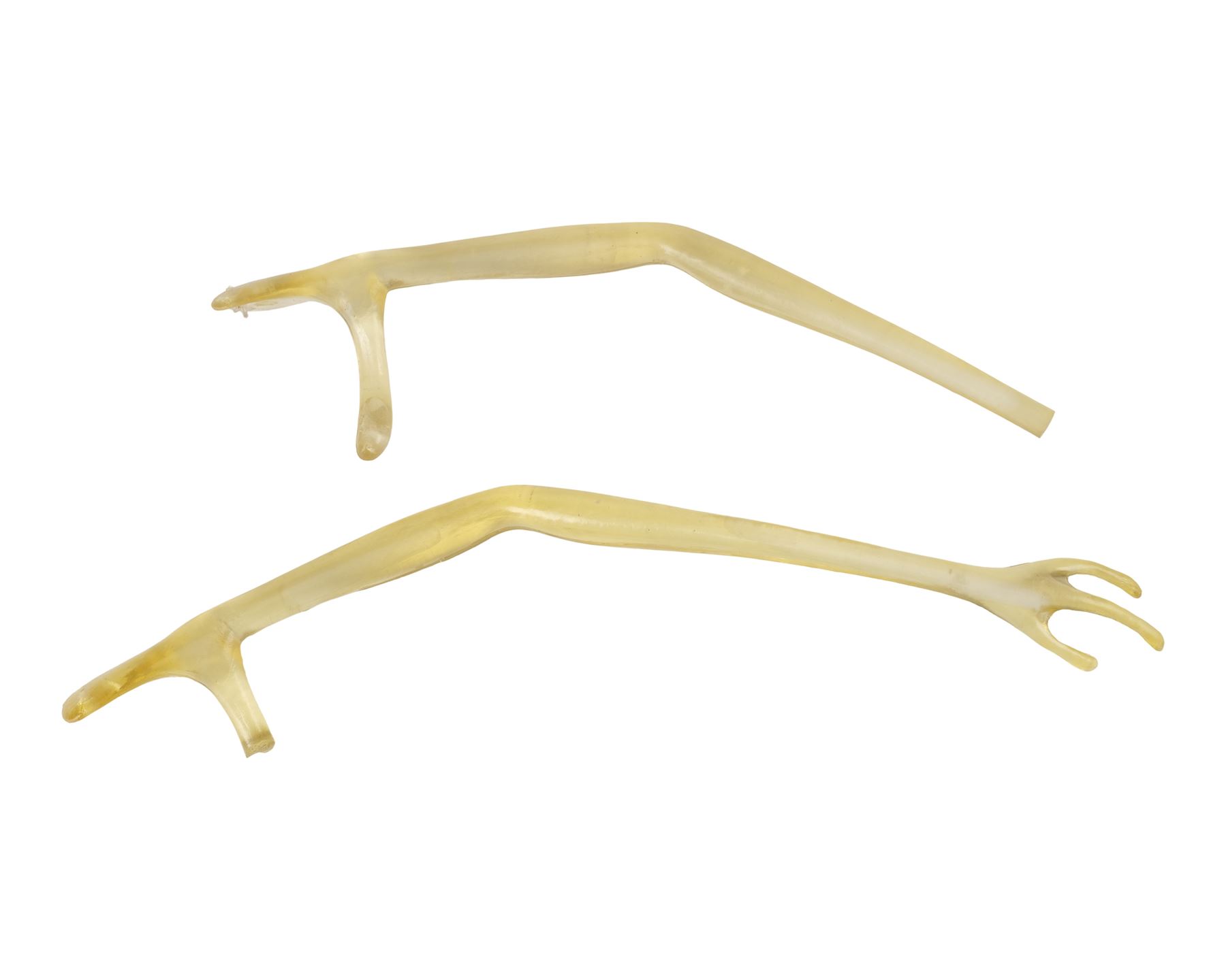 Created for Brigman's climactic N.T.I. encounter sequence by the animatronics and puppetry team at Steve Johnson's XFX, these two transparent honey-color cast resin arms feature wishbone-style splits in their tips. One arm also features three fingers on the other end. The split endpoints exhibit scratching and discoloration from being mounted to a larger puppet, and one arm's fingers have snapped off since production. Dimensions: (each) 13.5" x 2" x 1" (34.5 cm x 5 cm x 2.5 cm)