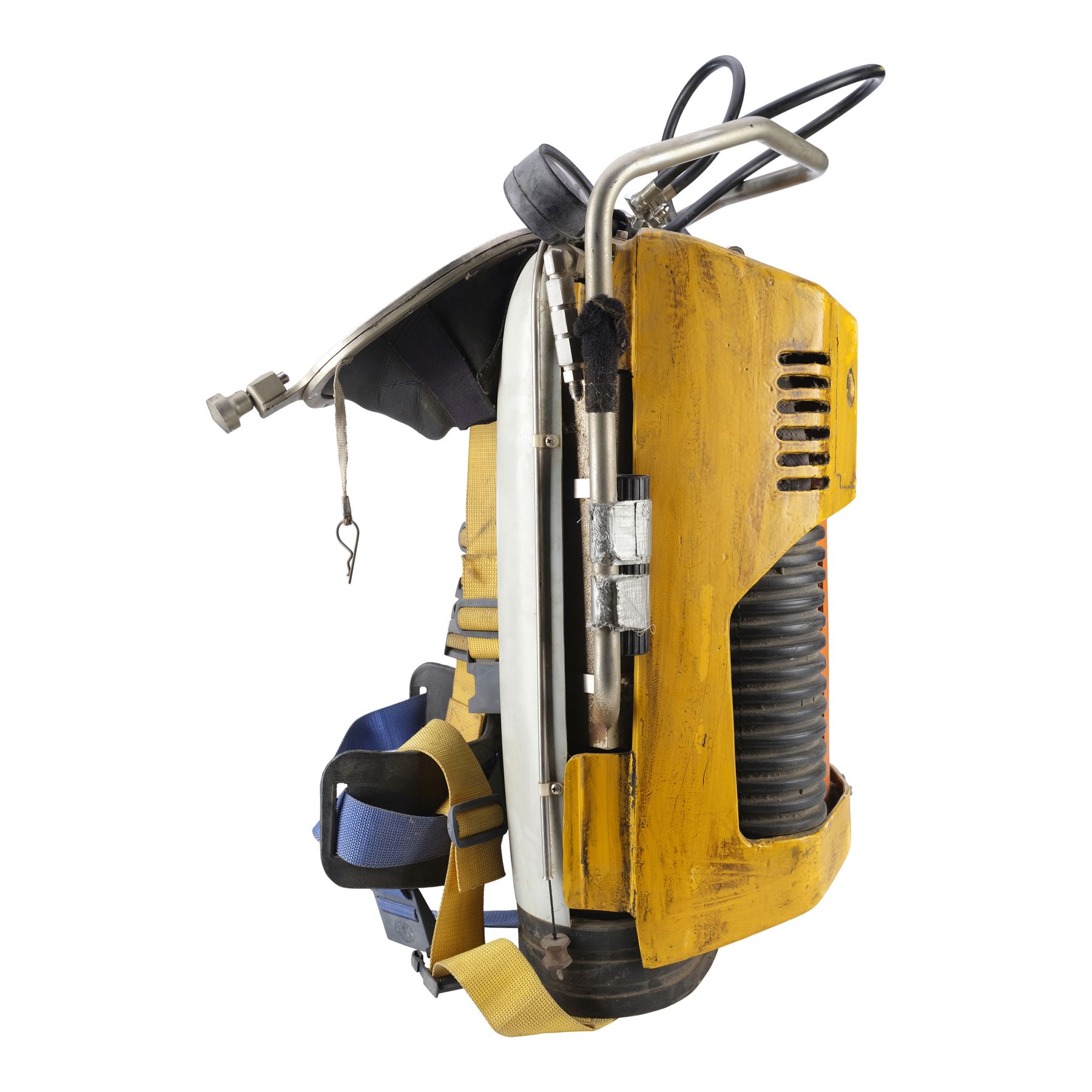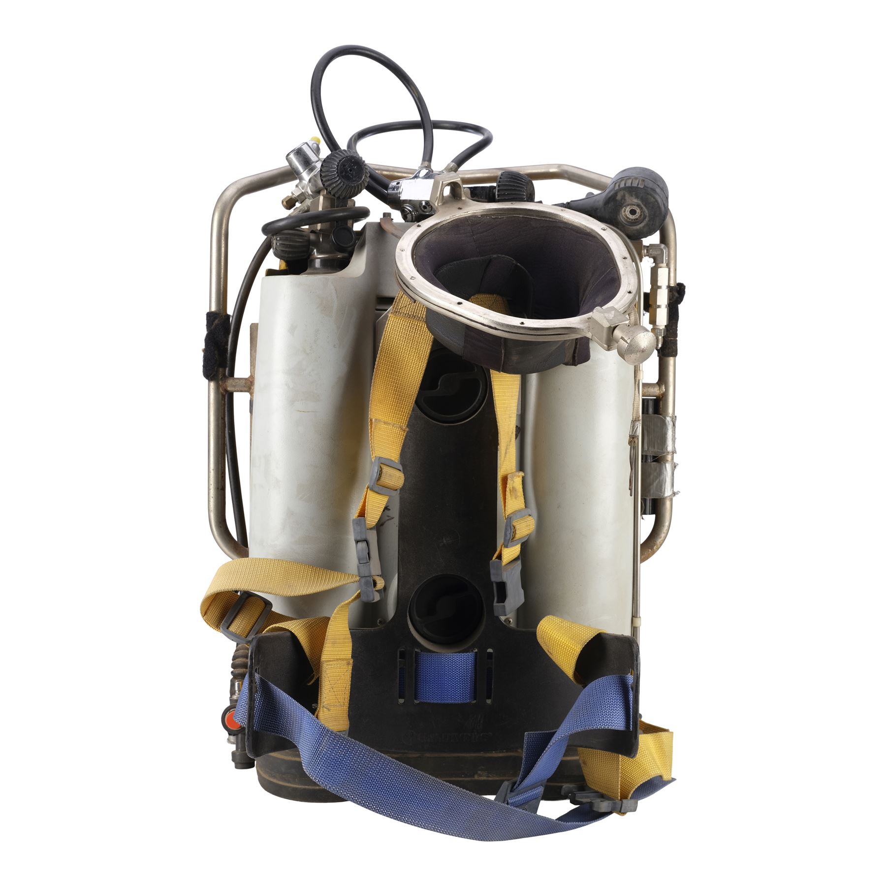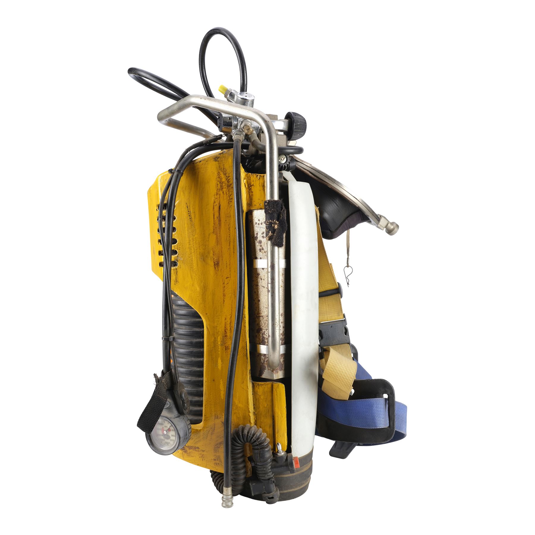 Constructed by Western Space and Marine, this custom diving backpack is designed to be refilled while underwater, allowing the cast to be submerged longer during the diving sequences. It features a metal deep-sea diving shell painted yellow and is mounted with a pair of black ridged tank holders, rubber hoses, a Dacor scuba pressure gauge on the left side, electrical metal tubes, a handlebar, and yellow and blue nylon straps. The backpack exhibits intentional distressing by production to appear well-used underwater with rusting, liquid staining, and discoloration to the paint and rubber. Paneling on the pack's back is lifting. Dimensions: 28" x 20" x 15" (71.25 cm x 51 cm x 38.25 cm)