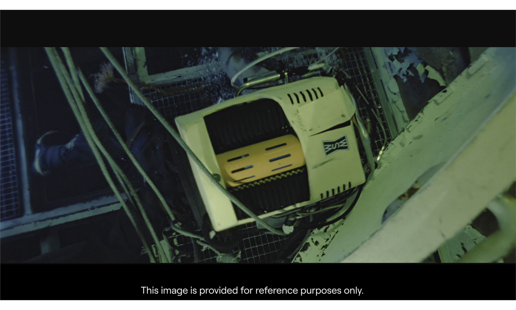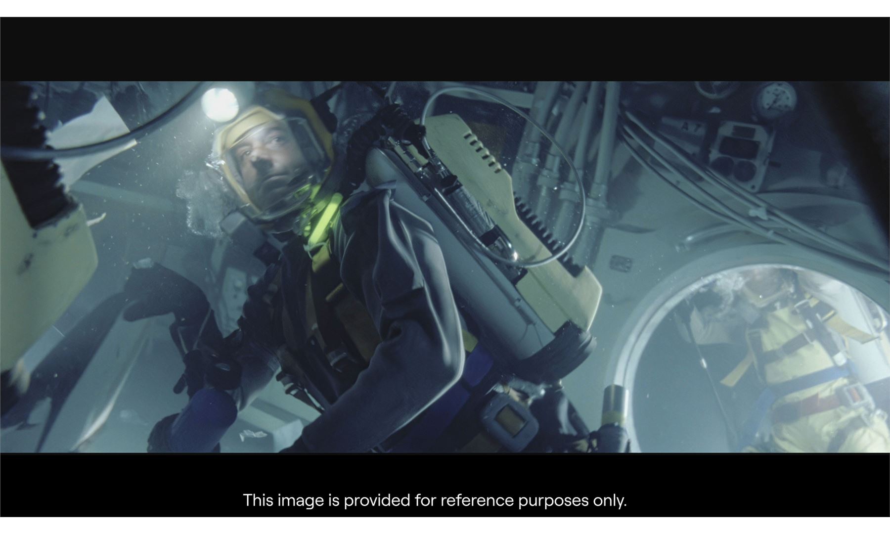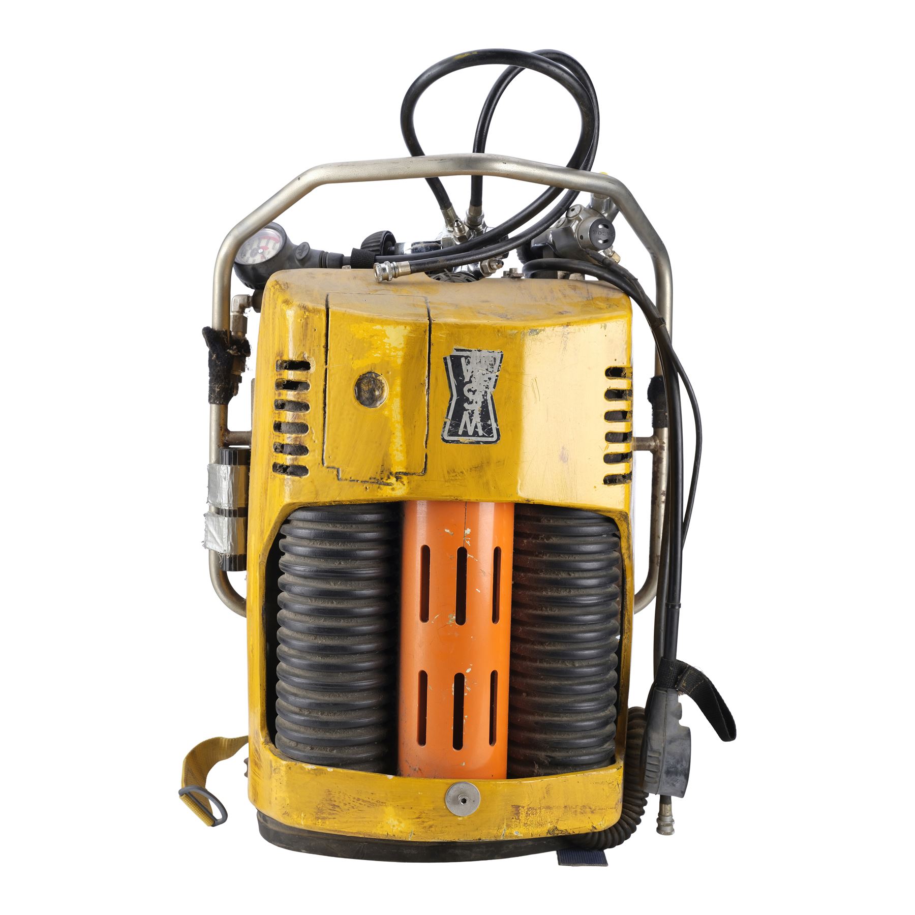Constructed by Western Space and Marine, this custom diving backpack is designed to be refilled while underwater, allowing the cast to be submerged longer during the diving sequences. It features a metal deep-sea diving shell painted yellow and is mounted with a pair of black ridged tank holders, rubber hoses, a Dacor scuba pressure gauge on the left side, electrical metal tubes, a handlebar, and yellow and blue nylon straps. The backpack exhibits intentional distressing by production to appear well-used underwater with rusting, liquid staining, and discoloration to the paint and rubber. Paneling on the pack's back is lifting. Dimensions: 28" x 20" x 15" (71.25 cm x 51 cm x 38.25 cm)