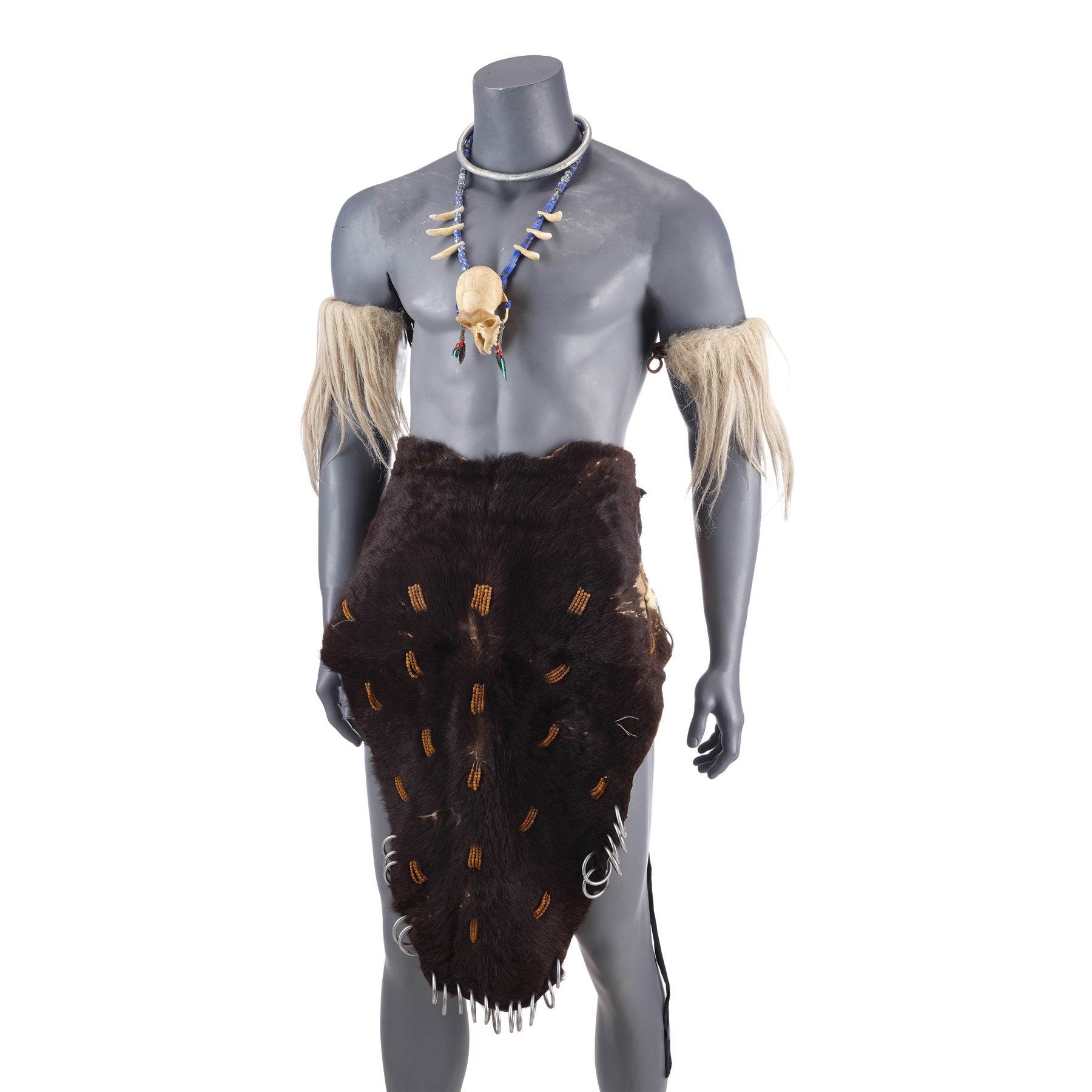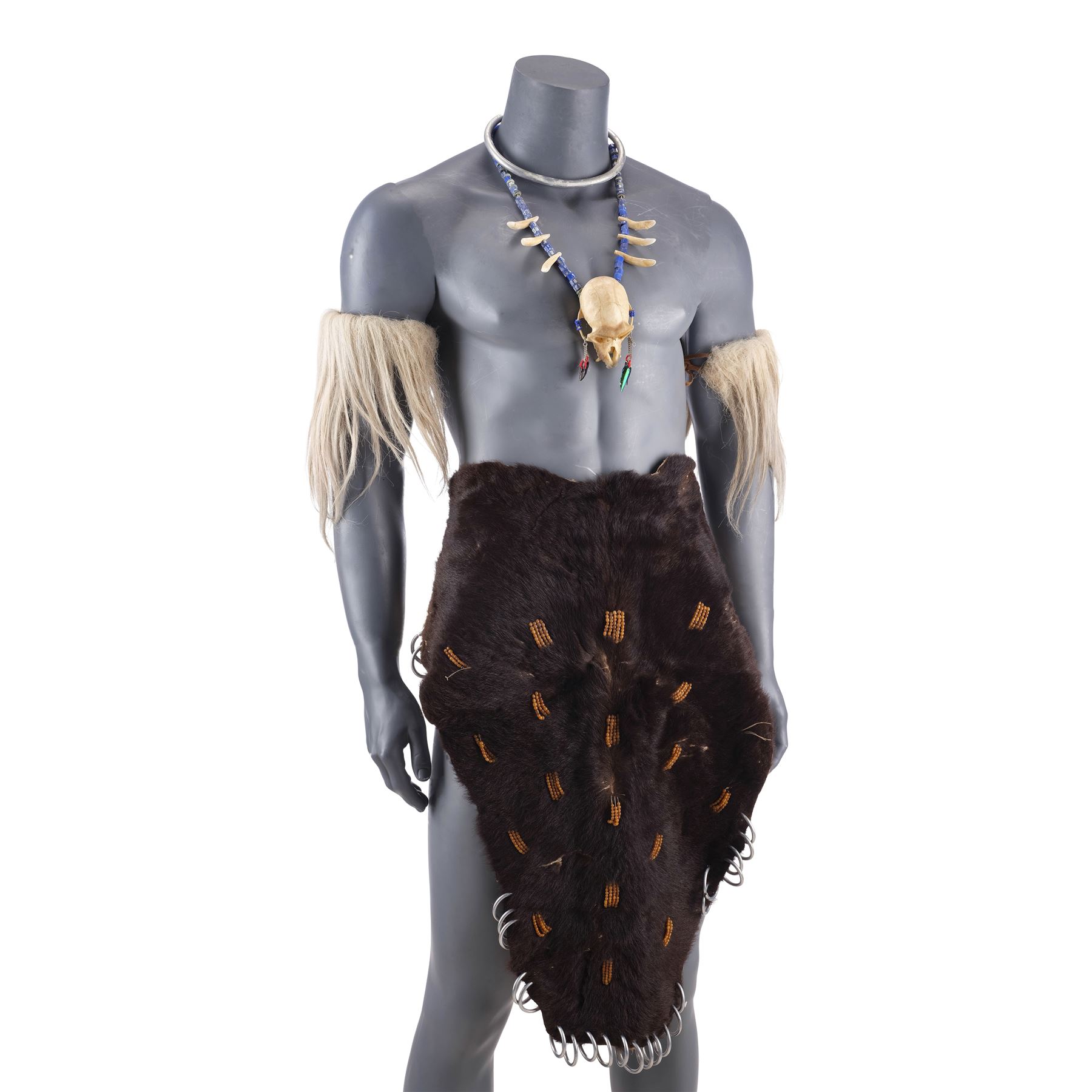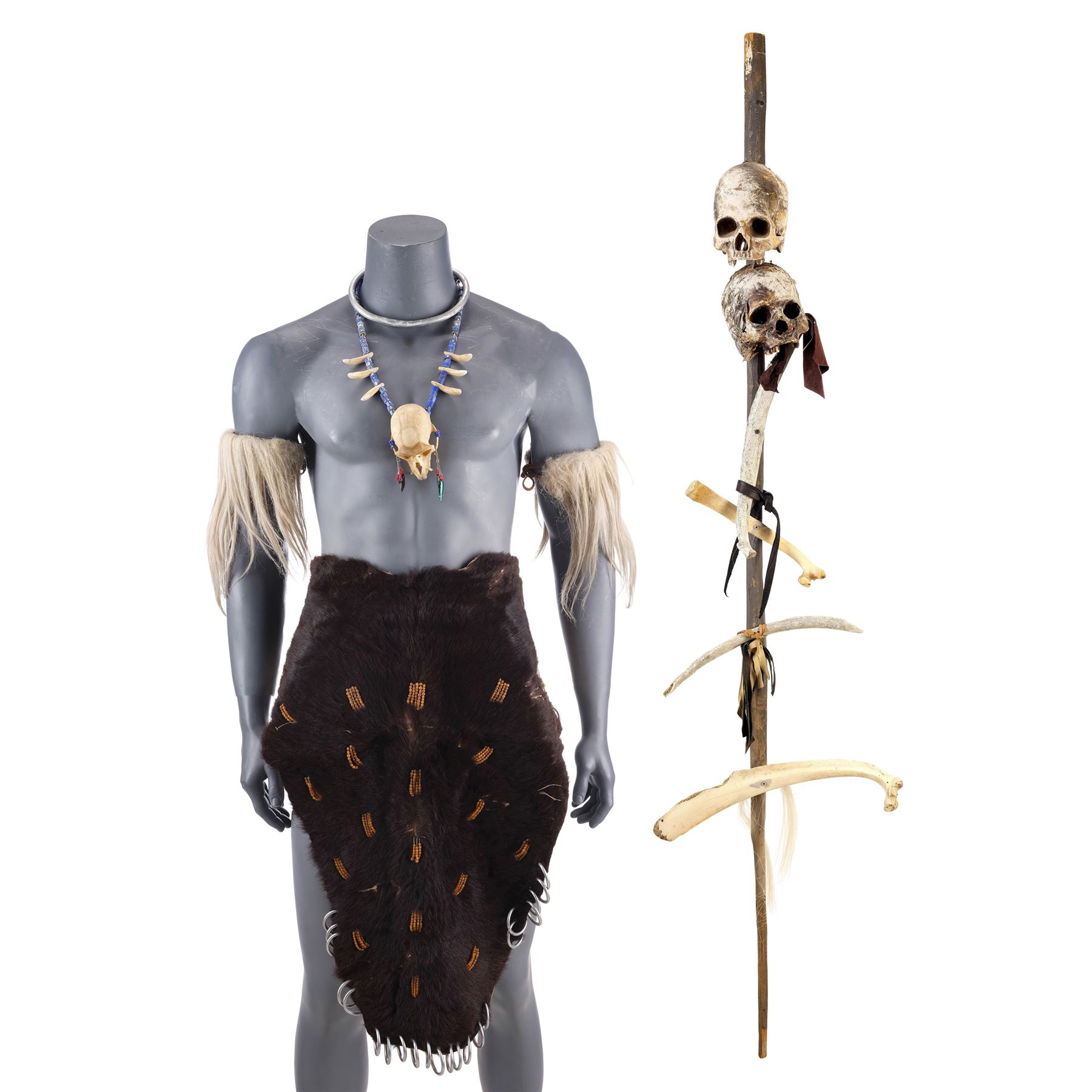 This lot consists of a metal band necklace, a resin animal skull necklace, synthetic hair armbands, and a beaded brown fur apron, as well as a wood staff with animal bone, resin skull heads and strips of leather attached to it. This lot exhibits a buildup of grime, torn fibers, and discoloration. Dimensions: (staff) 76" x 7" x 6" (193 cm x 17.75 cm x 15.25 cm)