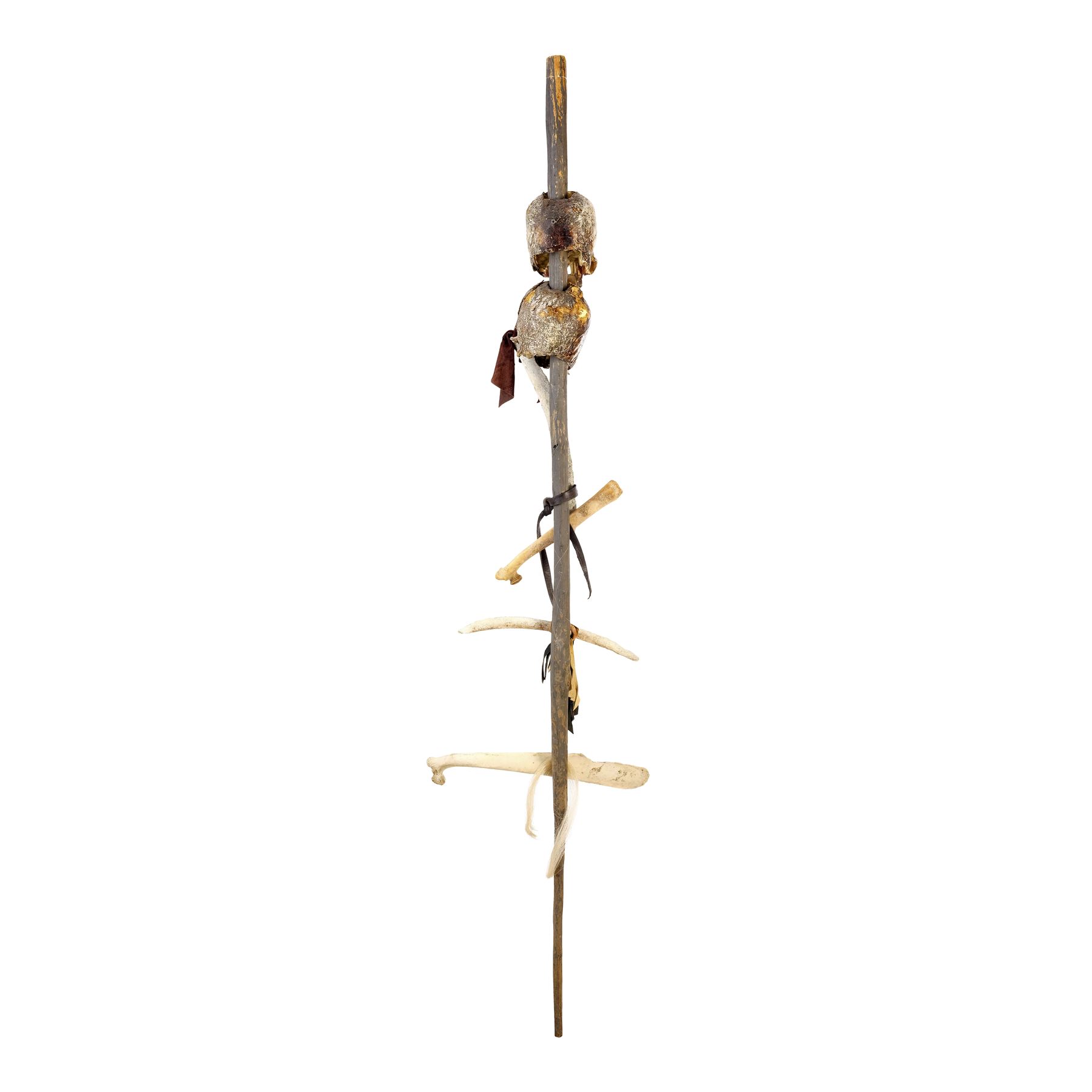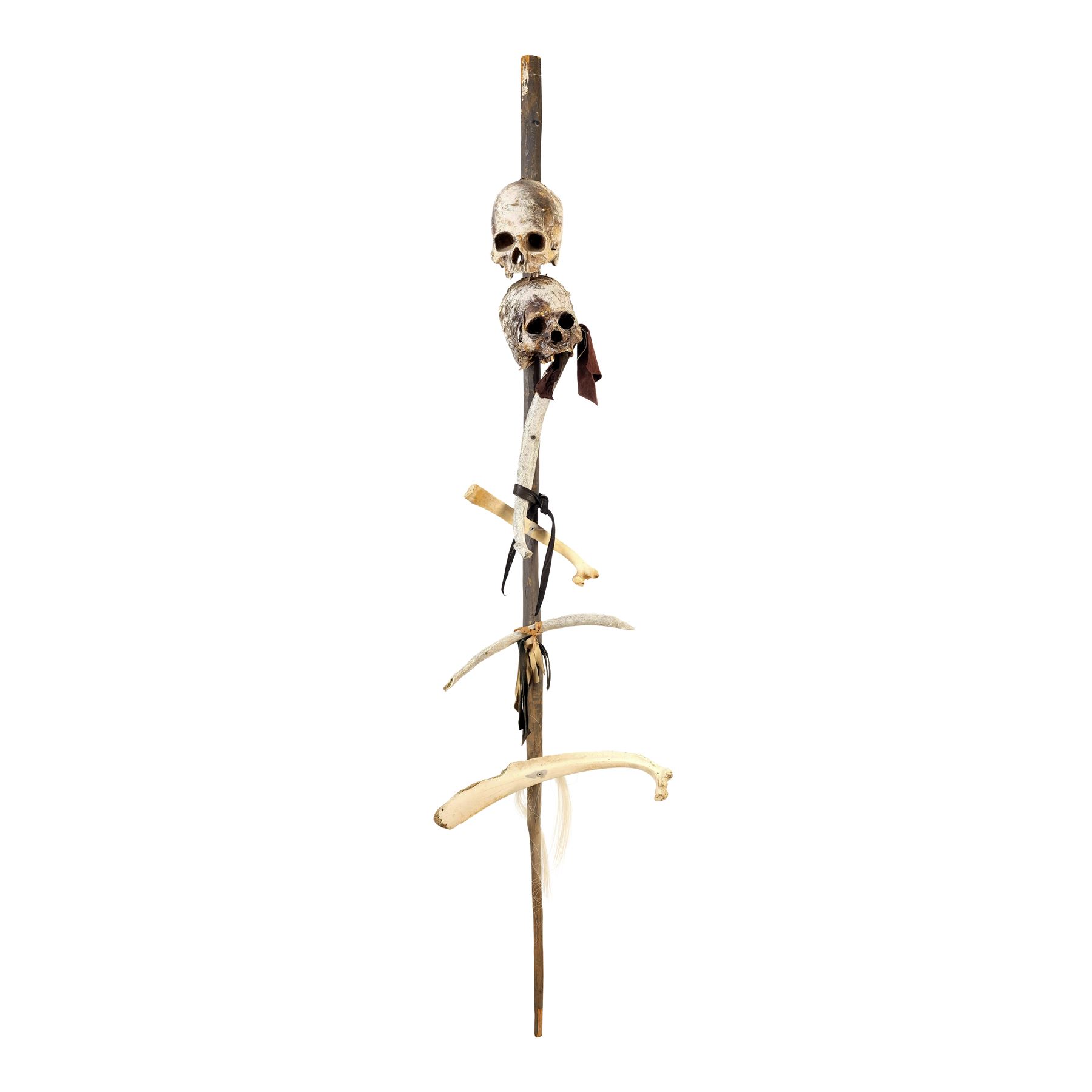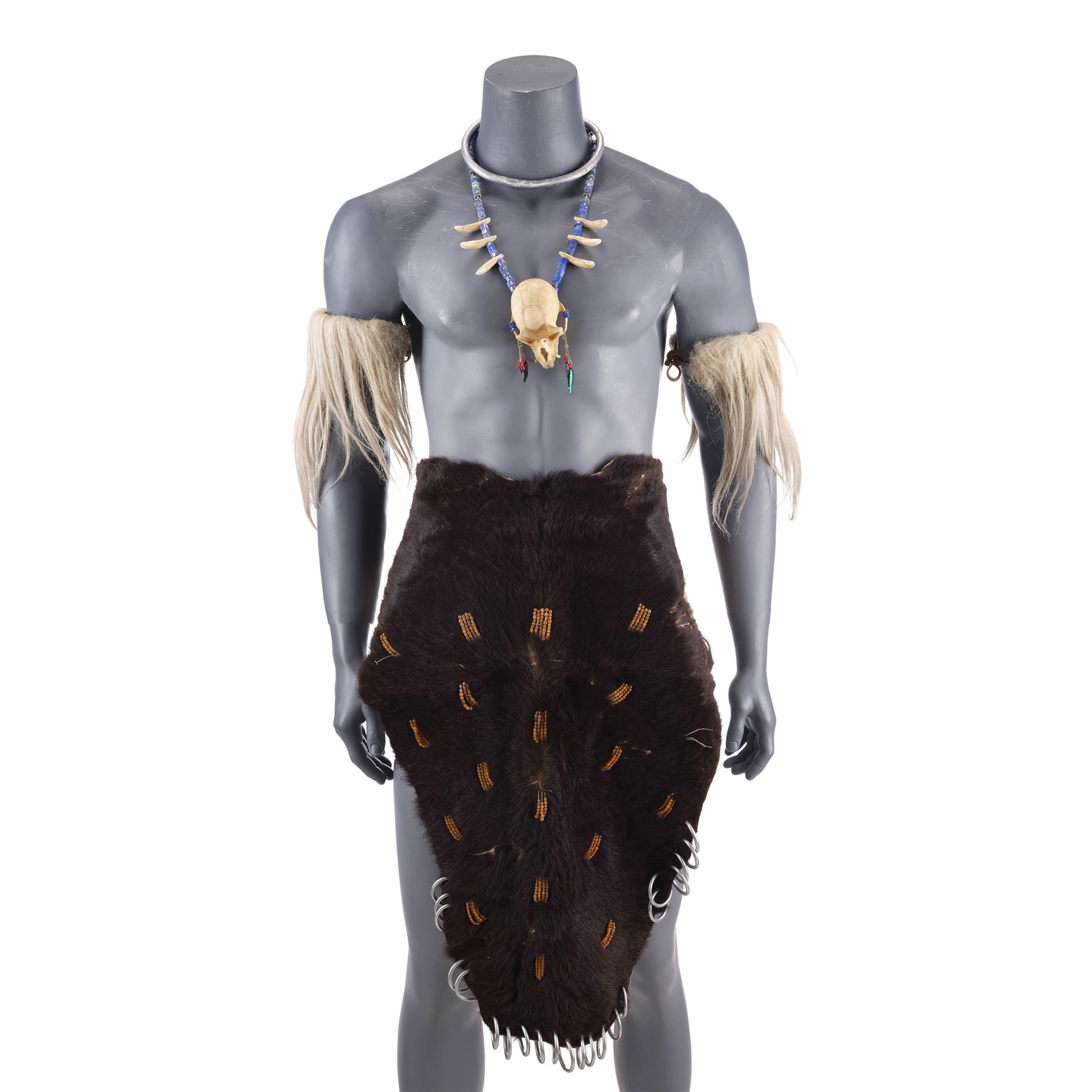 This lot consists of a metal band necklace, a resin animal skull necklace, synthetic hair armbands, and a beaded brown fur apron, as well as a wood staff with animal bone, resin skull heads and strips of leather attached to it. This lot exhibits a buildup of grime, torn fibers, and discoloration. Dimensions: (staff) 76" x 7" x 6" (193 cm x 17.75 cm x 15.25 cm)