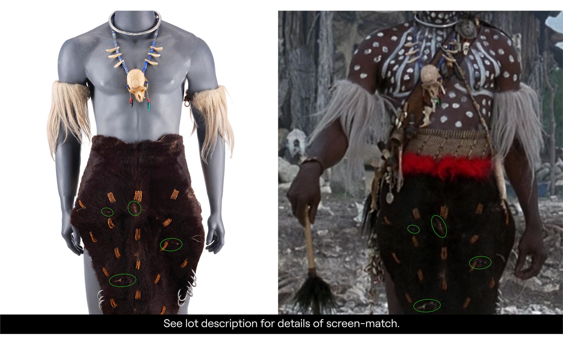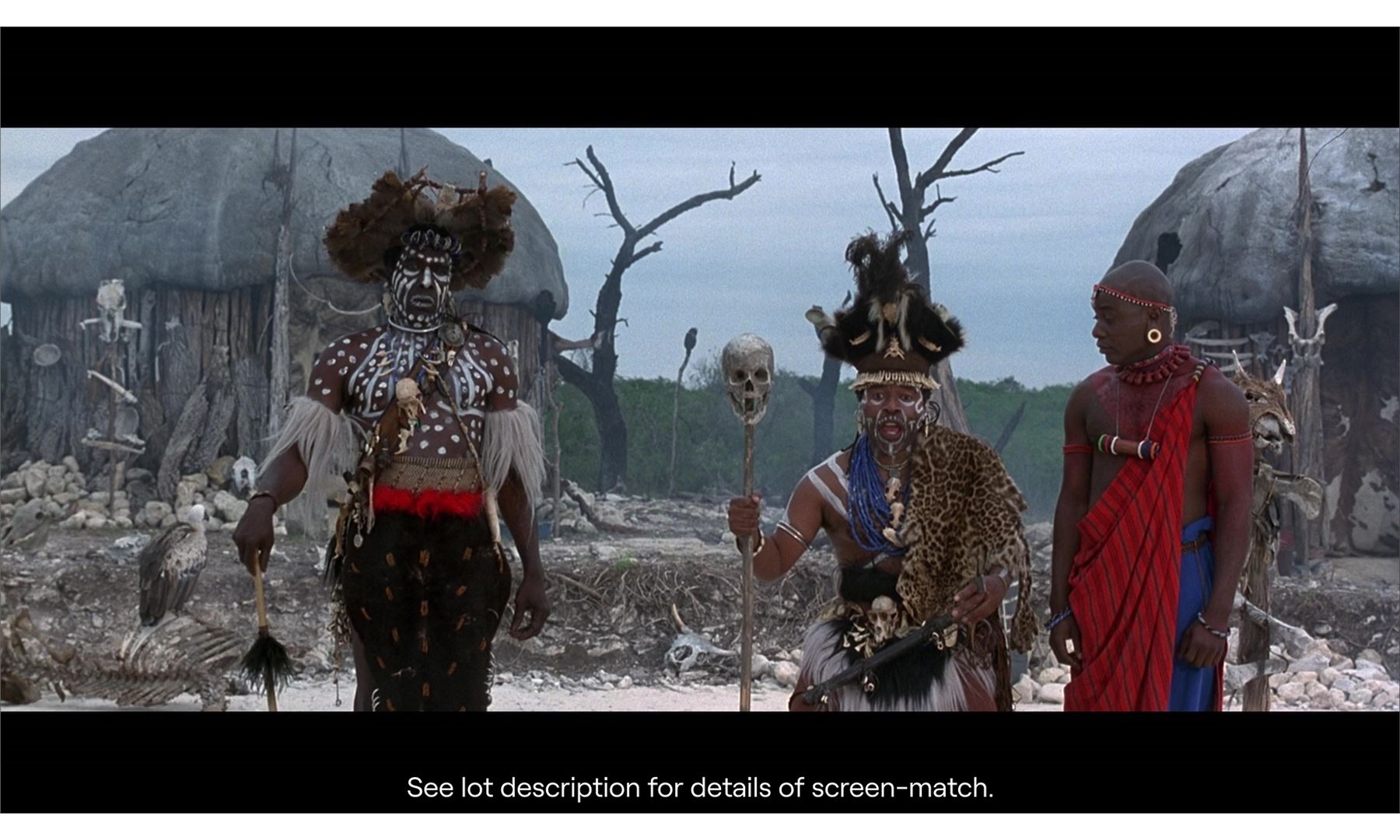 ACE VENTURA: WHEN NATURE CALLS (1995) - Screen-Matched Wachootoo Shaman's (Danny Daniels) Costume with Wachati Tribesman Staff - A screen-matched Wachootoo Shaman's (Danny Daniels) costume with Wachati tribesman staff from Steve Oedekerk's Ace Ventura: When Nature Calls. Ace Ventura (Jim Carrey) investigated the disappearance of the Great White Bat Shikaka and questioned both the local Wachati and Wachootoo tribes. This lot screen-matches due to several matching points on the costume during the Circle of Death fight.