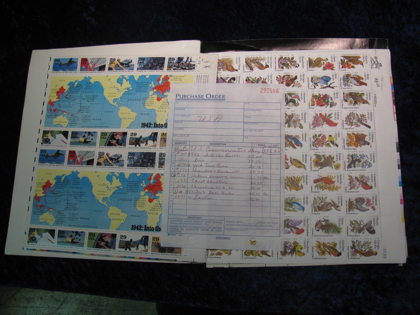 496. Group of Mint Sheets of U.S. Stamps. Many are stuck together at one edge. These are all mint and unused and could be used for postage if steamed a little. Total Face Value $97.80. With a catalog value of $359.25.