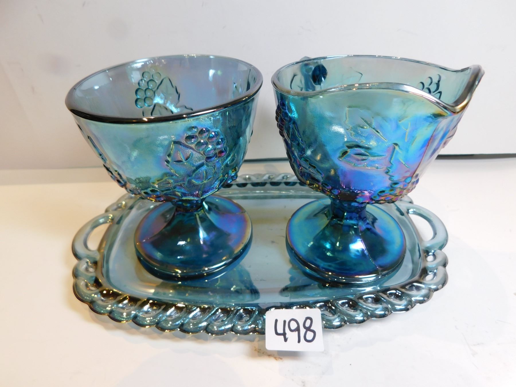 498. BLUE DEPRESSION GLASS CREAM, SUGAR AND TRAY, GRAPE PATTERNED