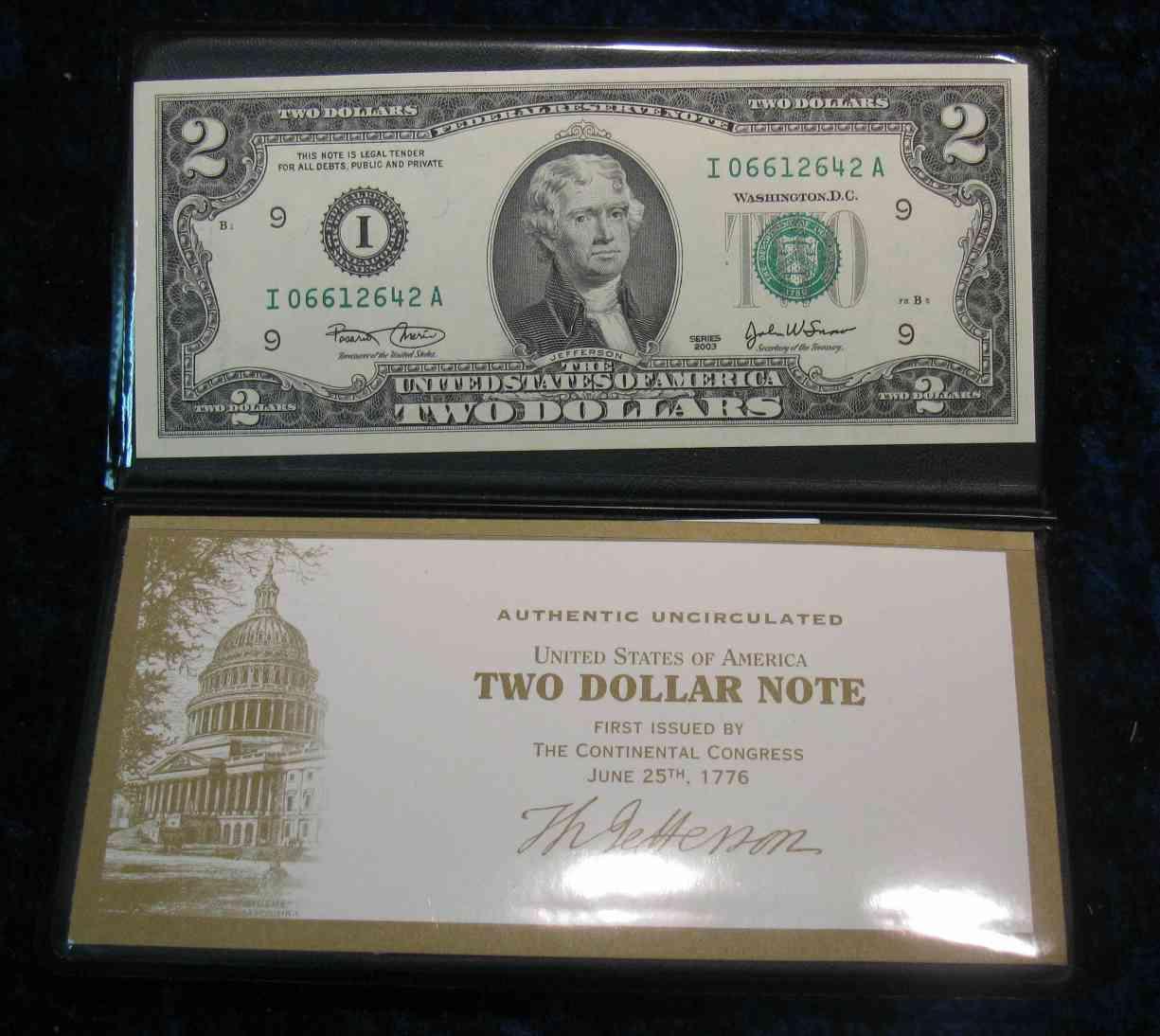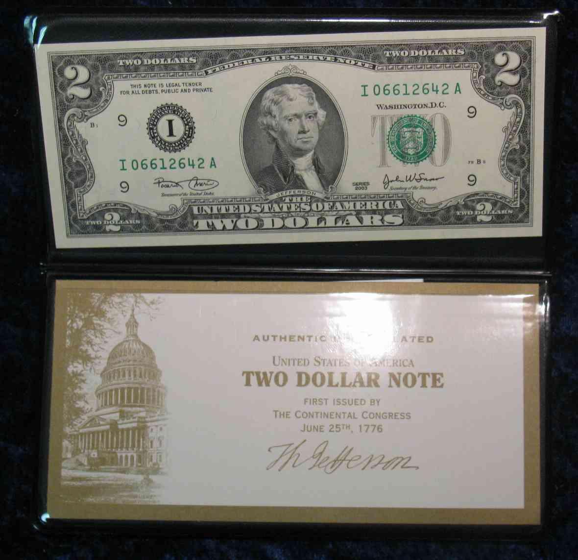 498. Series 2003 Crisp Unc $2 Federal Reserve Note in holder complete with certificate from the U.S. Monetary Exchange.