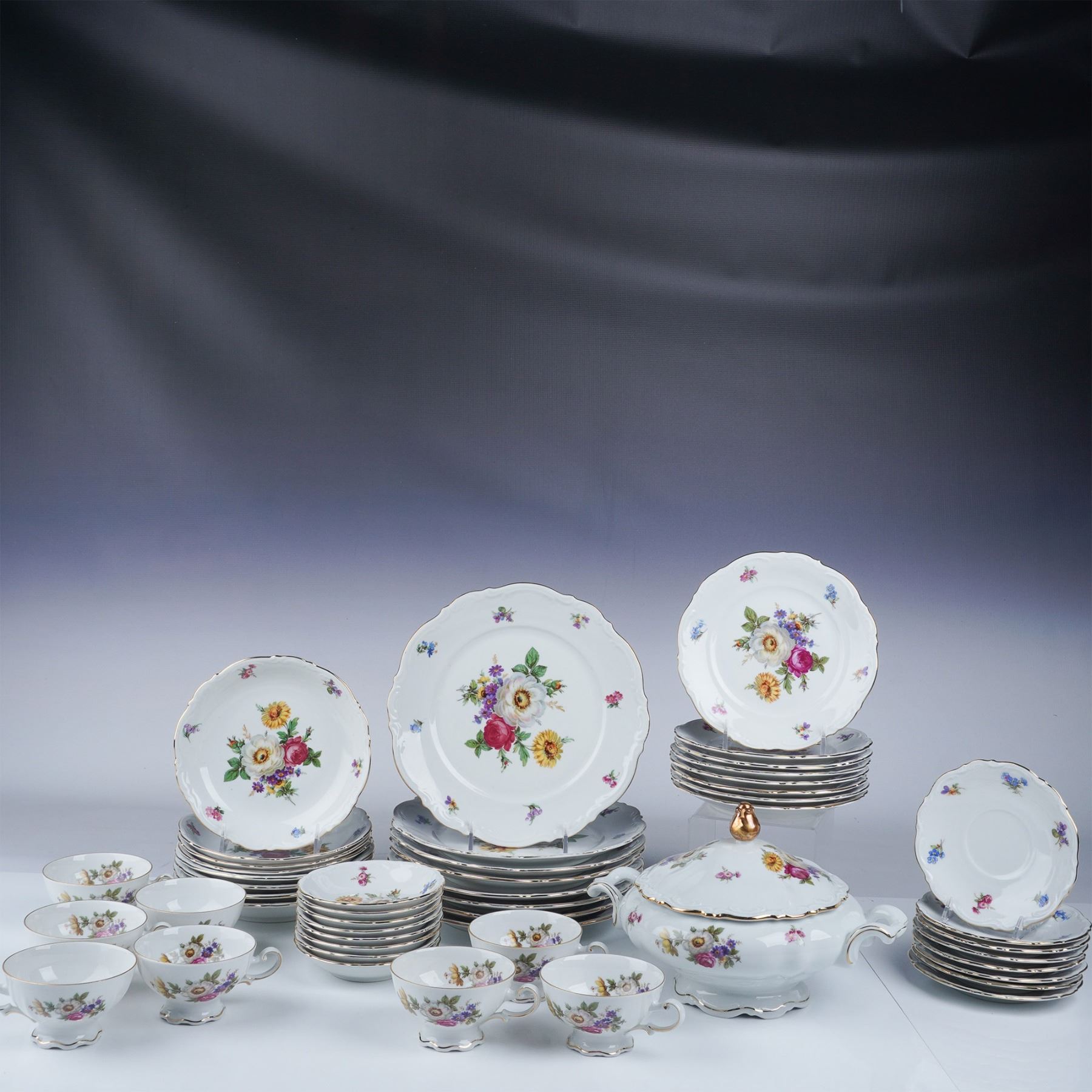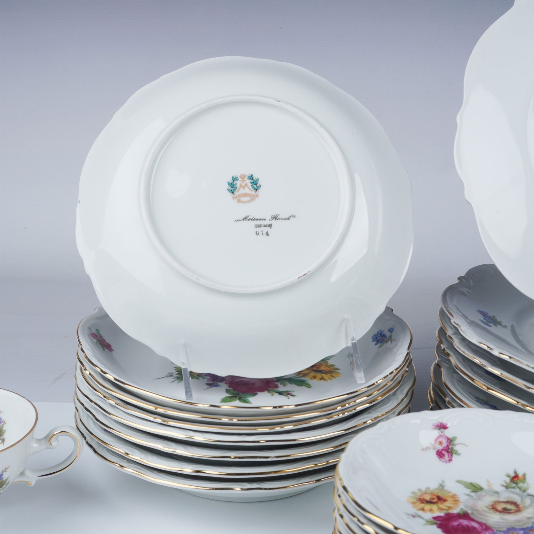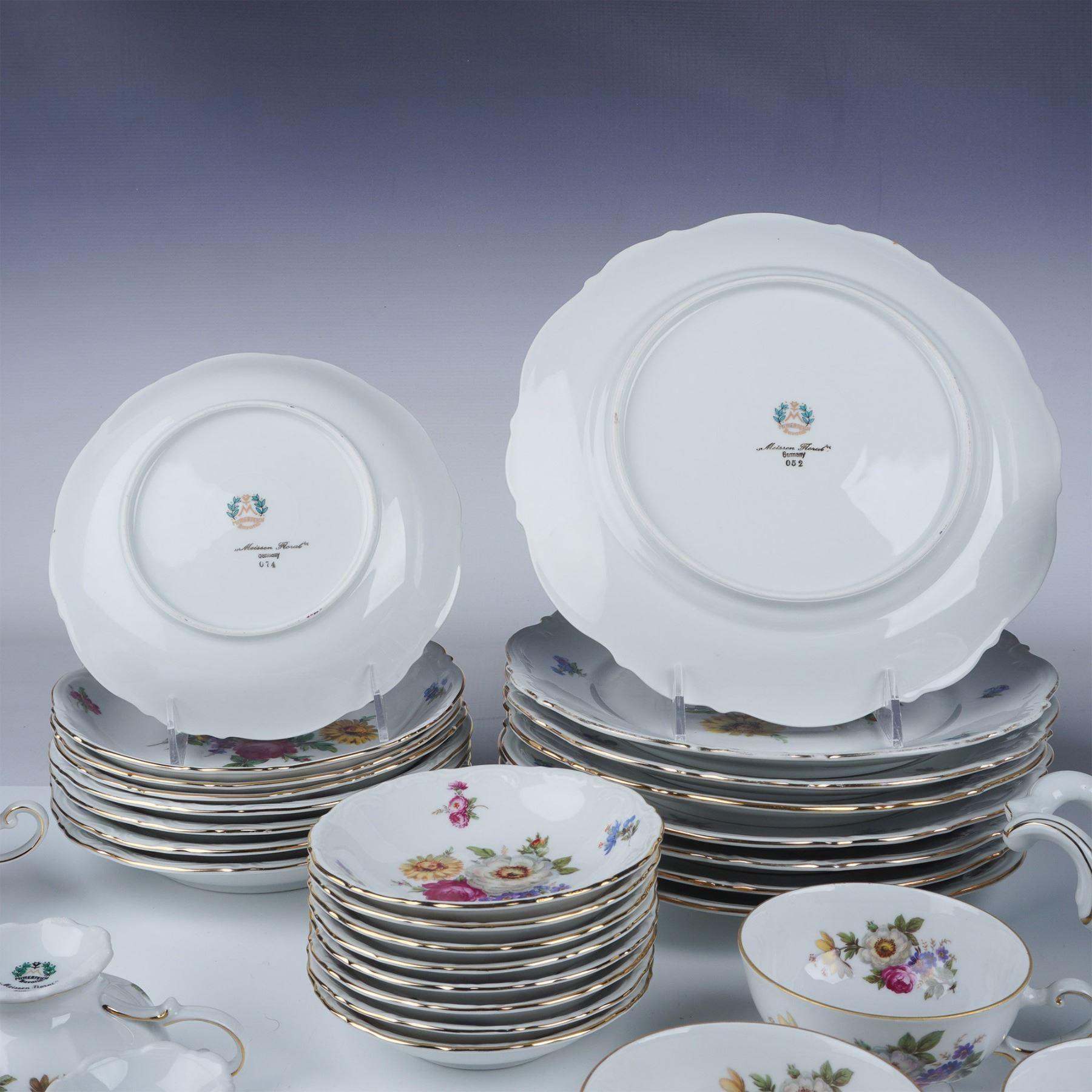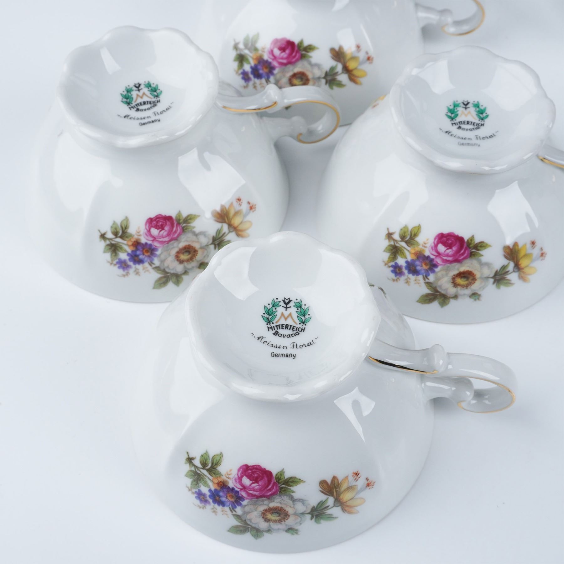 Elegant Mitterteich Meissen Floral 49-piece porcelain dinnerware set featuring delicate multicolor floral motifs with gold trim. The set includes 8 tea cups with saucers, 8 bread and butter plates, 8 coupe soup bowls, 8 dinner plates, 8 dessert bowls and 1 round covered vegetable dish. Crafted in Bavaria, Germany, this timeless collection showcases scalloped edges and intricate floral detailing. Marked on the base. Tea cup: 5"L x 4"W x 2.25"H. Saucer: 6" dia. Dessert bowl: 5.25" dia. Bread and butter plate: 7.75" dia. Coupe soup bowl: 7.75" dia. Dinner plate: 10.5" dia. Covered vegetable dish: 7"H.