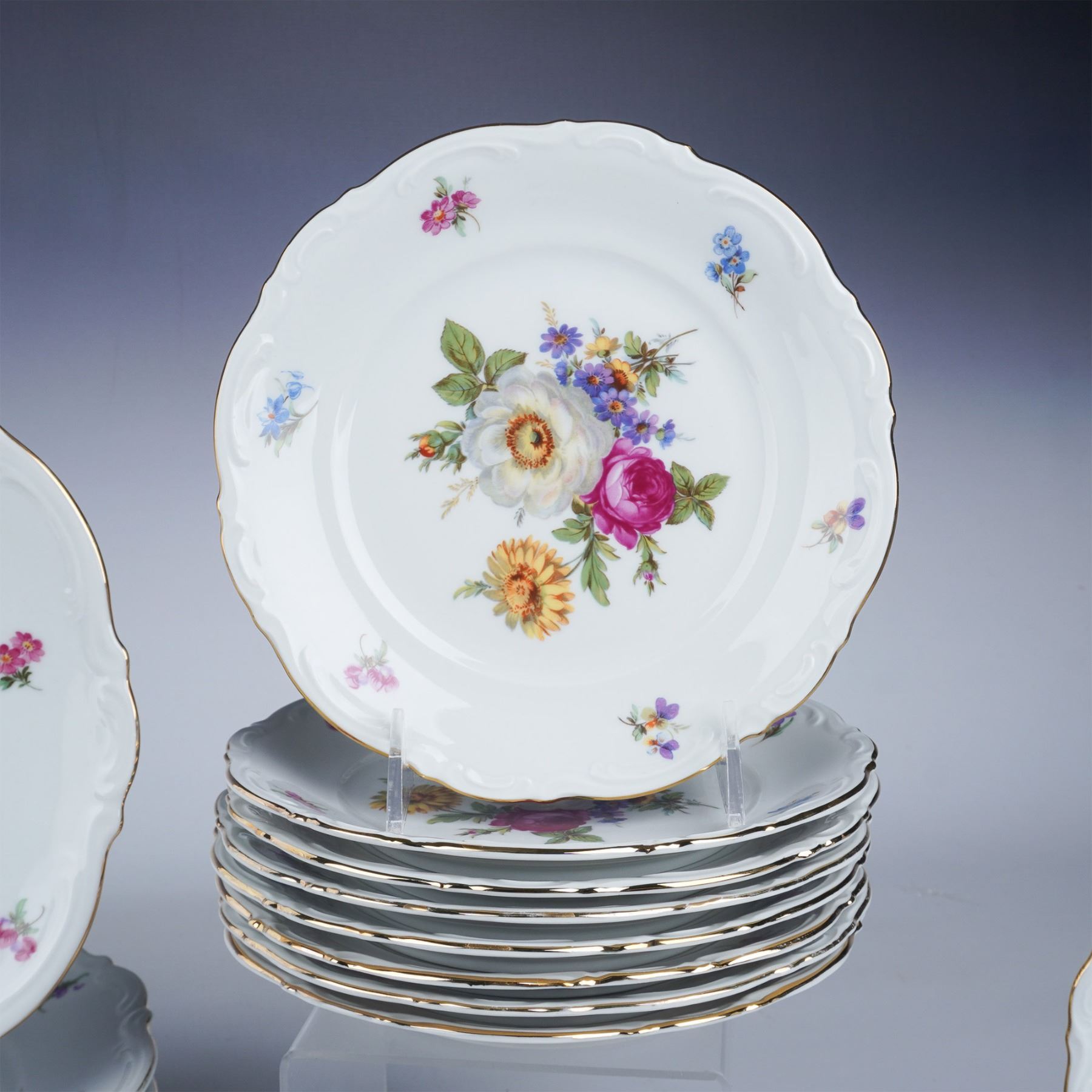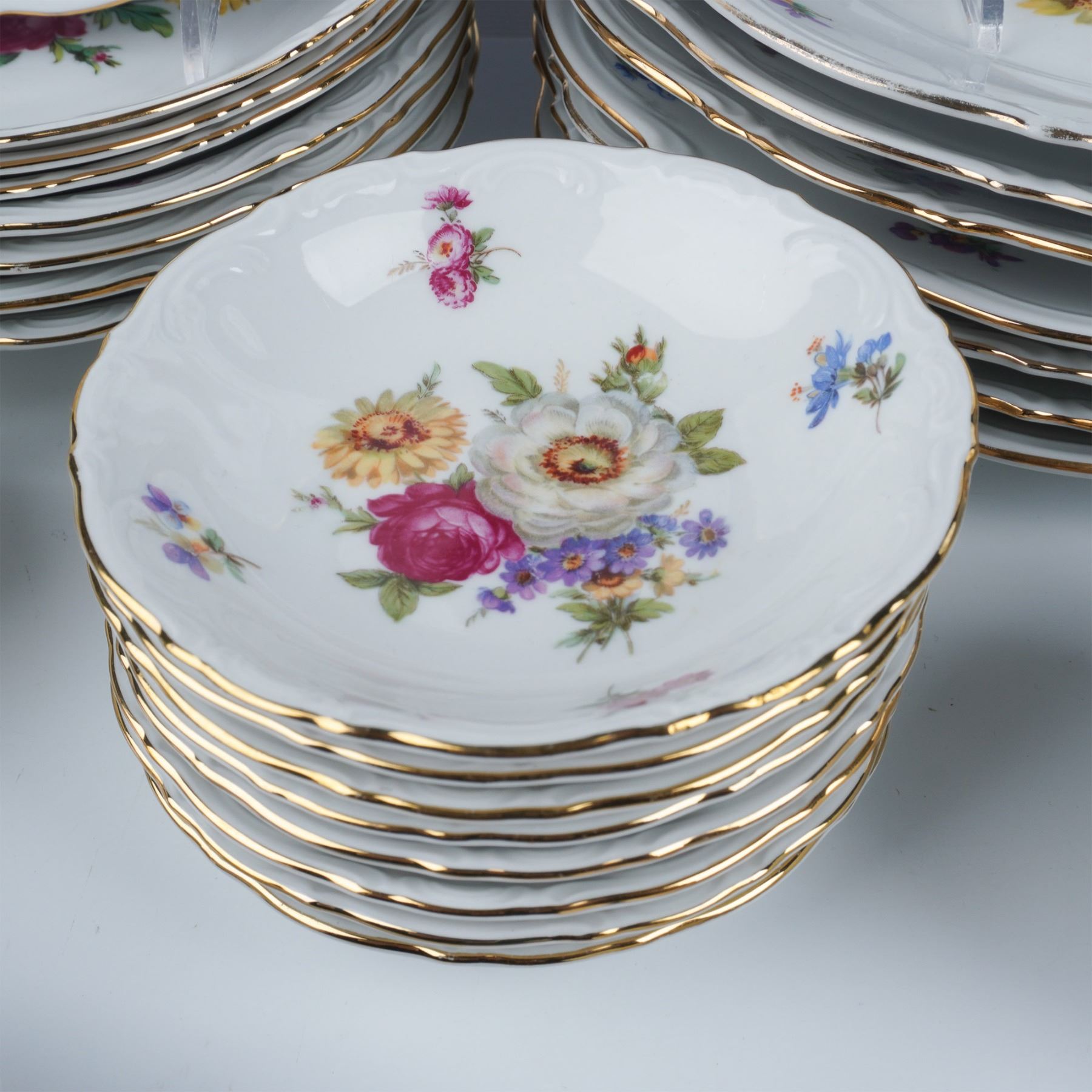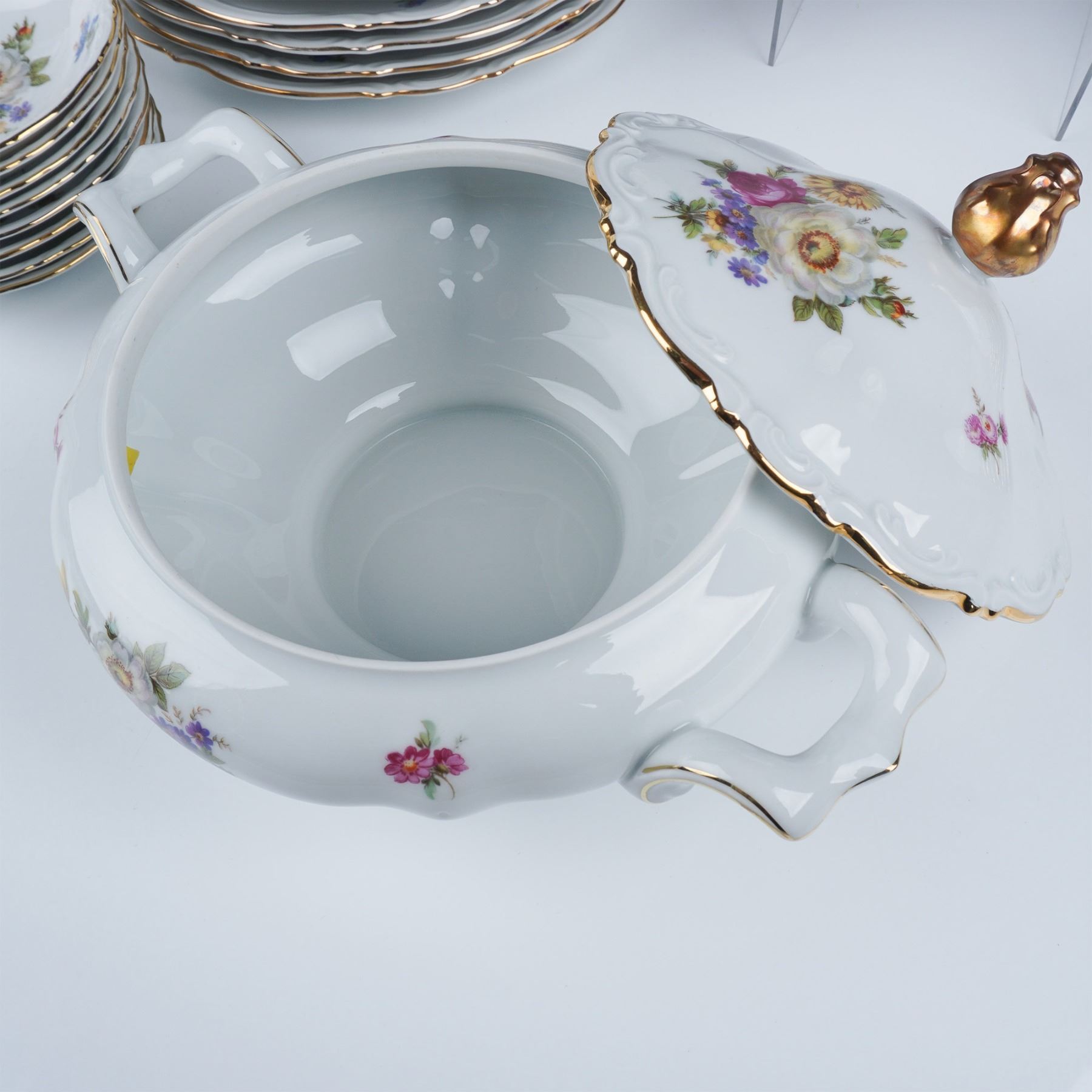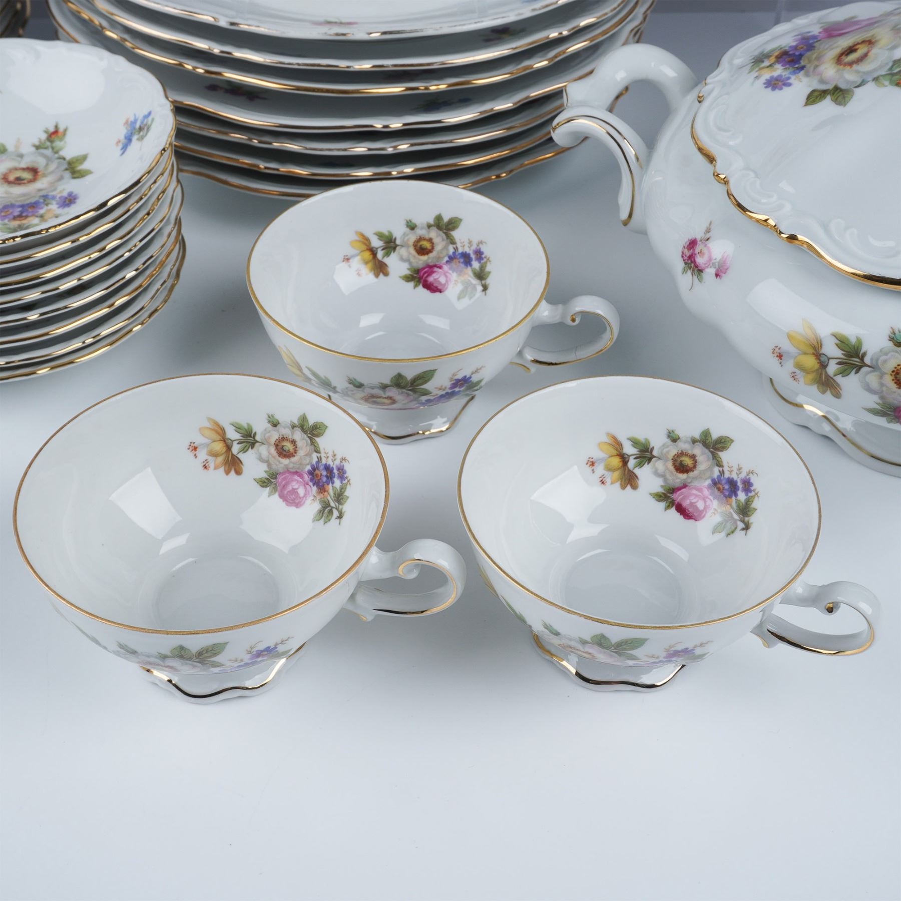 Elegant Mitterteich Meissen Floral 49-piece porcelain dinnerware set featuring delicate multicolor floral motifs with gold trim. The set includes 8 tea cups with saucers, 8 bread and butter plates, 8 coupe soup bowls, 8 dinner plates, 8 dessert bowls and 1 round covered vegetable dish. Crafted in Bavaria, Germany, this timeless collection showcases scalloped edges and intricate floral detailing. Marked on the base. Tea cup: 5"L x 4"W x 2.25"H. Saucer: 6" dia. Dessert bowl: 5.25" dia. Bread and butter plate: 7.75" dia. Coupe soup bowl: 7.75" dia. Dinner plate: 10.5" dia. Covered vegetable dish: 7"H.