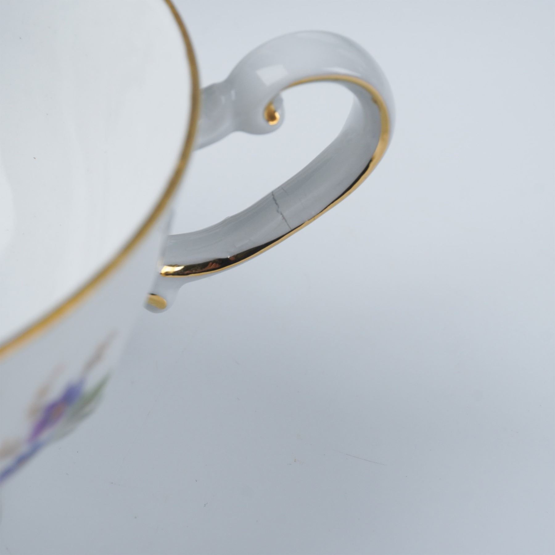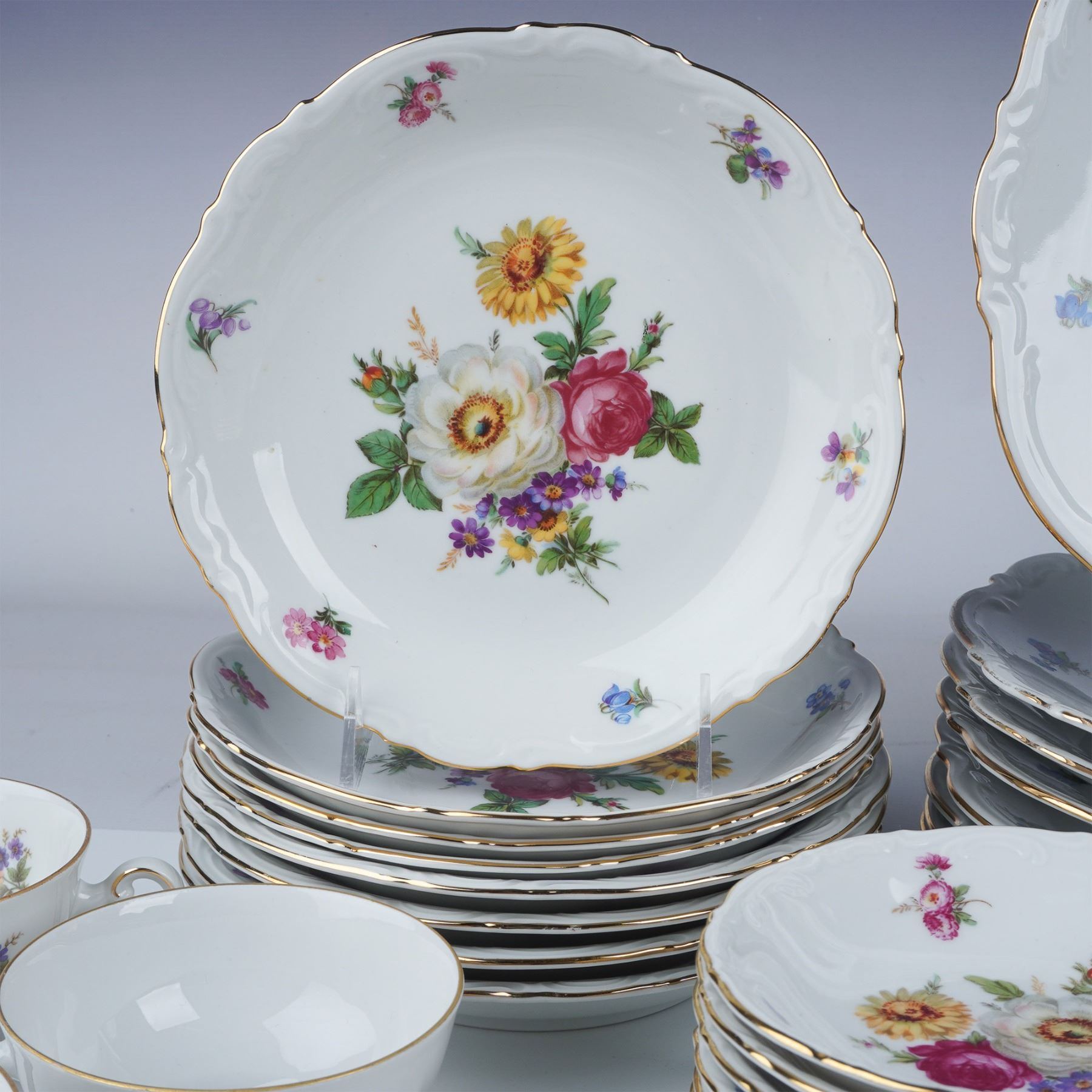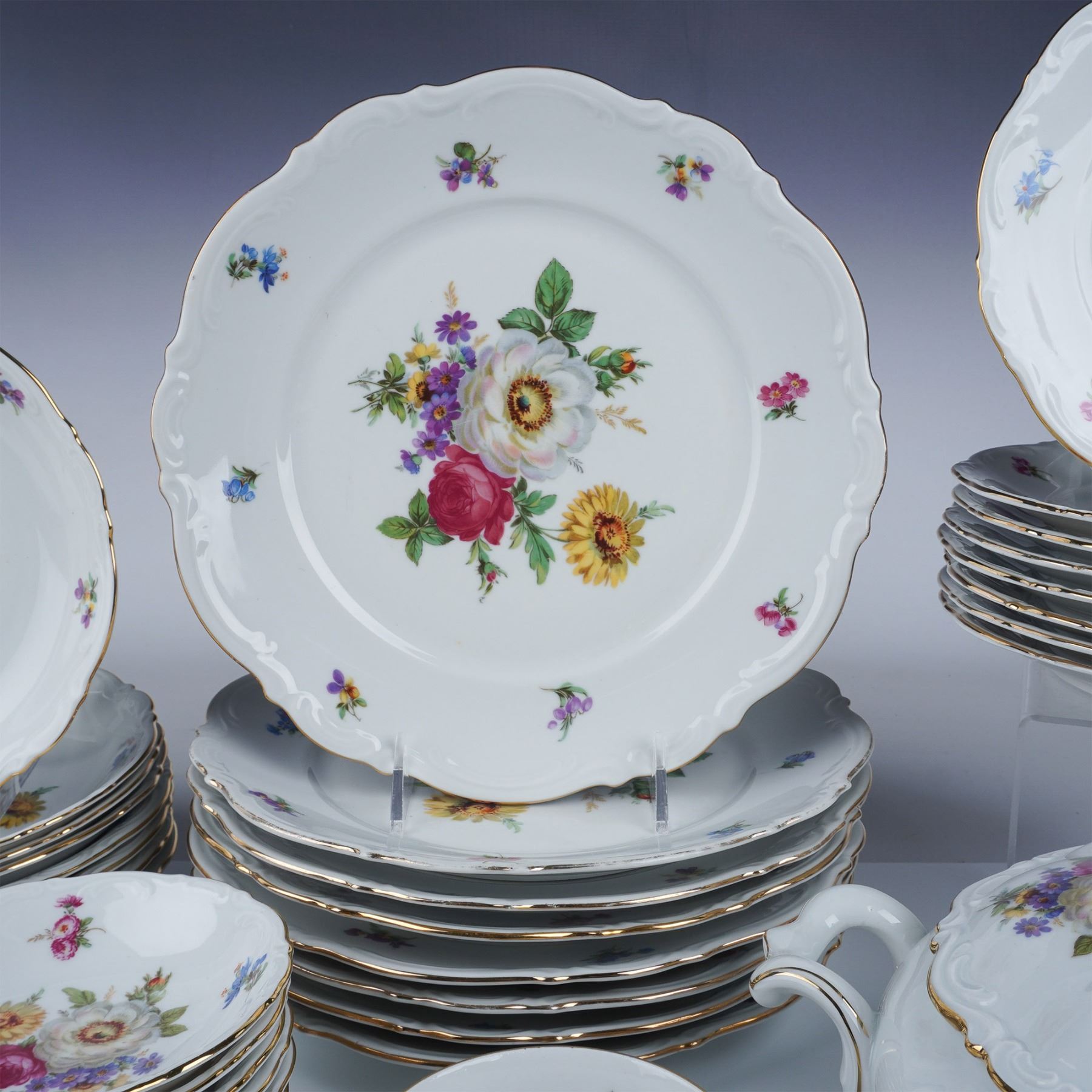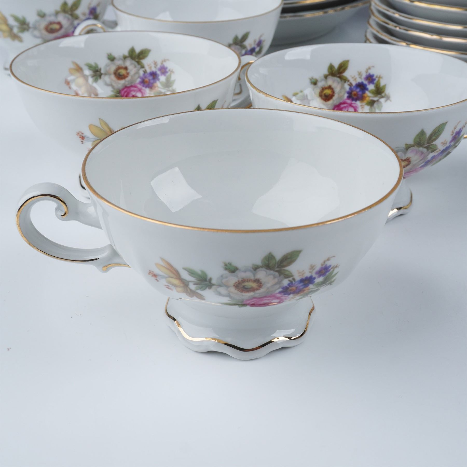 Elegant Mitterteich Meissen Floral 49-piece porcelain dinnerware set featuring delicate multicolor floral motifs with gold trim. The set includes 8 tea cups with saucers, 8 bread and butter plates, 8 coupe soup bowls, 8 dinner plates, 8 dessert bowls and 1 round covered vegetable dish. Crafted in Bavaria, Germany, this timeless collection showcases scalloped edges and intricate floral detailing. Marked on the base. Tea cup: 5"L x 4"W x 2.25"H. Saucer: 6" dia. Dessert bowl: 5.25" dia. Bread and butter plate: 7.75" dia. Coupe soup bowl: 7.75" dia. Dinner plate: 10.5" dia. Covered vegetable dish: 7"H.