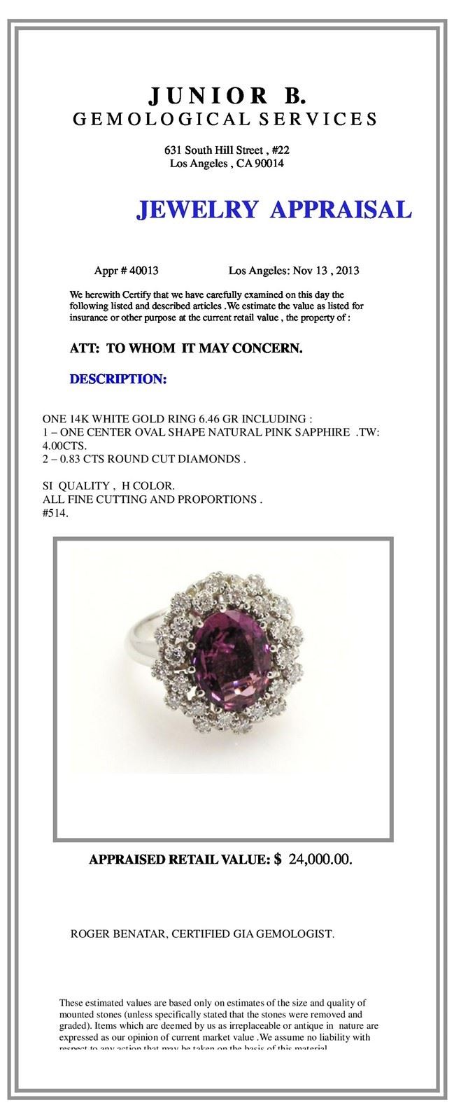 14K WHITE GOLD CEYLON NATURAL PURPLE SAPPHIRE RING:6.46 GRAMS/DIAMOND:0.83CT/NATURAL PURPLE SAPPHIRE:4.00CT/#GVR1037 **Sapphire is known to stimulate psychic visions, extrasensory perception and one's sense of inner knowing. Crafted in 14k white gold, this dazzling 4.00ct oval shape Natural Pink Sapphire casts its intoxicating power. A sparkling 0.83ct round cut diamond surround adds a touch of subtle sparkle lending this cocktail ring a bouquet of stately beauty.**