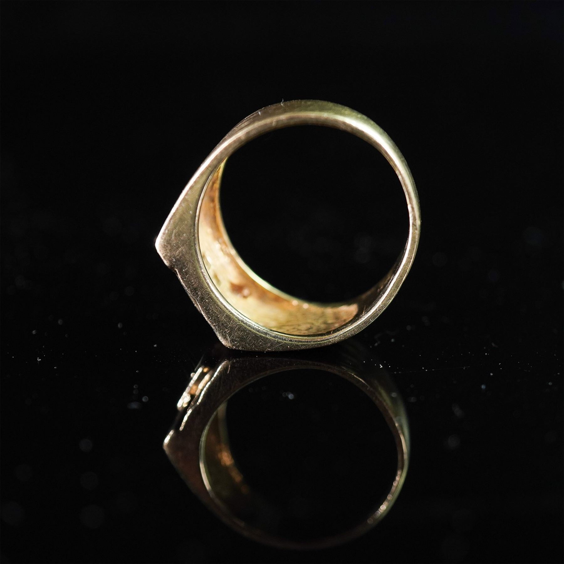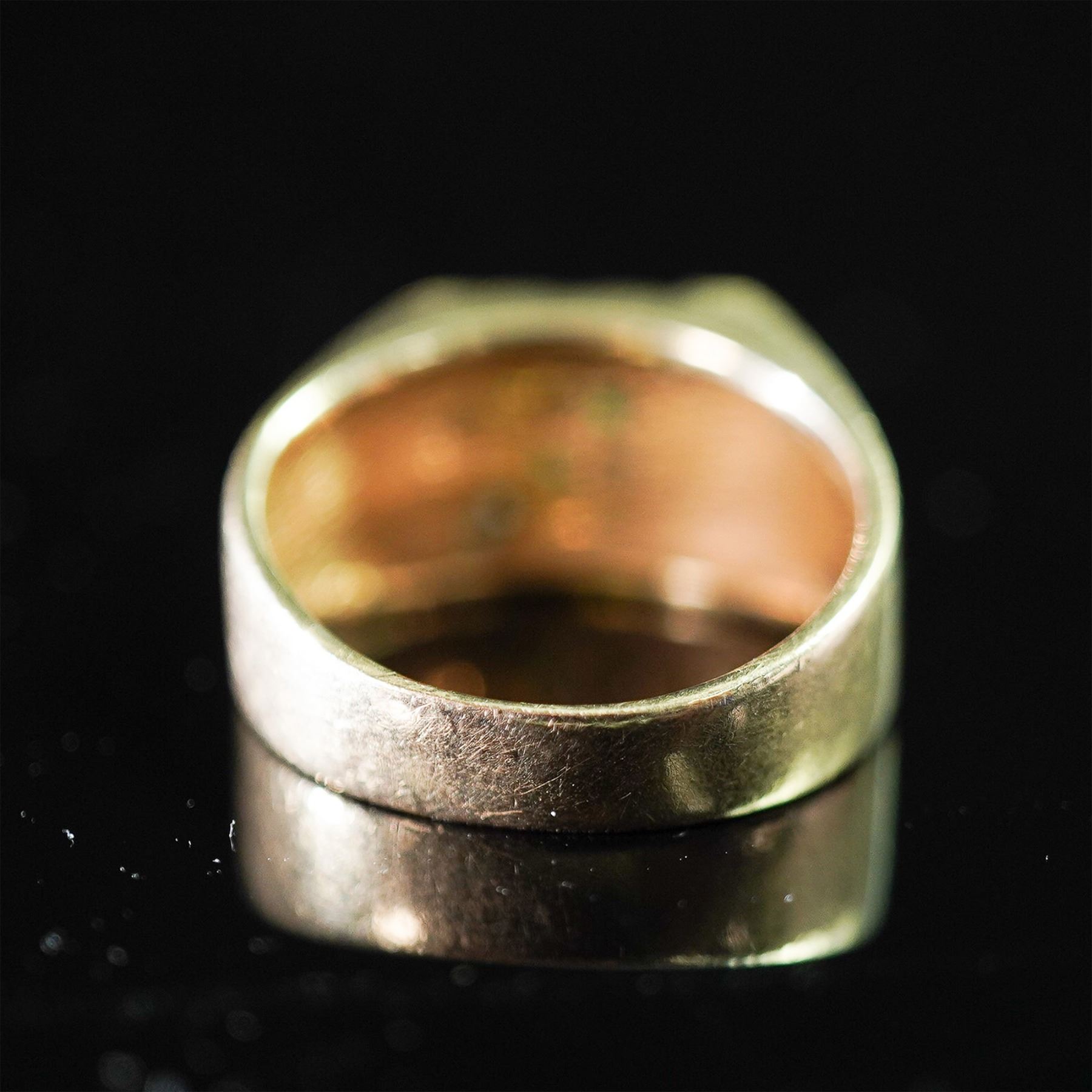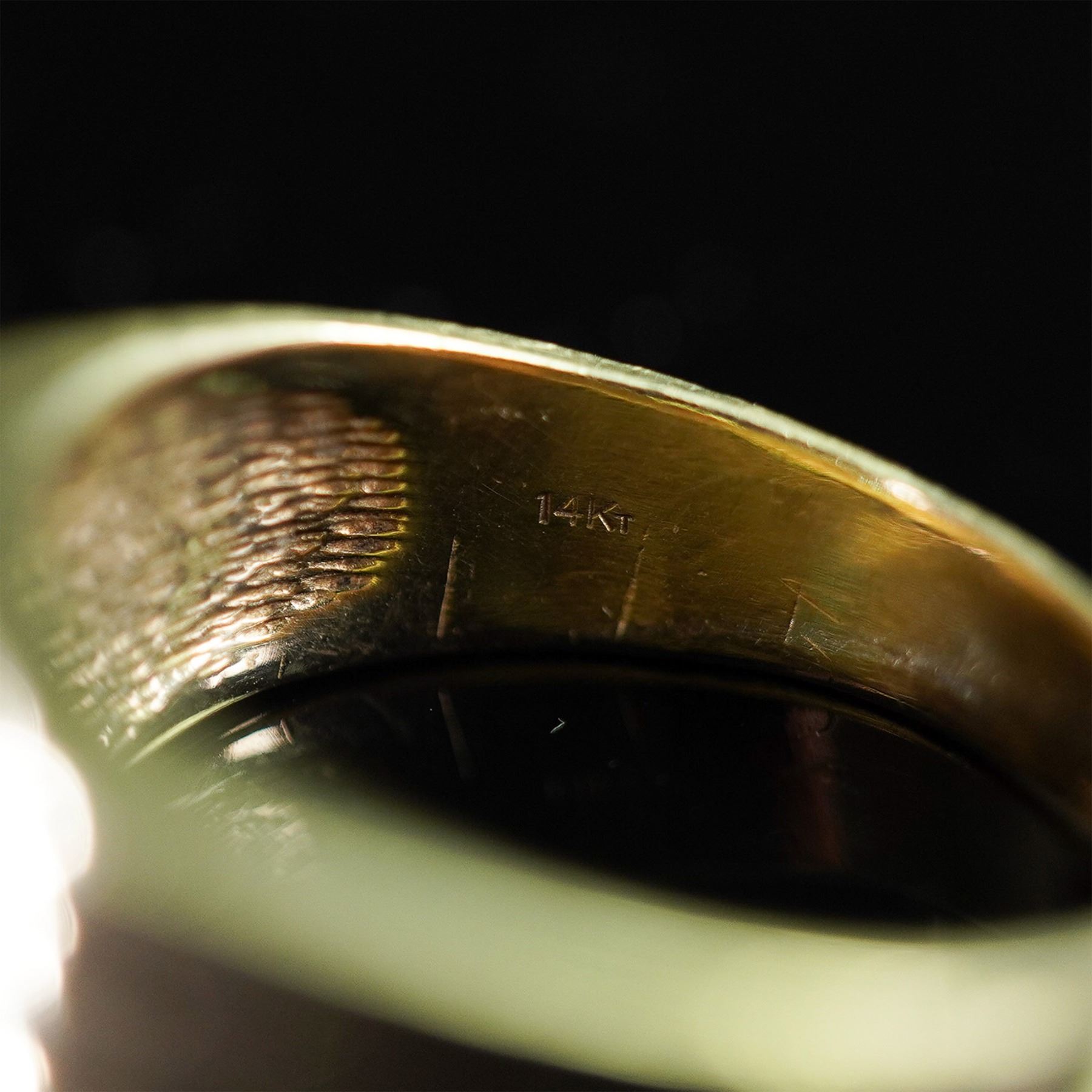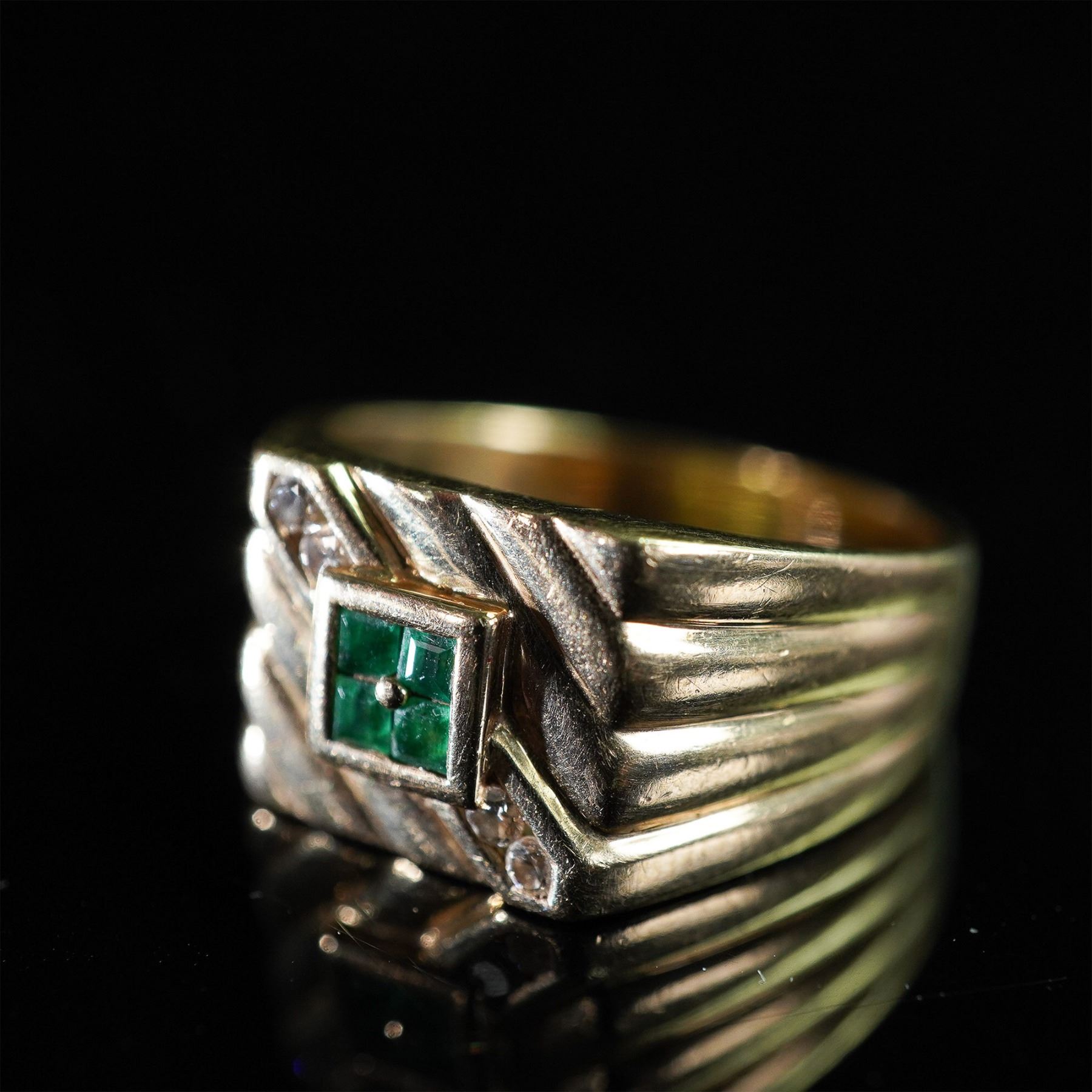 A striking vintage men's ring in solid 14K yellow gold, showcasing exceptional design and a confident presence. This distinctive piece features a square bezel at center, housing four invisibly-set square-cut emeralds arranged in a seamless grid. The emeralds display a rich green hue and are set flush to one another without visible prongs or bezels—a sophisticated technique that enhances their visual impact and reflects advanced craftsmanship. Framing the emeralds are four round brilliant-cut diamonds, two on each side, set diagonally along the chevron-patterned grooves that carve across the face of the band. These diamonds add just the right touch of sparkle, providing elegant contrast to the saturated green of the emeralds and the buttery warmth of the gold. The ring itself is bold in form, with a tiered, ribbed design that wraps around the band in a continuous chevron texture. The pattern evokes architectural elements and adds depth and movement to the piece. With a substantial weight of 7.75 grams and a comfortable size 9.25, the ring is designed for wearability while making a strong visual statement. Likely produced in the late 1980s to early 1990s, this ring reflects the era's affinity for sculptural forms and invisible gemstone settings. Metal: 14K yellow gold Total Weight: 7.75 grams Gemstones: 4 square-cut emeralds (~0.25-0.30 ctw), 4 round diamonds (~0.06 ctw) Ring Size: 9.25 Era: Circa 1980s-1990s