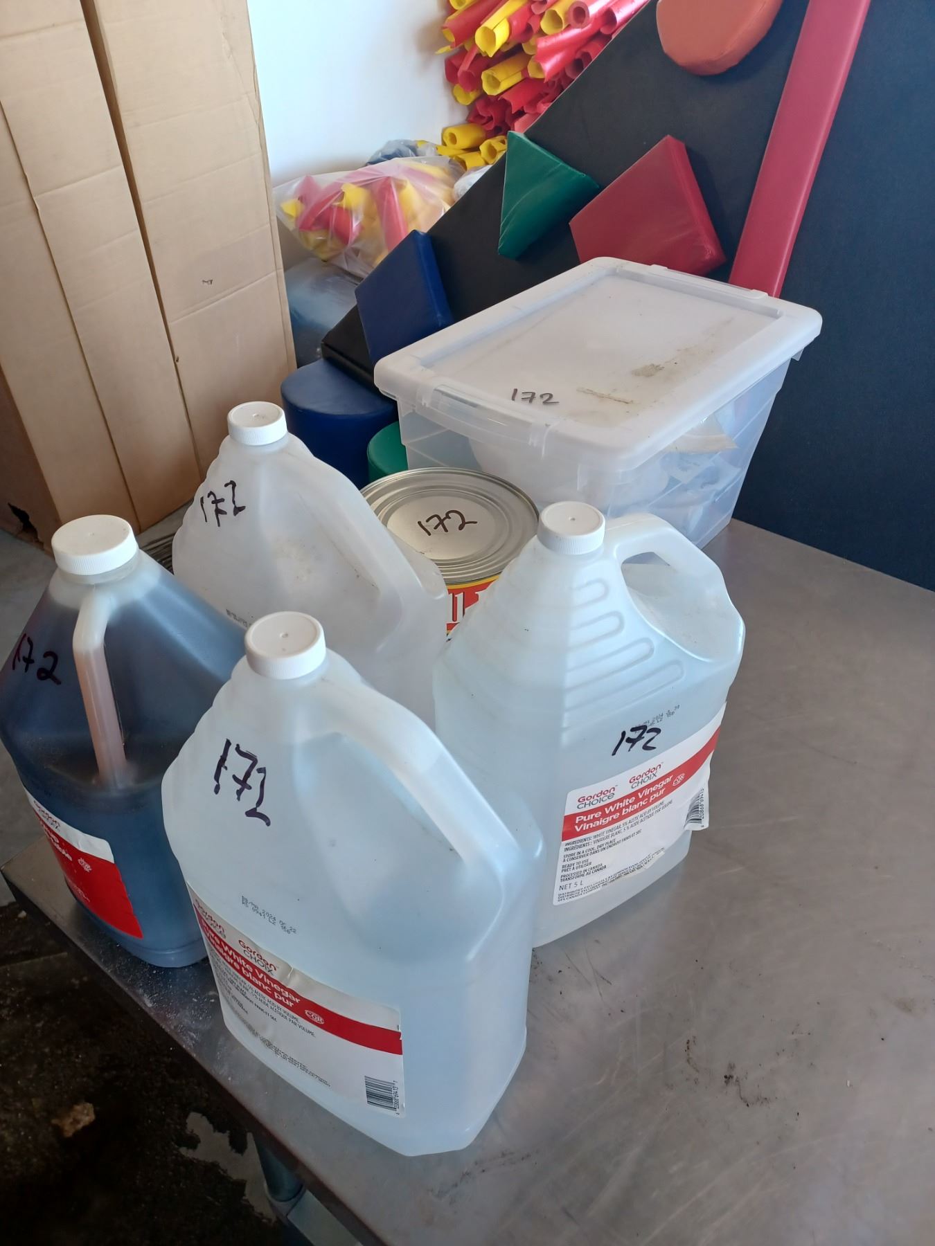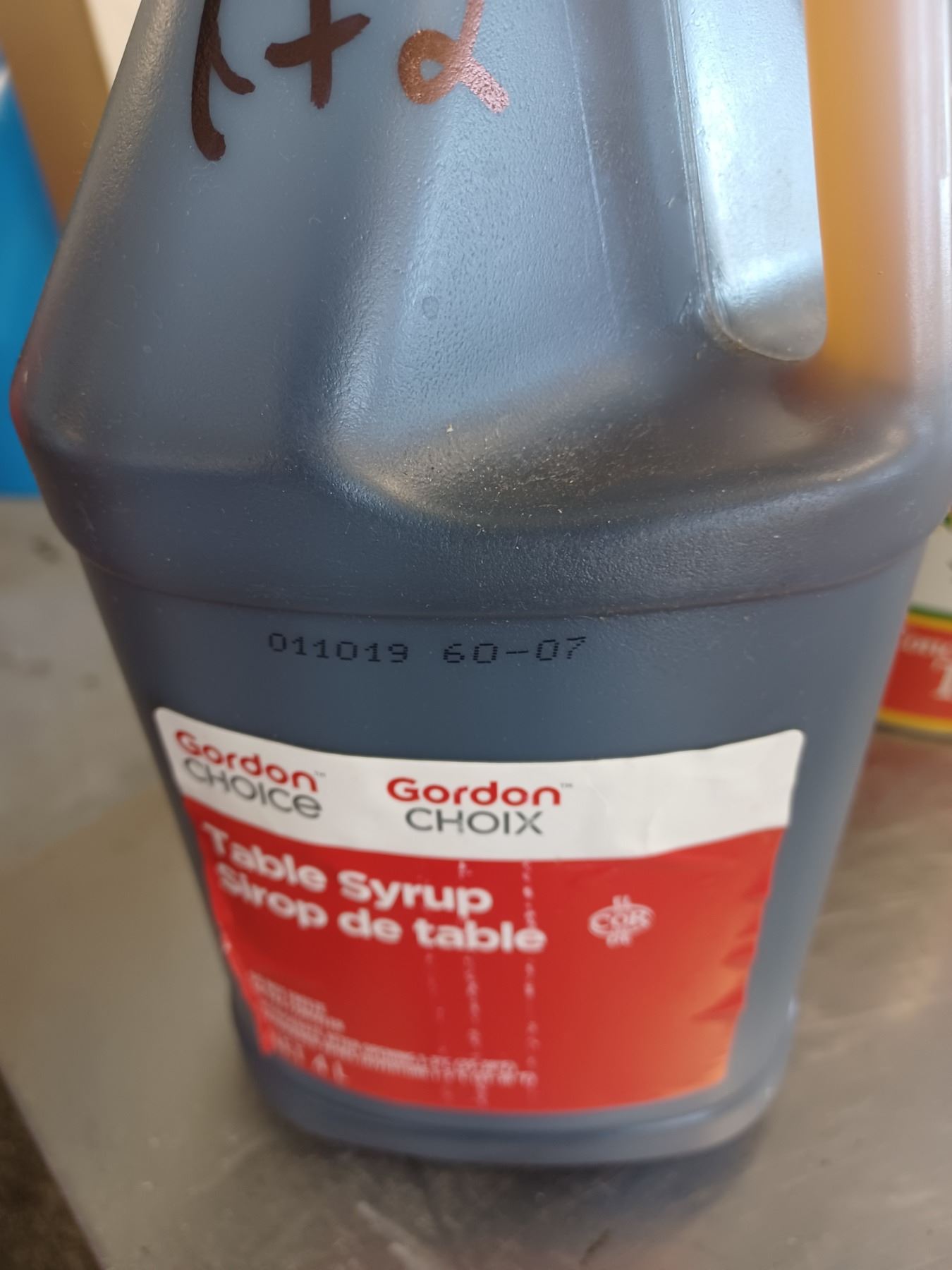 4L TABLE SYRUP; 11L - WHITE VINEGAR; 2L CRUSHED TOMATOES; TOTE of POUTINE MIX (SEE PHOTOS.)