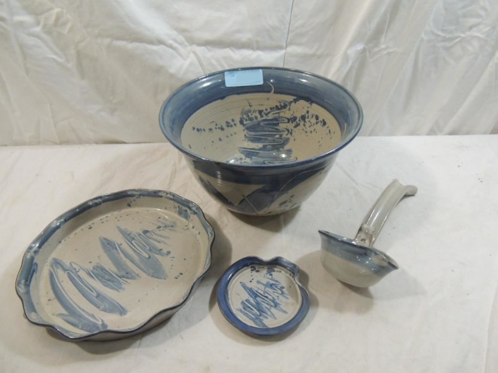 SIGNED POTTERY, DECORATIVE STONEWARE POTTERY BOWL, PLATE, SPOON REST AND LADDLE, BLUE AND GRAY COLOR, DECORATIVE, UNQIUE, CUSTOME AS SHOWN SEE PHOTO FOR MORE DETAILS.