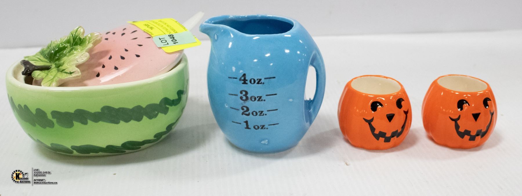 BOWL/ PUMPKIN TOOTHPICK HOLDERS & BLUE LIQUID MEASURE